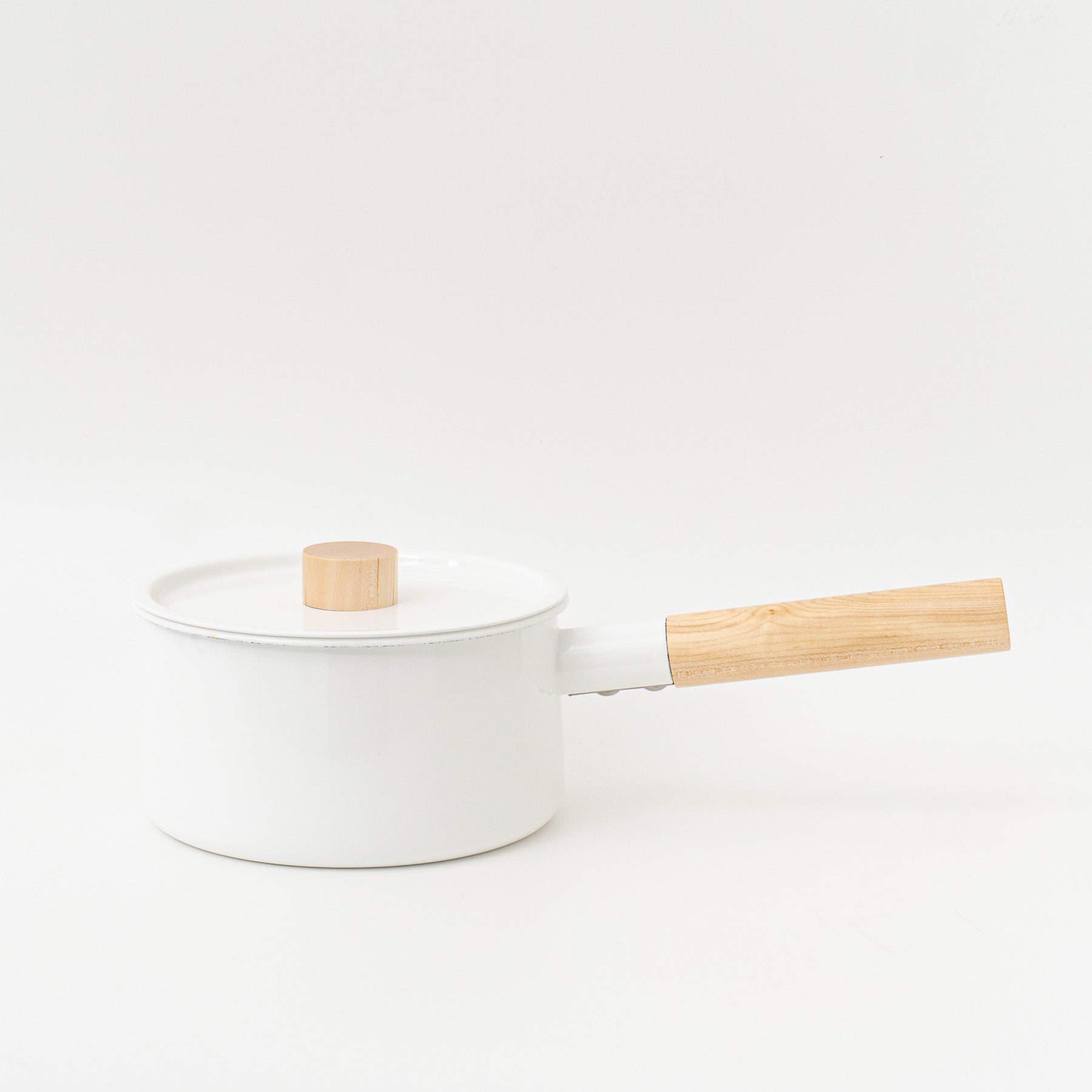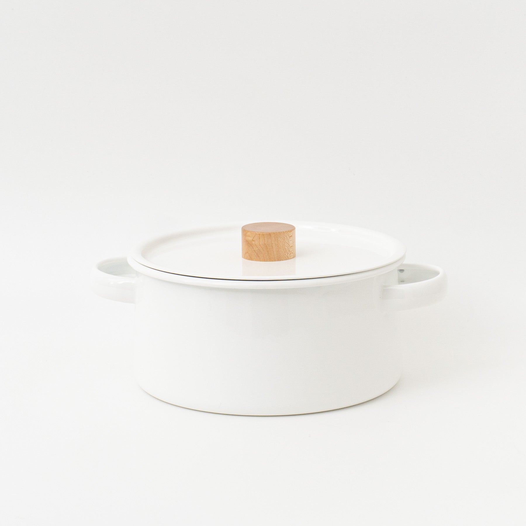 白くなめらかな琺瑯と、天然木のハンドルの組み合わせが印象的で、暮らしに自然と溶け込む美しさと機能性を兼ね備えています。