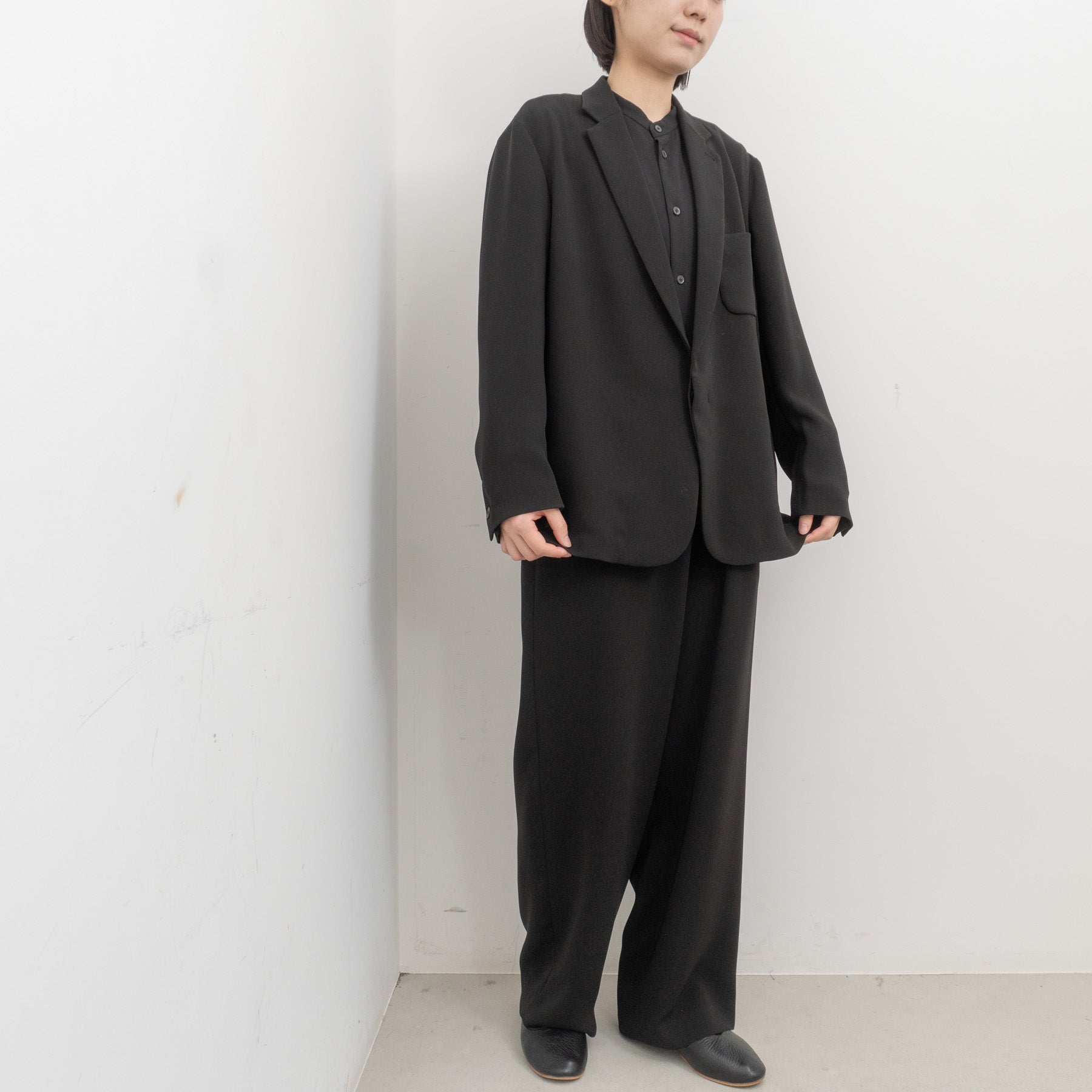 生地は、伸縮性があり、ストンとした落ち感がきれいな質感です。裏地なしの軽い着心地で、通年で着用できます。