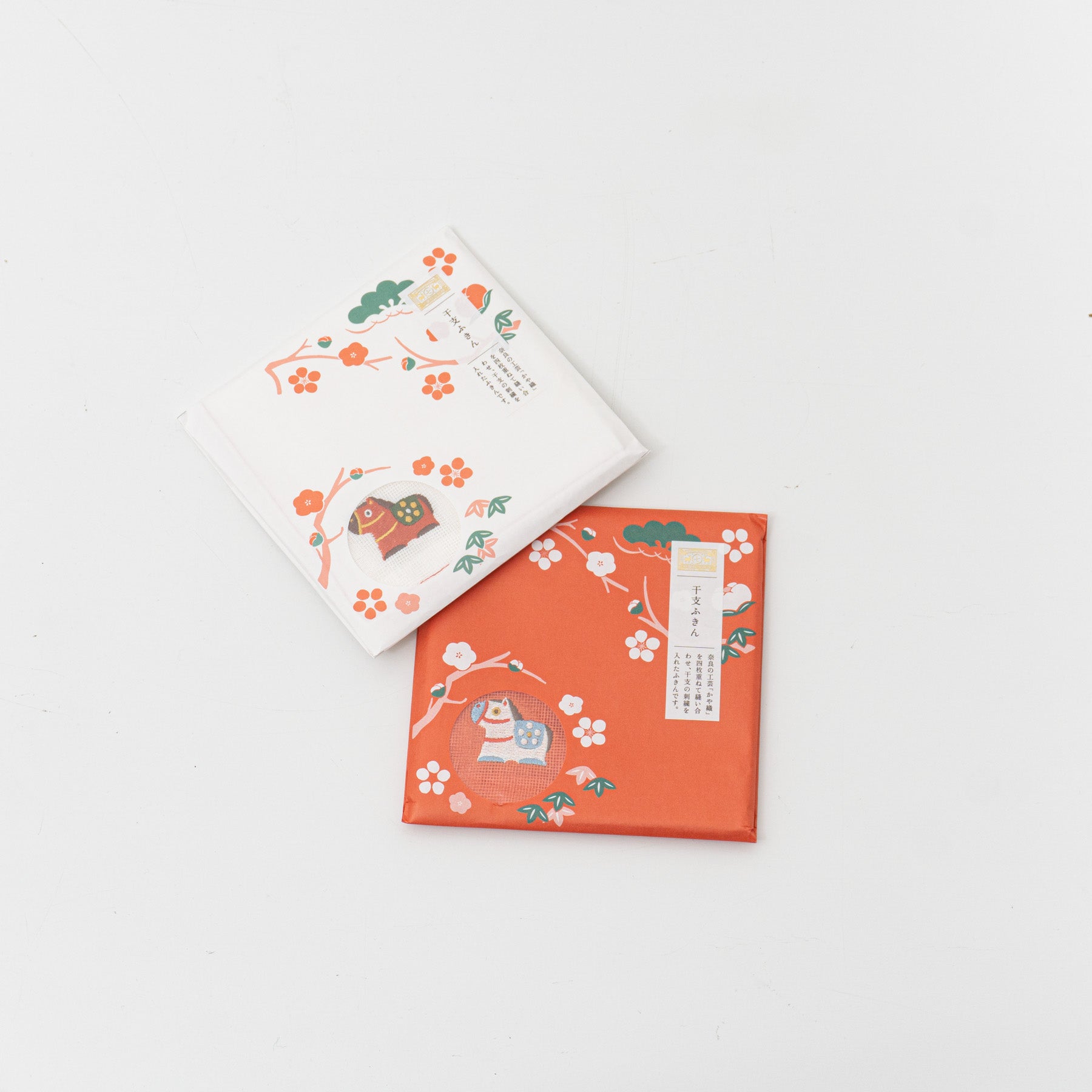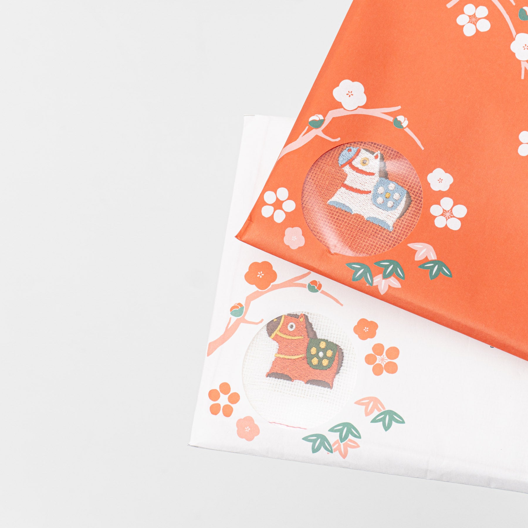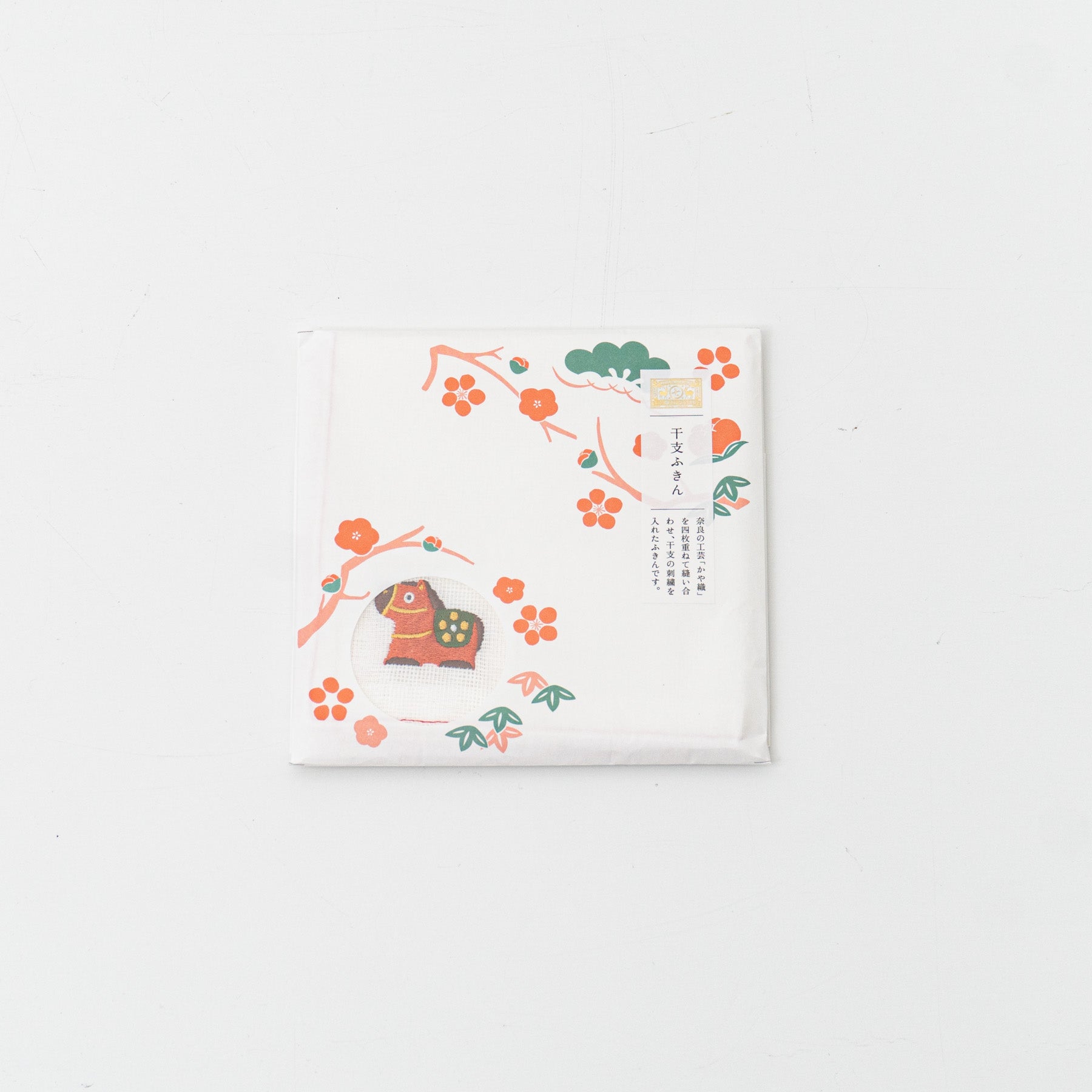 干支の刺繍が入った、正方形の小さなふきん。ウマをモチーフにした郷土玩具の絵柄を刺繍しました。