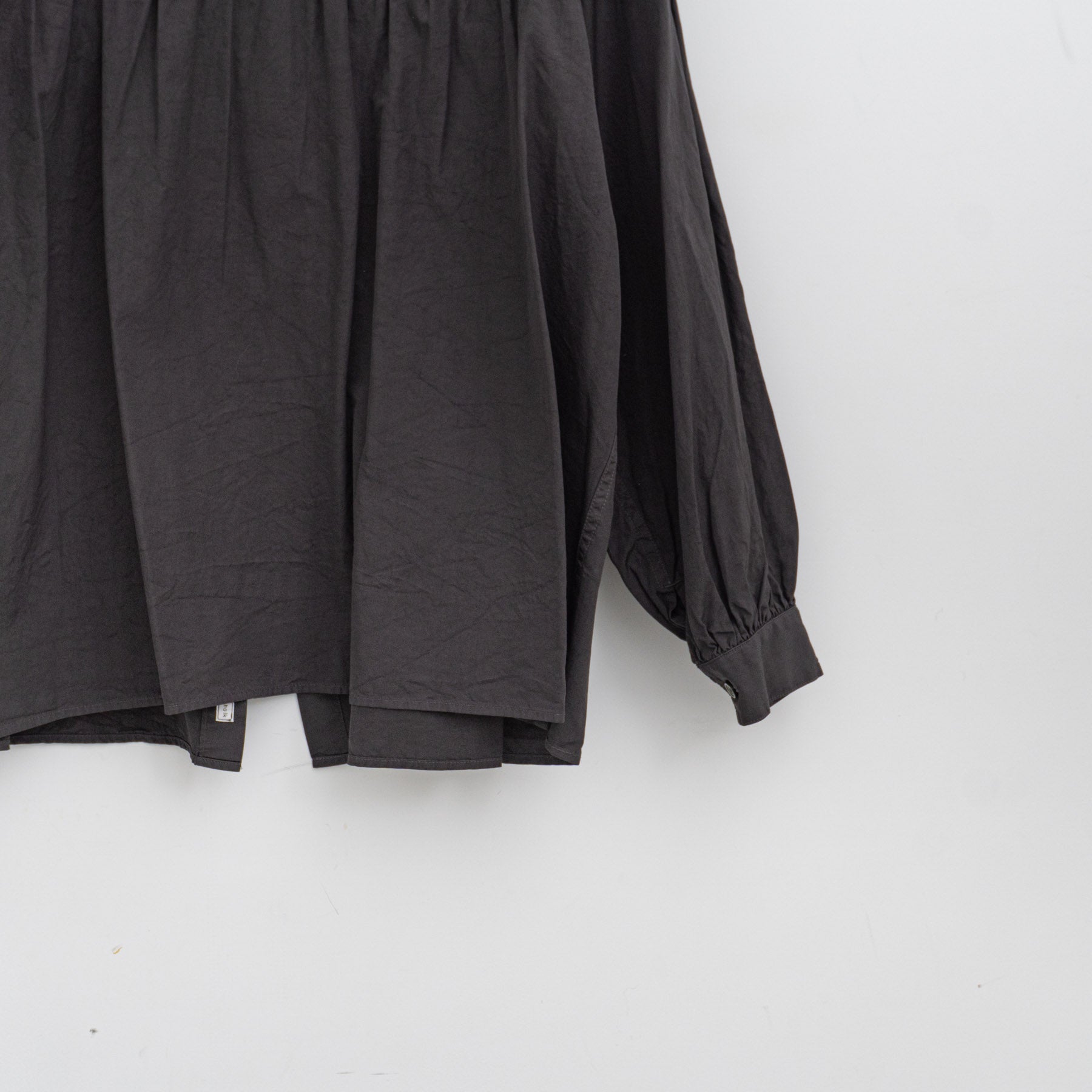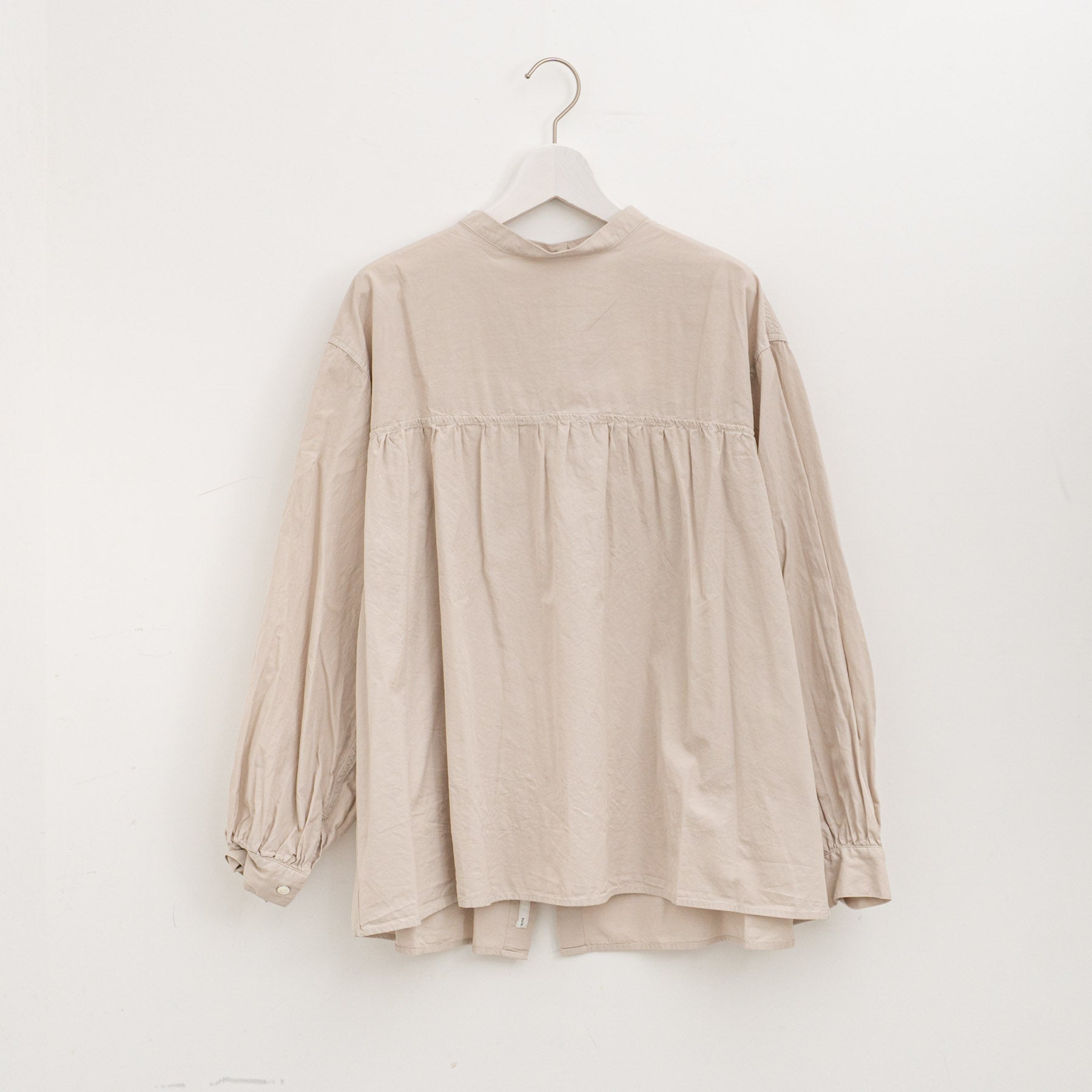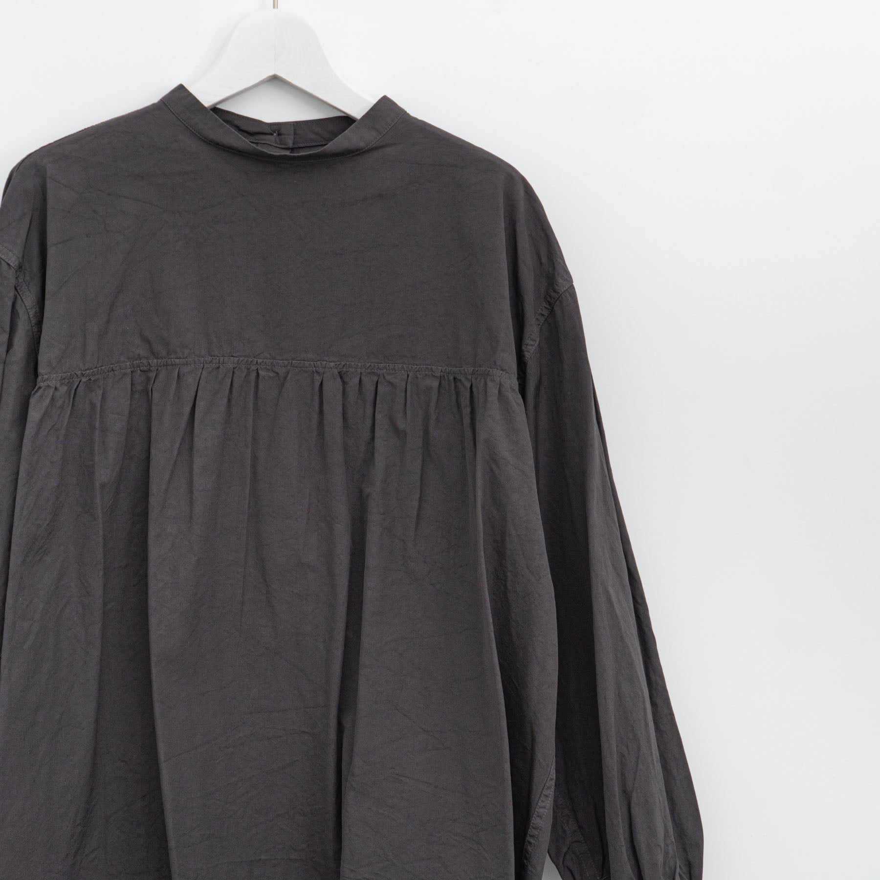 光沢のあるブロードを製品加工で縮めることでさらに高密度にしペーパーライクな風合いに。加工を施してから製品過去をを行うため、1枚ごとに異なるムラのある色味や風合いが特徴。