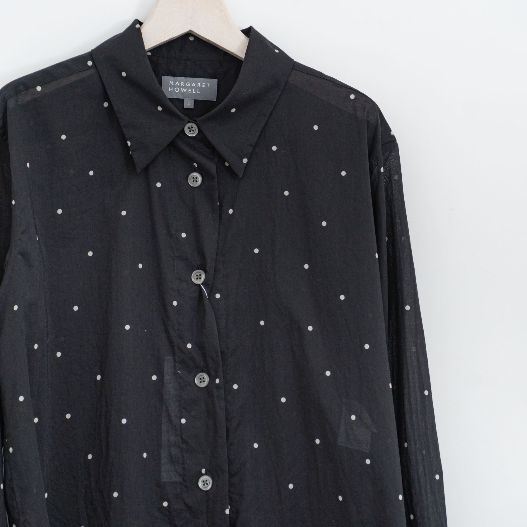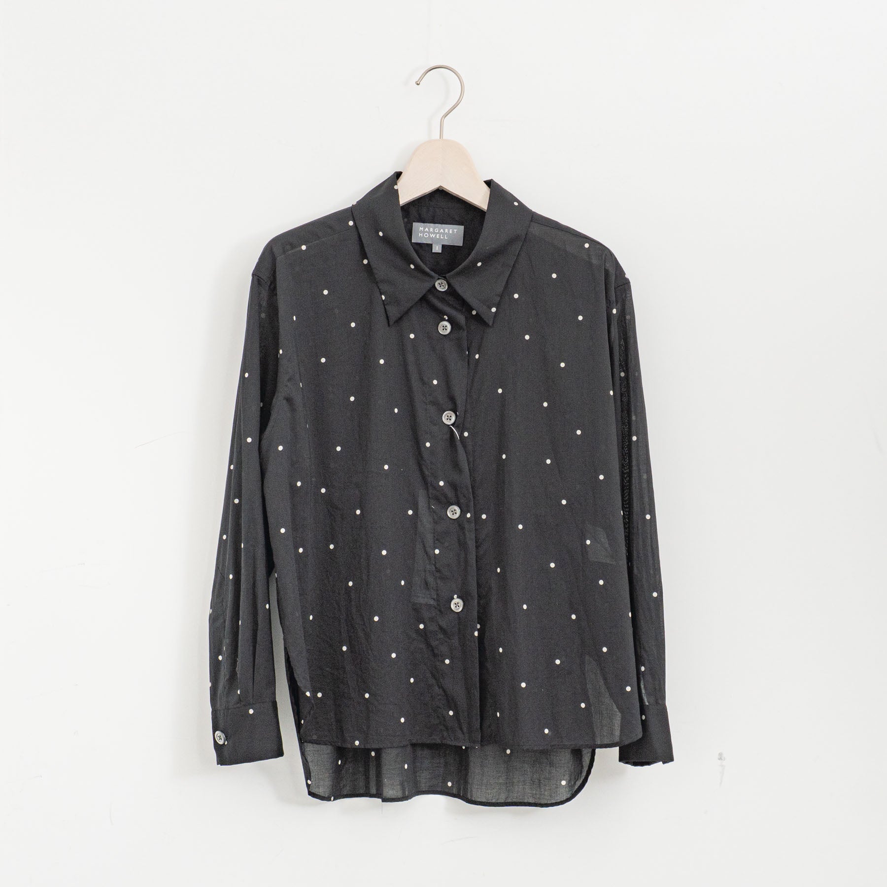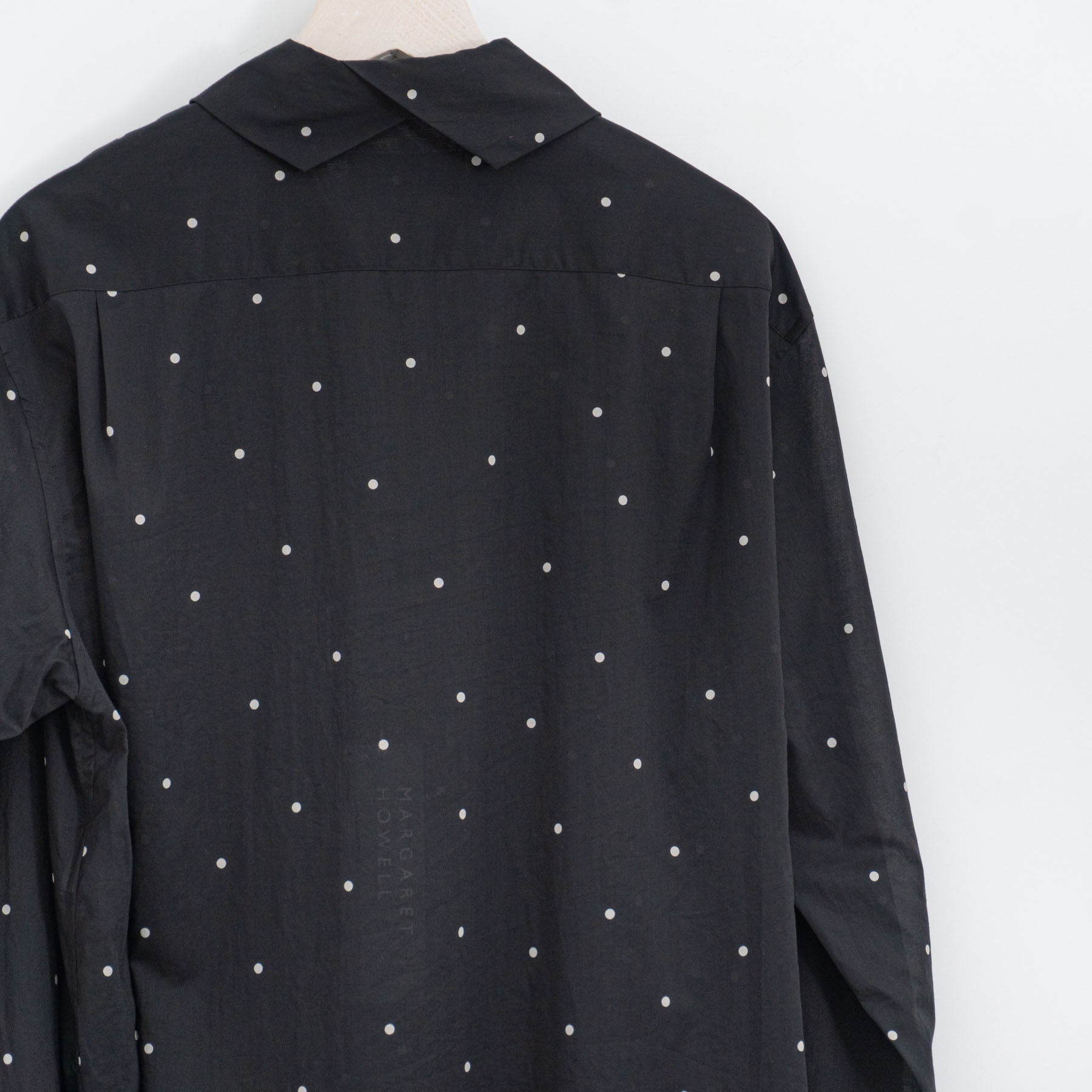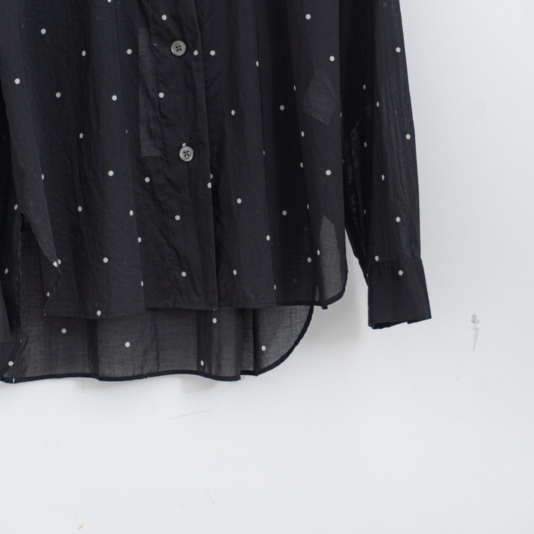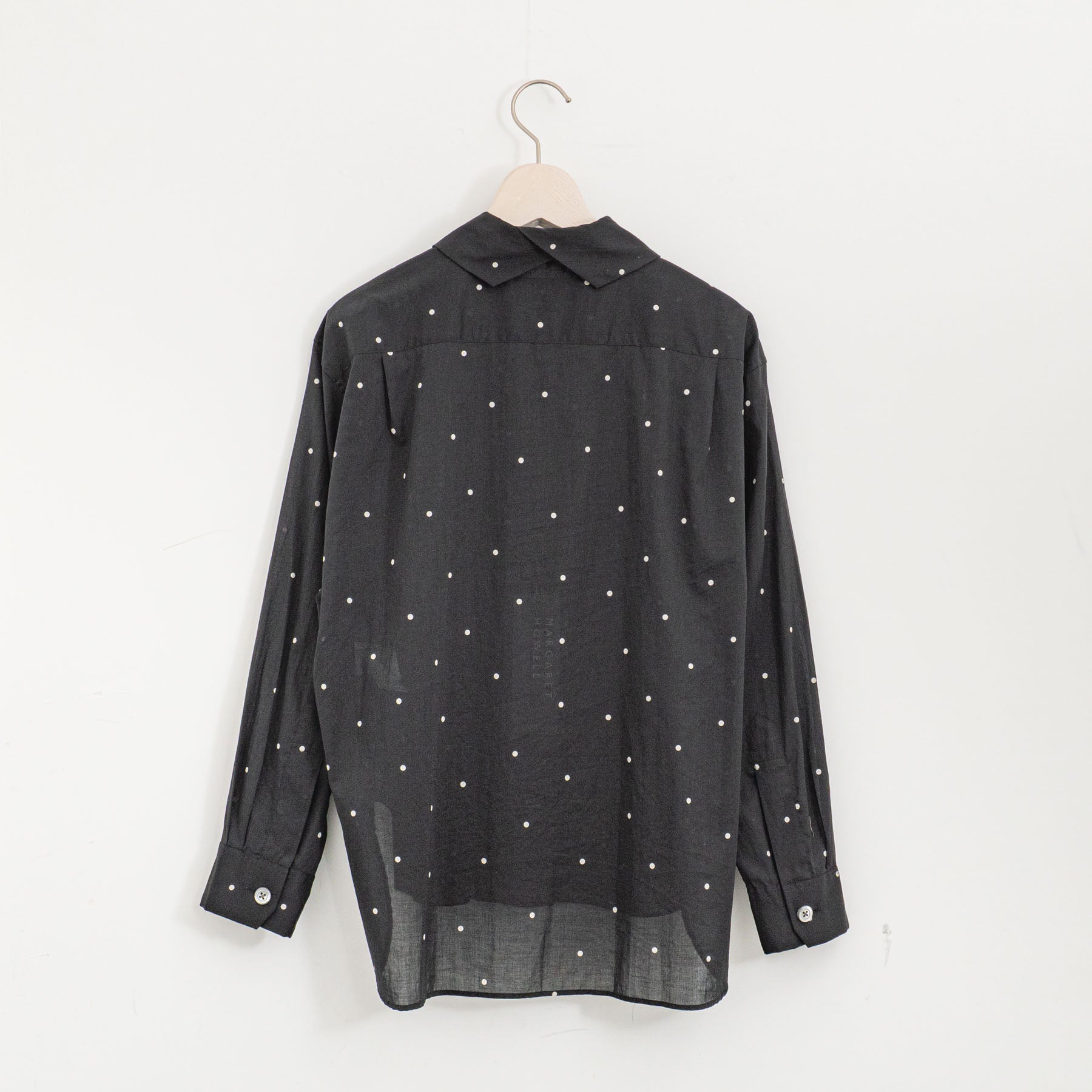 透け感のあるコットンポプリン素材に、1850年代に流行した均等な小さな水玉模様をプリントしたシャツ。変則的な配置によって、抜け感のある表情を引き立てるデザイン。 レギュラーフィットをベースに、やや長めの着丈と後ろ襟を重ねたディテールでアクセントを加えたデザイン。ウエストインはもちろん、裾を出したスタイリングでも映えるシルエット。