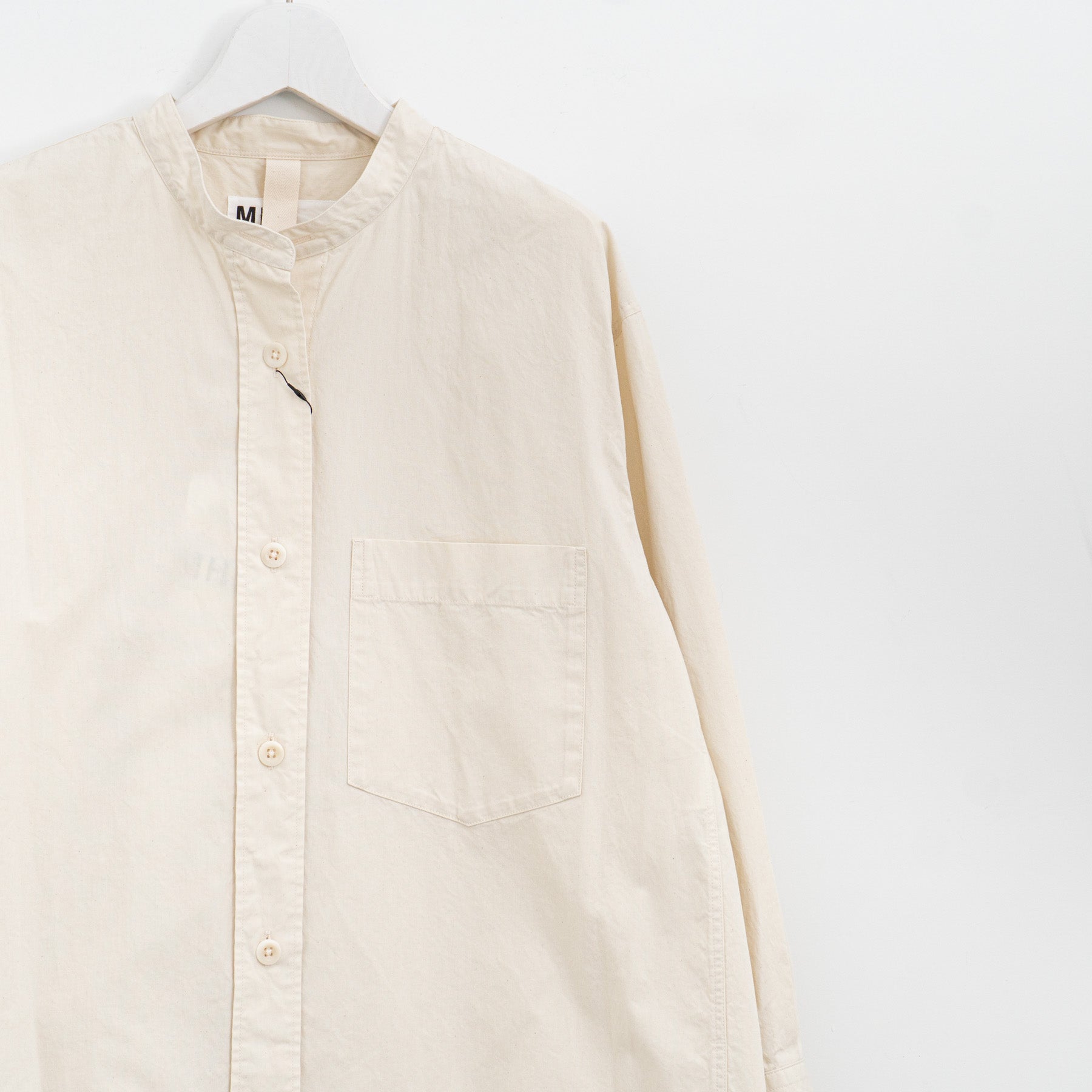 ナチュラルな表情を残したコットン糸と、染色糸を組み合わせて織り上げたシャツ素材のカラーレスシャツ。温かみのある色合いと、しっとりとした質感が特長。