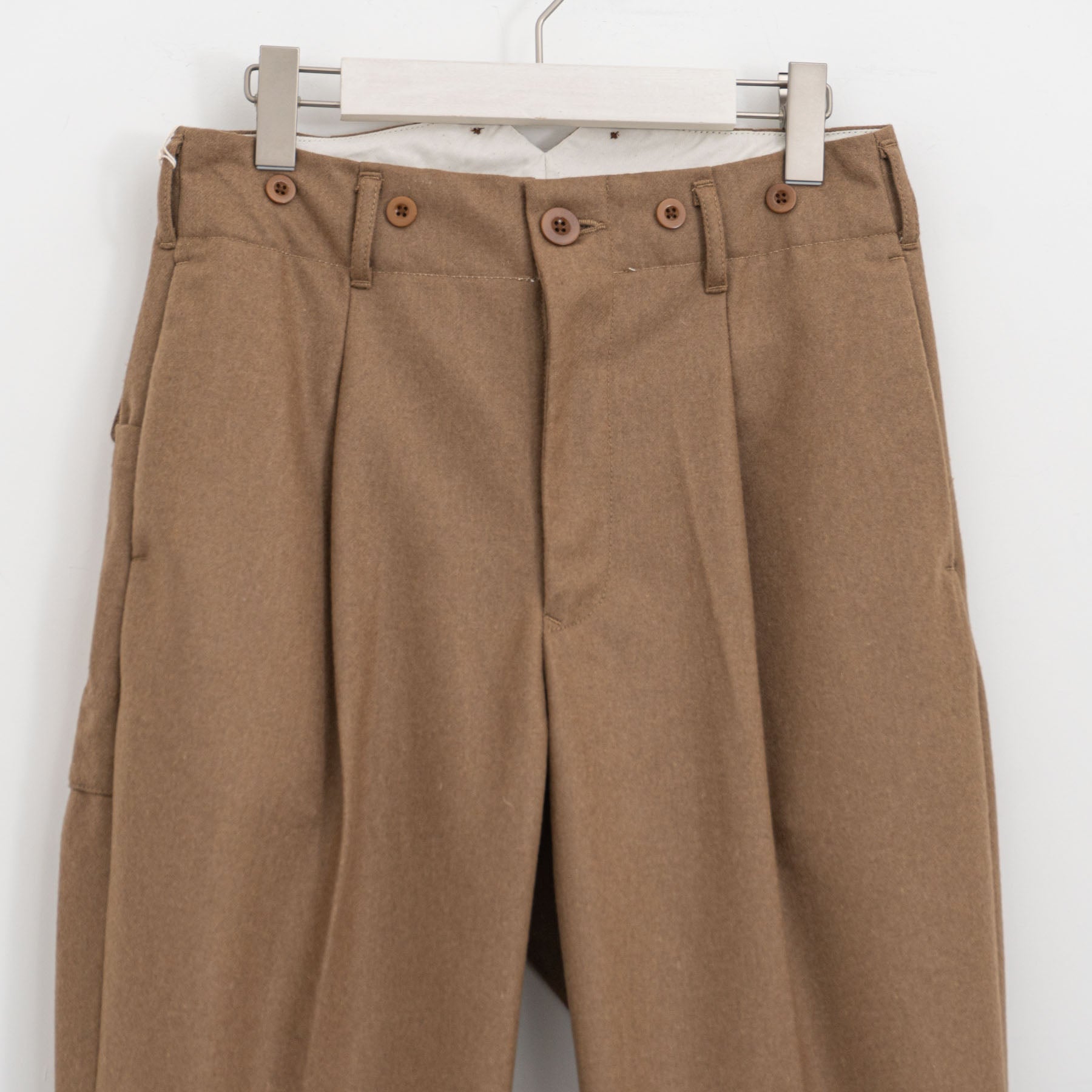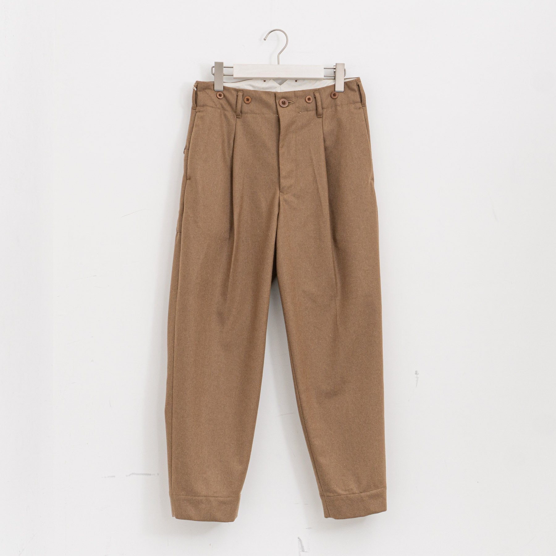 すっきりとしたスラックスシルエットのワークパンツ。 柔らかく滑らかな肌触りが特徴のスーパー100’sウールメルトンで仕立てられており、上品な着心地を楽しめます。 ヒップラインの美しさを引き立てる高い位置の尾錠でウエストを絞ることができ、シルエットをよりすっきりと整えられます。