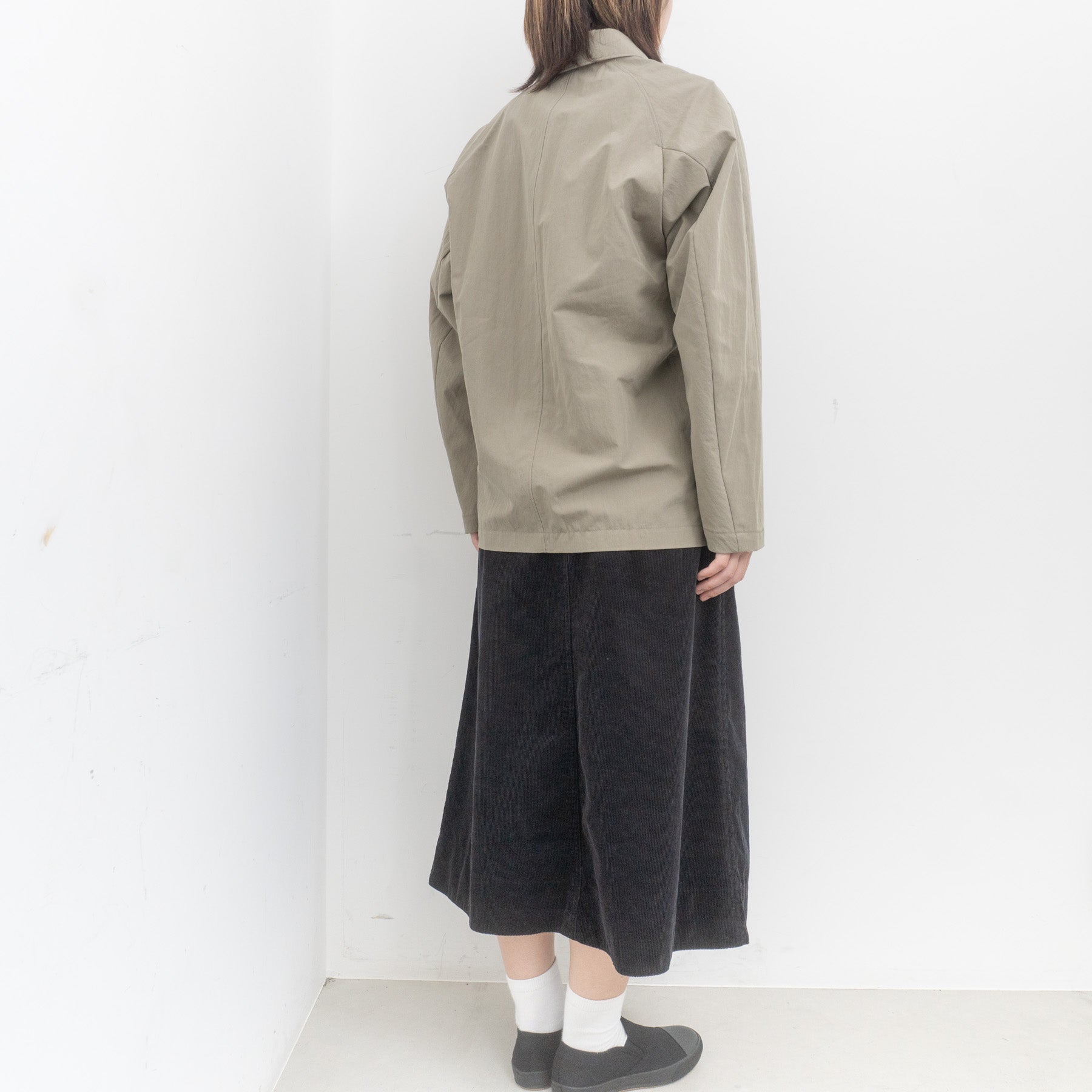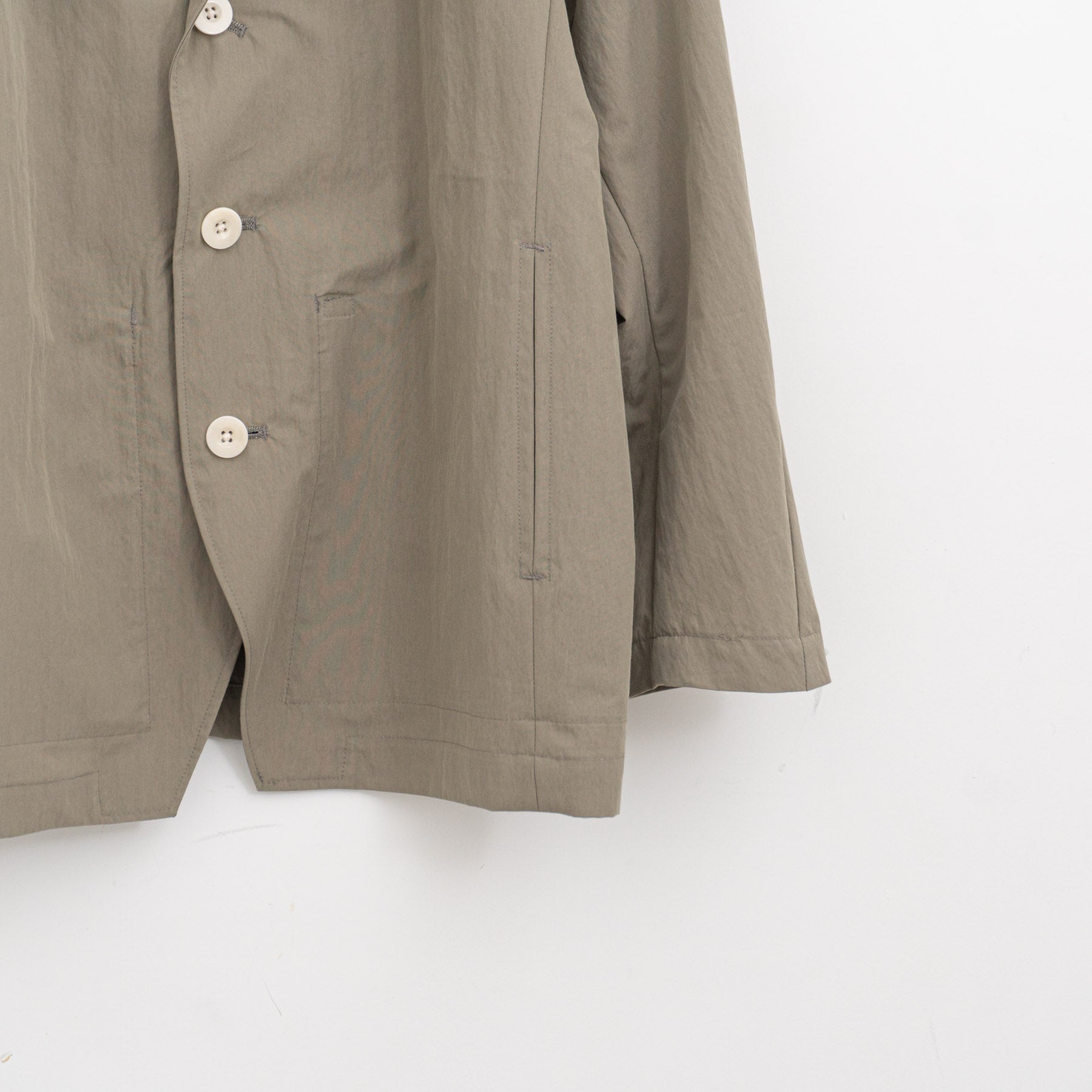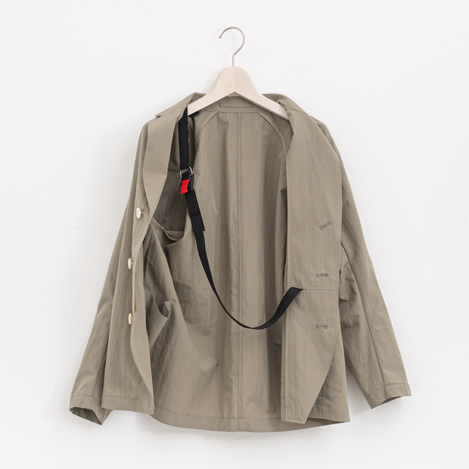 ナイロン混紡による、ほどよいシャリ感が心地よいブルゾンライクなジャケット。 背中側のみラグランスリーブを採用、立体的な縫製と組み合わせることで、動きやすさと美しいシルエットを両立しています。 脱いだ際に手で持たずに済むよう、肩から背負える調整式ストラップを内蔵しています。マグネットで着脱できる実用的な仕様で、アクティブなシーンでもスマートに着こなせる一着。