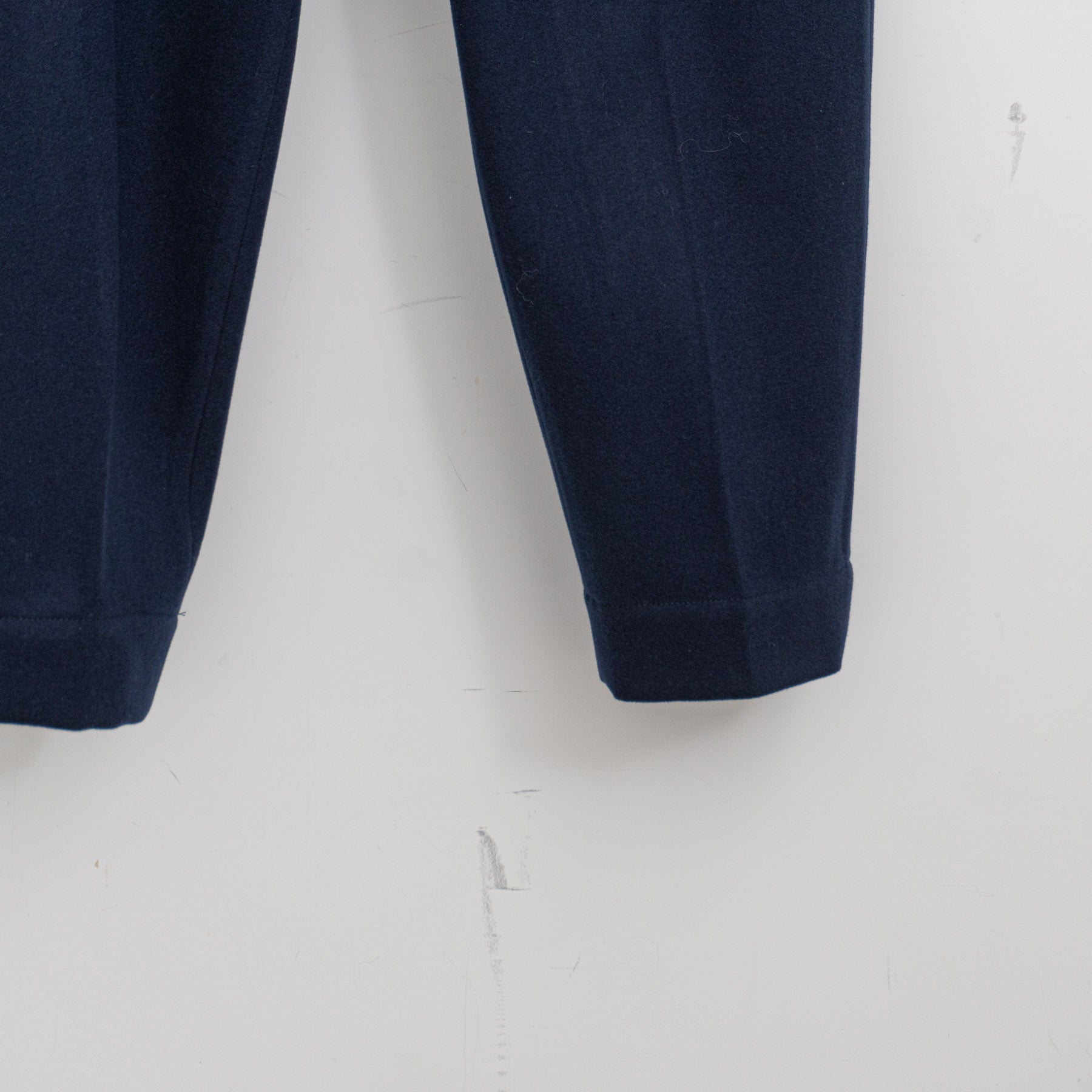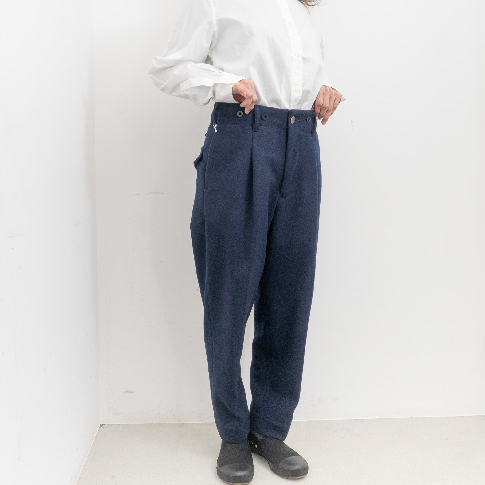 すっきりとしたスラックスシルエットのワークパンツ。 柔らかく滑らかな肌触りが特徴のスーパー100’sウールメルトンで仕立てられており、上品な着心地を楽しめます。 ヒップラインの美しさを引き立てる高い位置の尾錠でウエストを絞ることができ、シルエットをよりすっきりと整えられます。