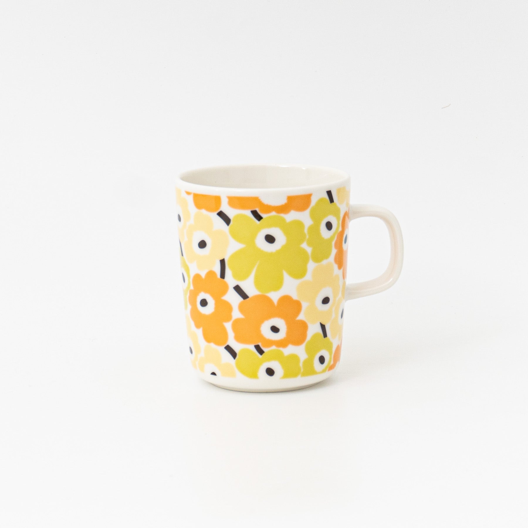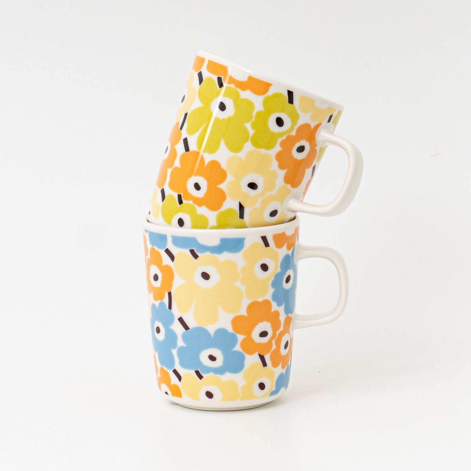 ライトグリーン×ライトイエローの Unikko 柄マグカップです。 シンプルなフォルムとコンパクトな持ち手がデザインのアクセントに。ギフトにもおすすめの一品です。