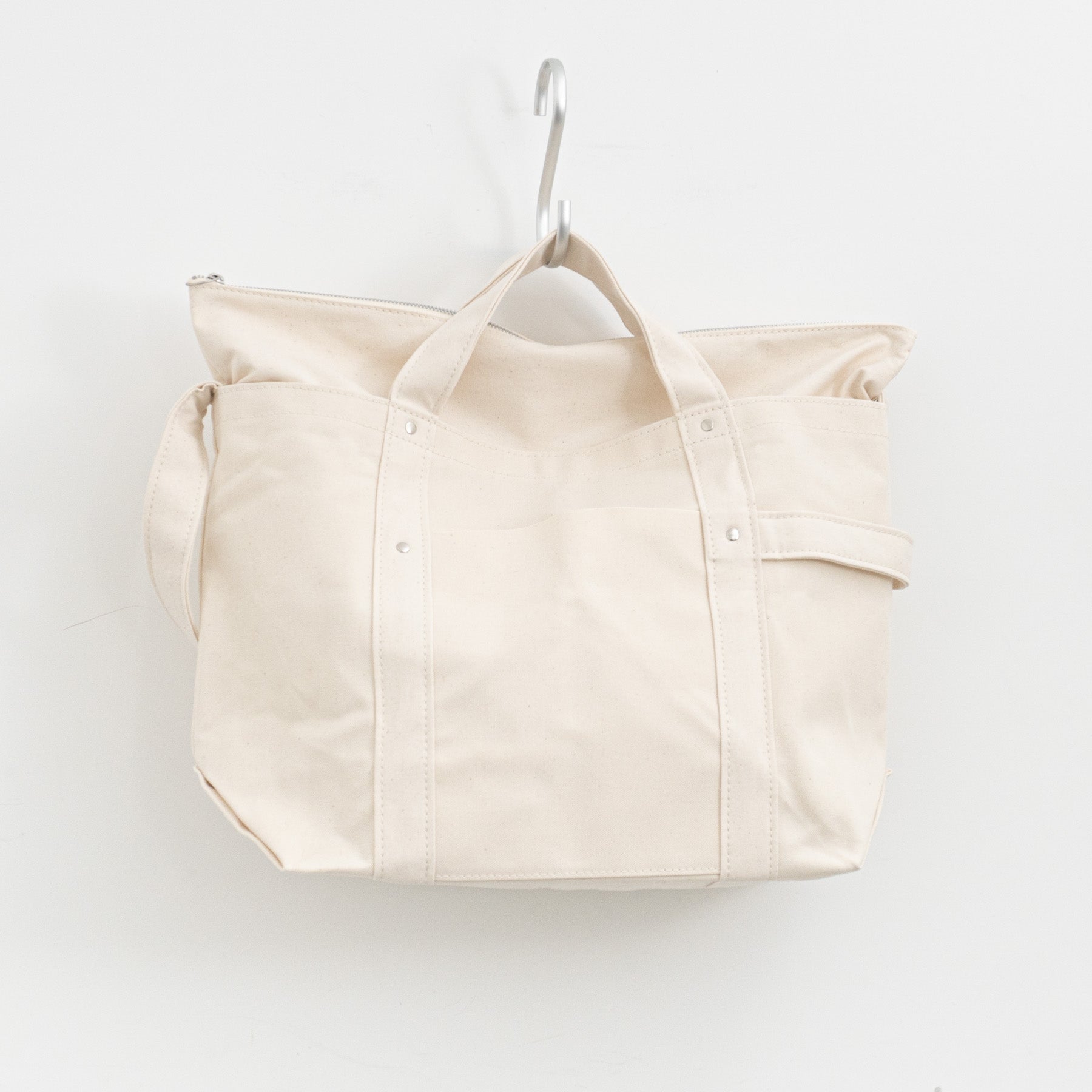 収穫作業にも使える大容量のトートバッグ。 サイドに配した持ち手は、荷物が重いときの補助としてはもちろん、荷台や車内からバッグを引き出す際にも便利な仕様です。
