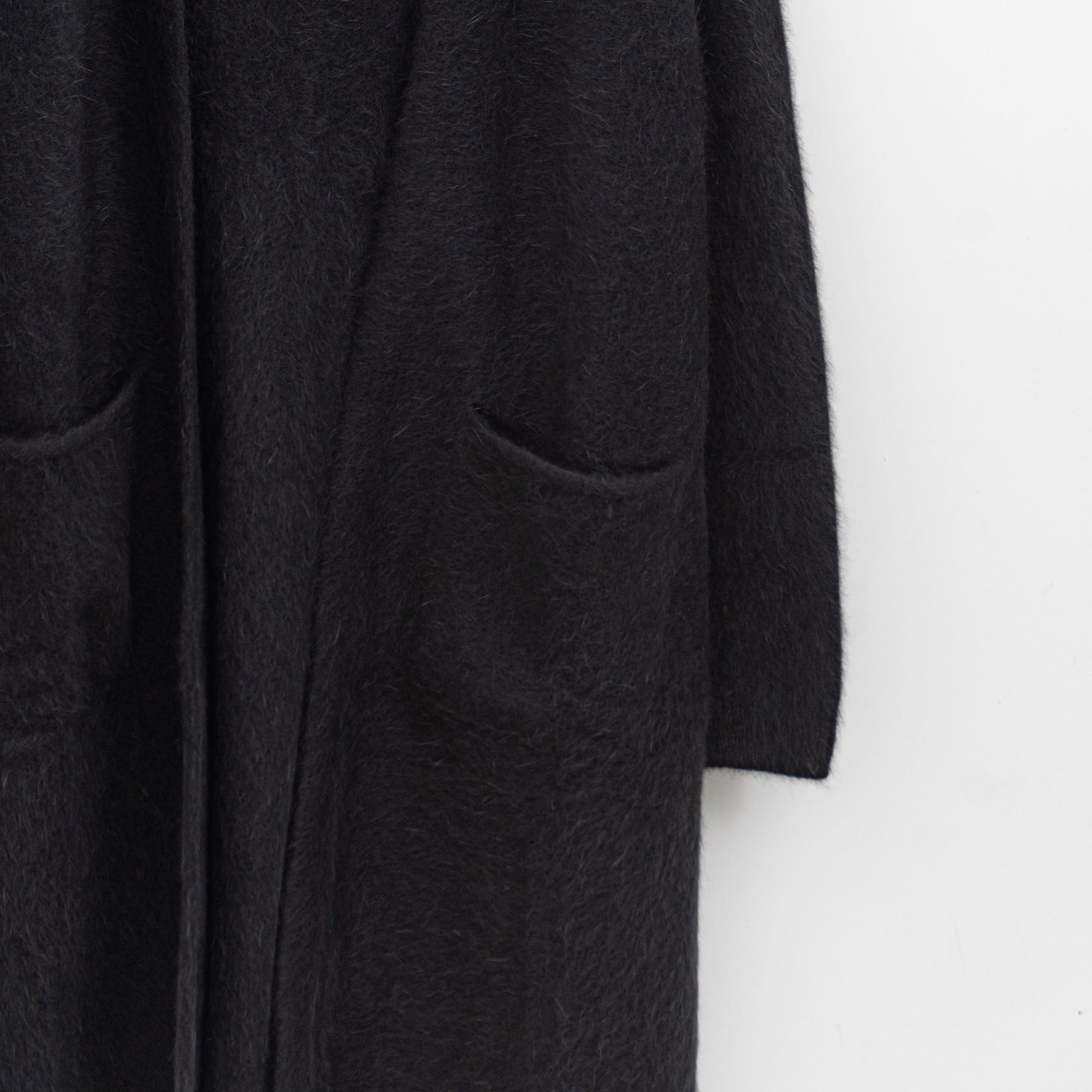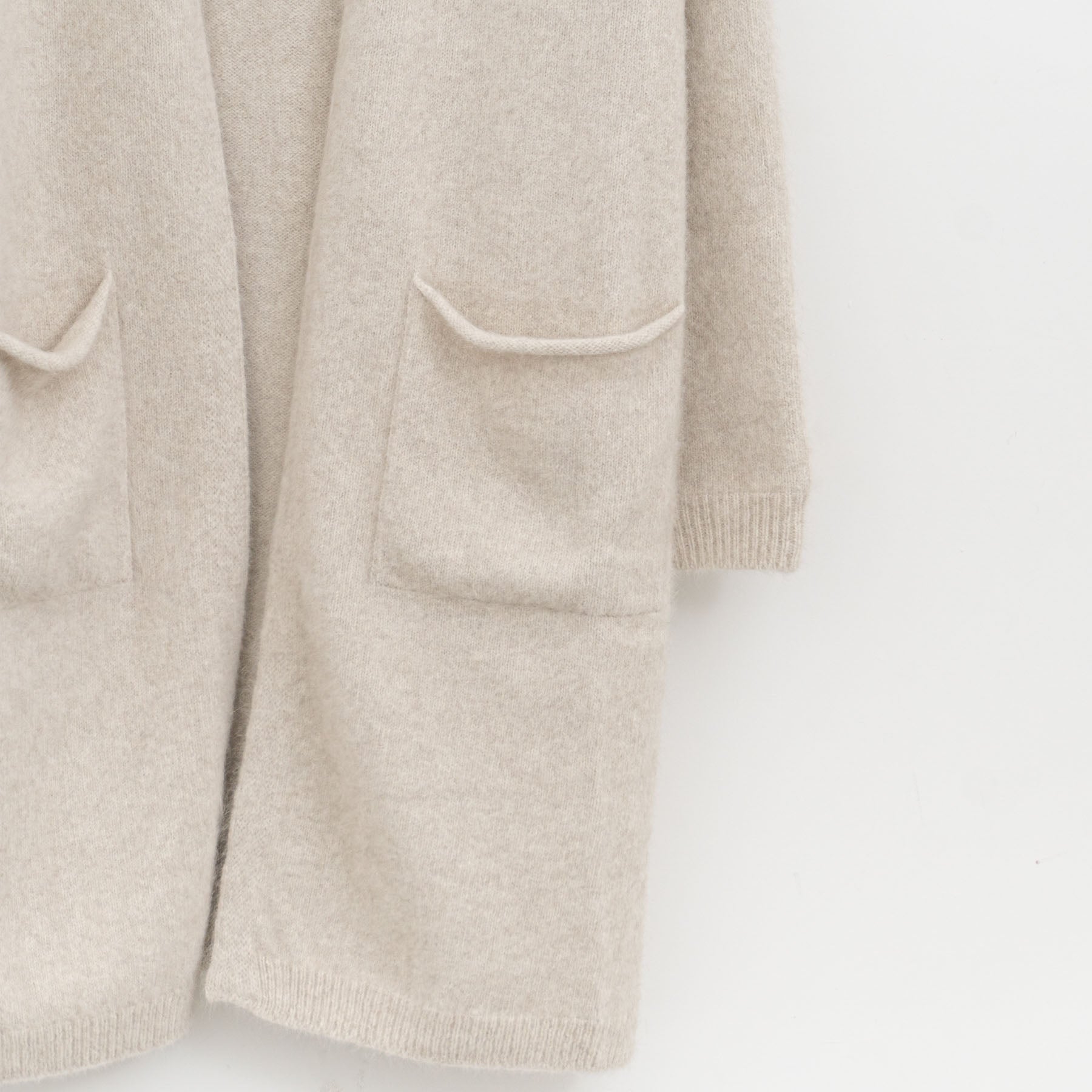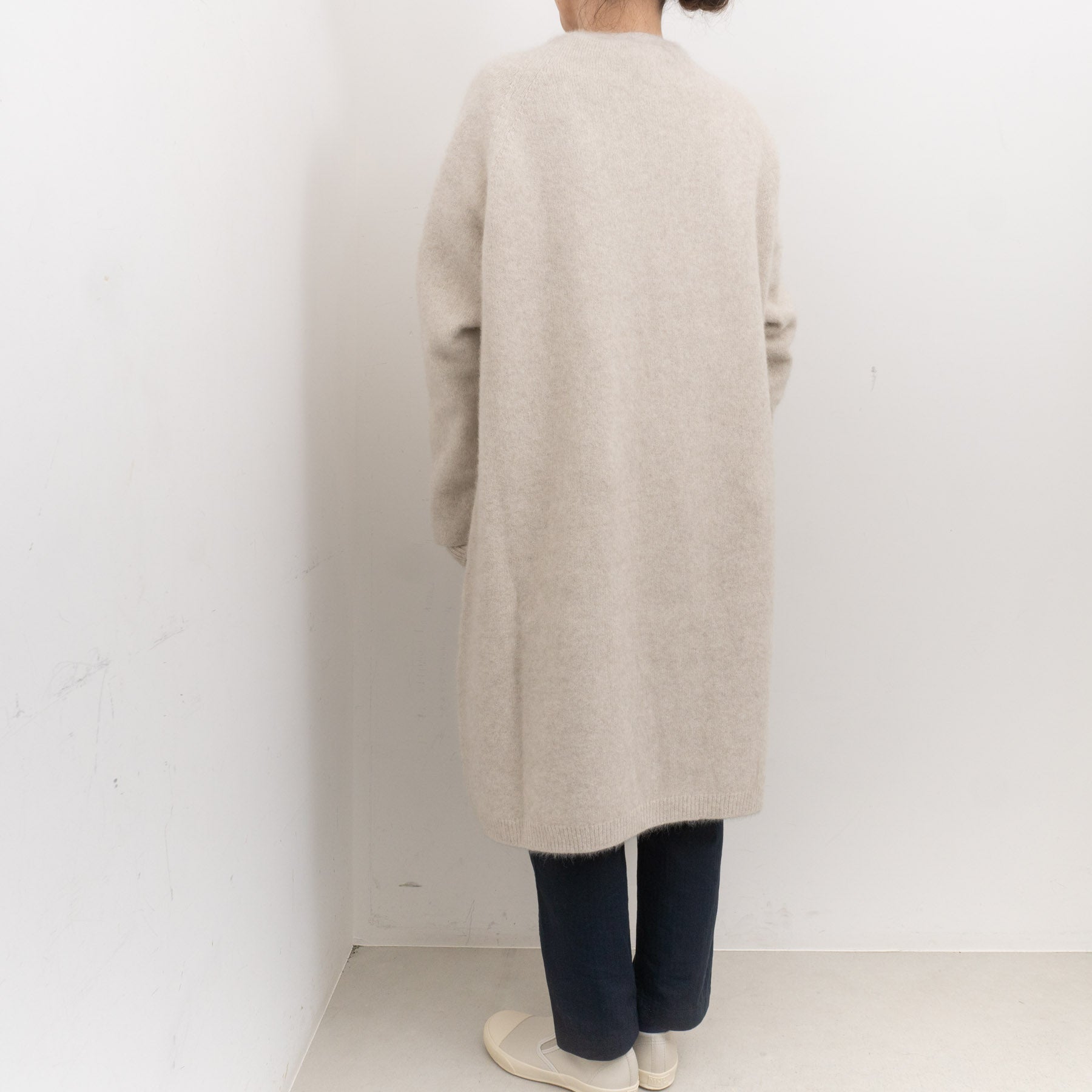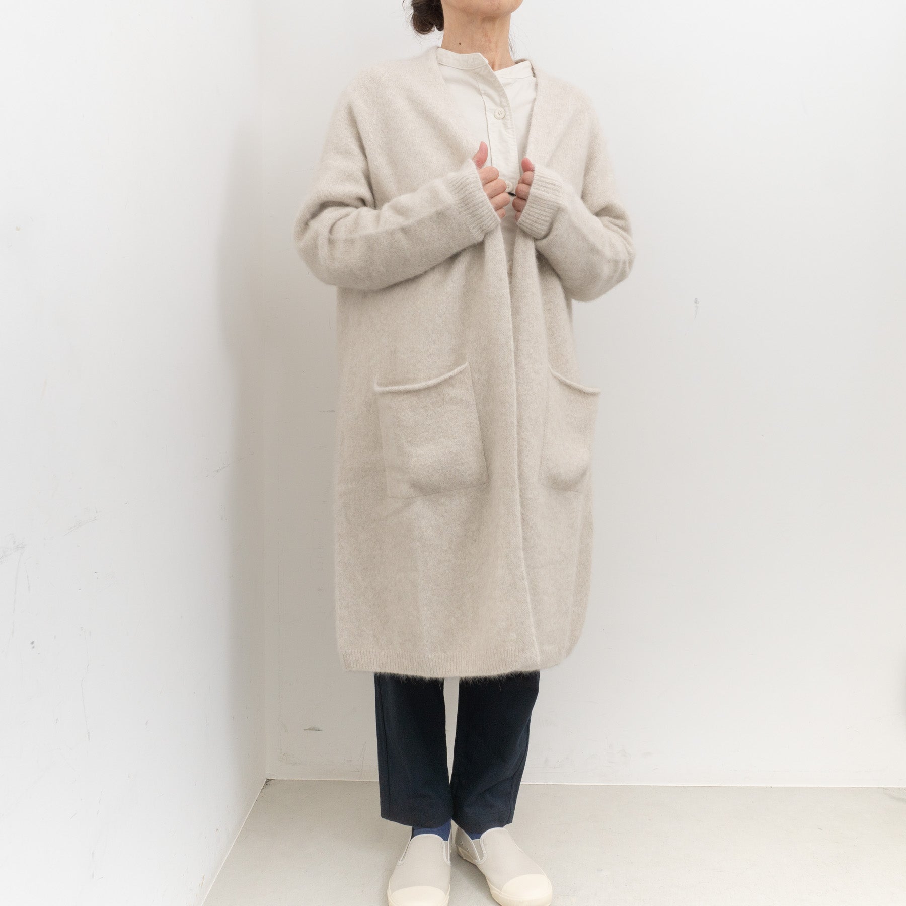 ホールガーメントならではの縫い目のないストレスフリーな着心地が魅力のロングカーディガンです。 見た目のほわほわとした柔らかさに、ウール混の糸が生むもちもちとしたタッチが加わり、思わず心をくすぐられる一枚です。 膝まで届くボタンレスのシルエットは、さらりと羽織るだけで様になるデザインです。腕まわりにもゆとりを持たせているため、ニットやシャツを重ねてももたつきにくいため、さまざまなレイヤードを楽しめます。軽やかなワンピースとの組み合わせも好相性です。 シンプルながら表情のある編み地が、どんな装いにも寄り添い、スタイリングの幅を広げてくれるニットです。