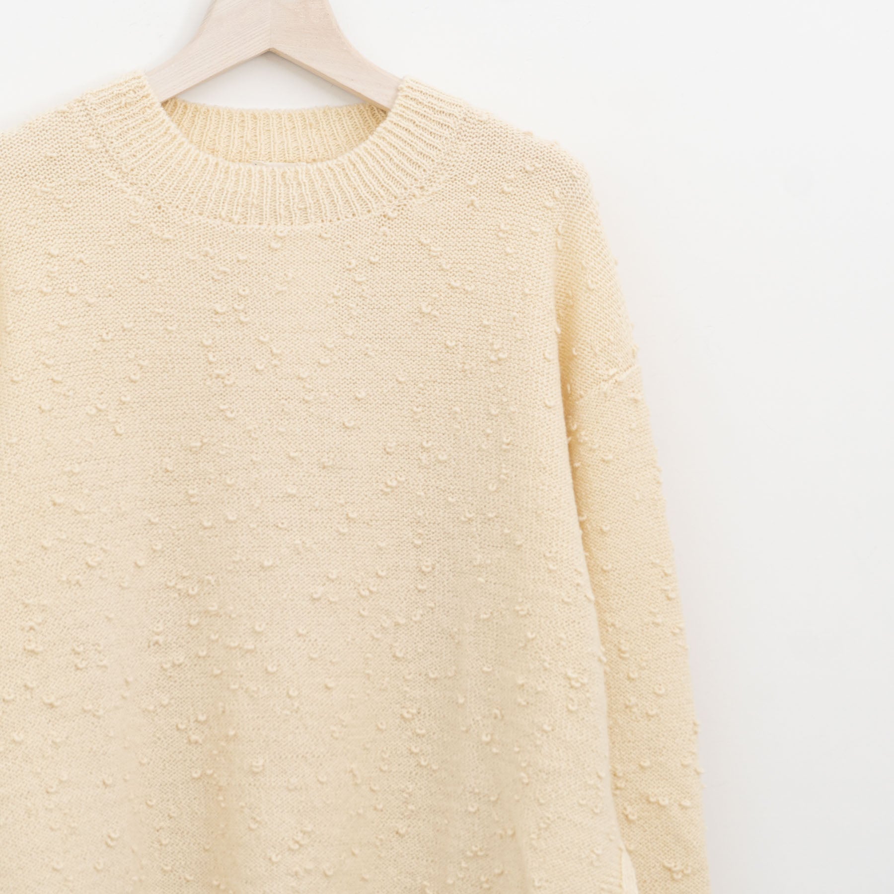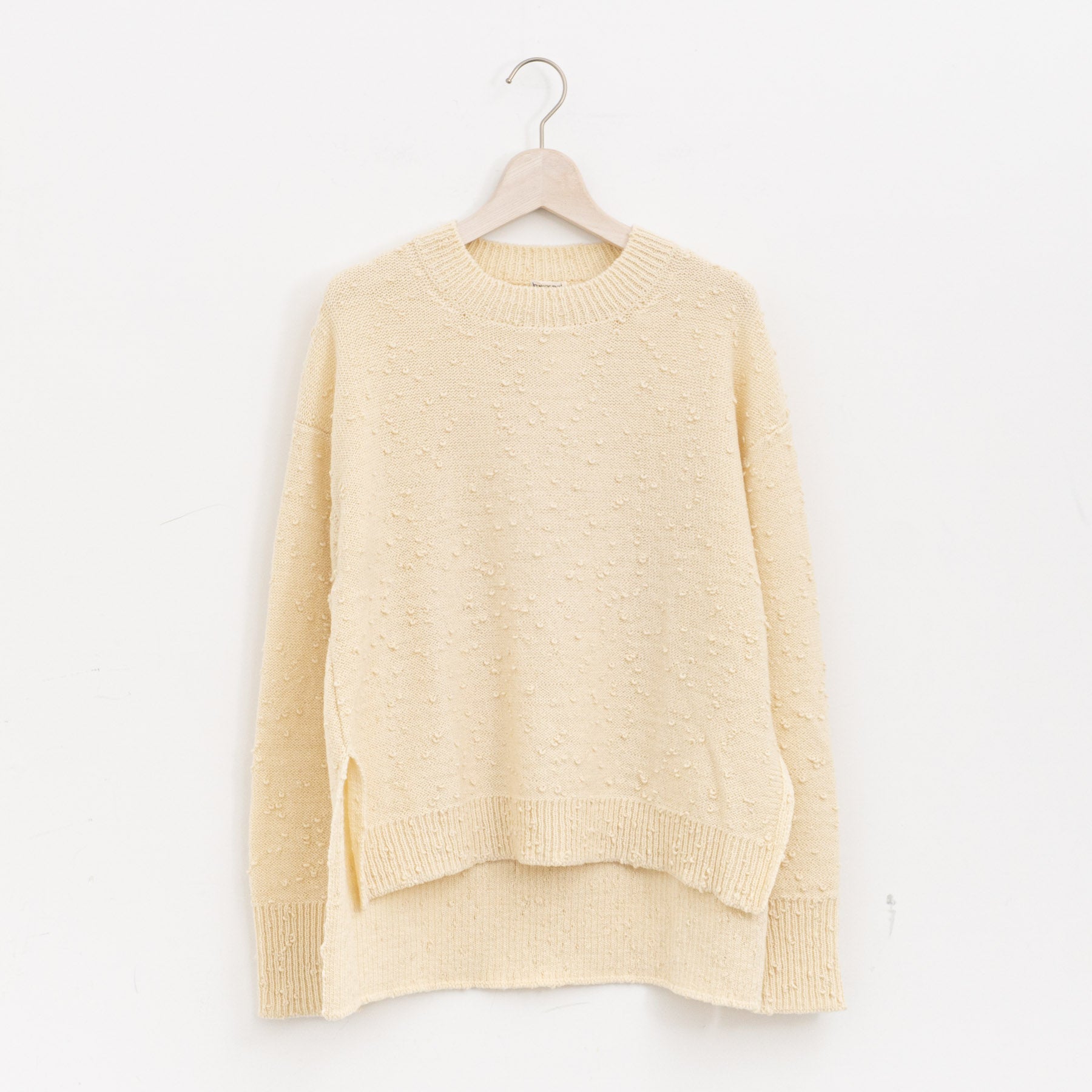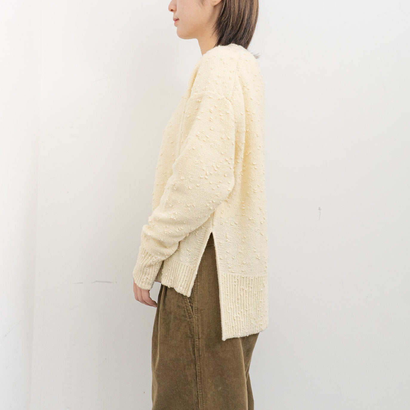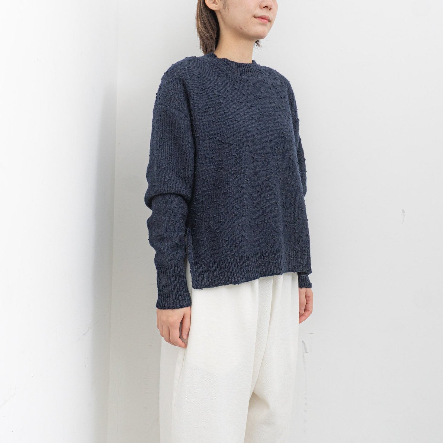 羊毛糸にノット(結び玉)のような立体的な表情を加えたデザイン糸を使用。存在感のある編地に仕上げたプルオーバーです。 弾力がありつつも柔らかな風合い。さらりとしたドライな肌触りが心地よく、軽やかに着ていただけます。 一枚でスタイルが完成する主役級のデザイン。パンツやスカートと合わせたシンプルな着こなしがおすすめ。