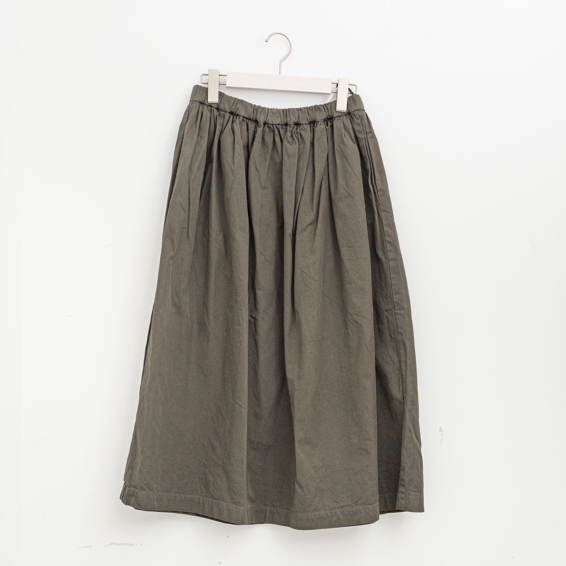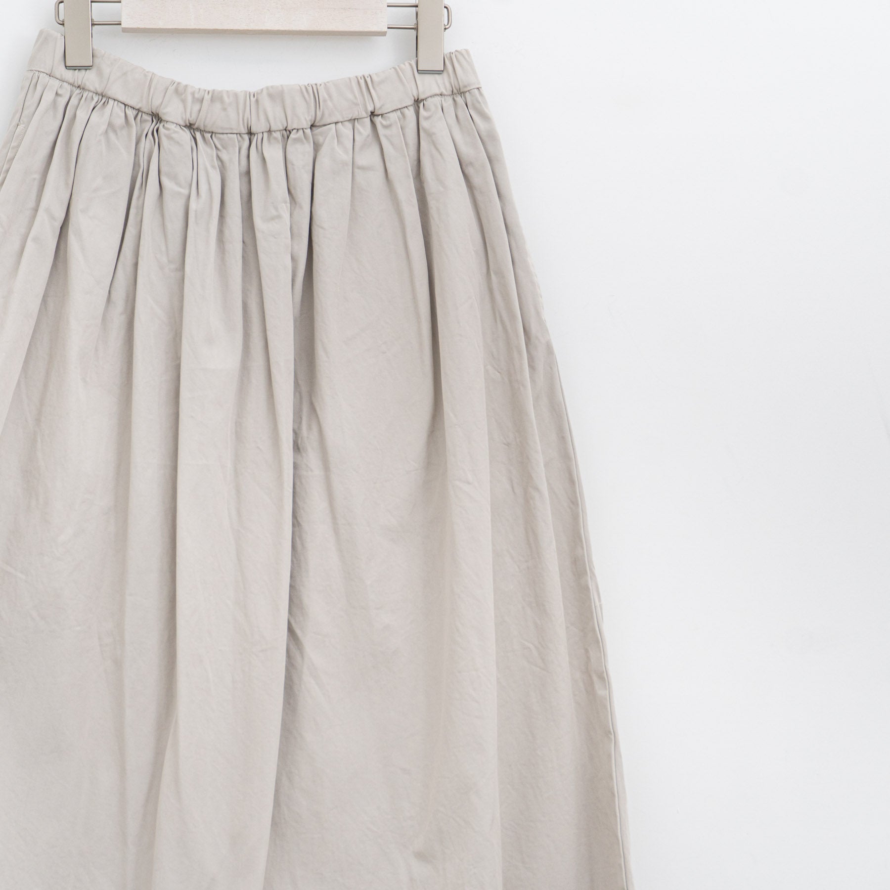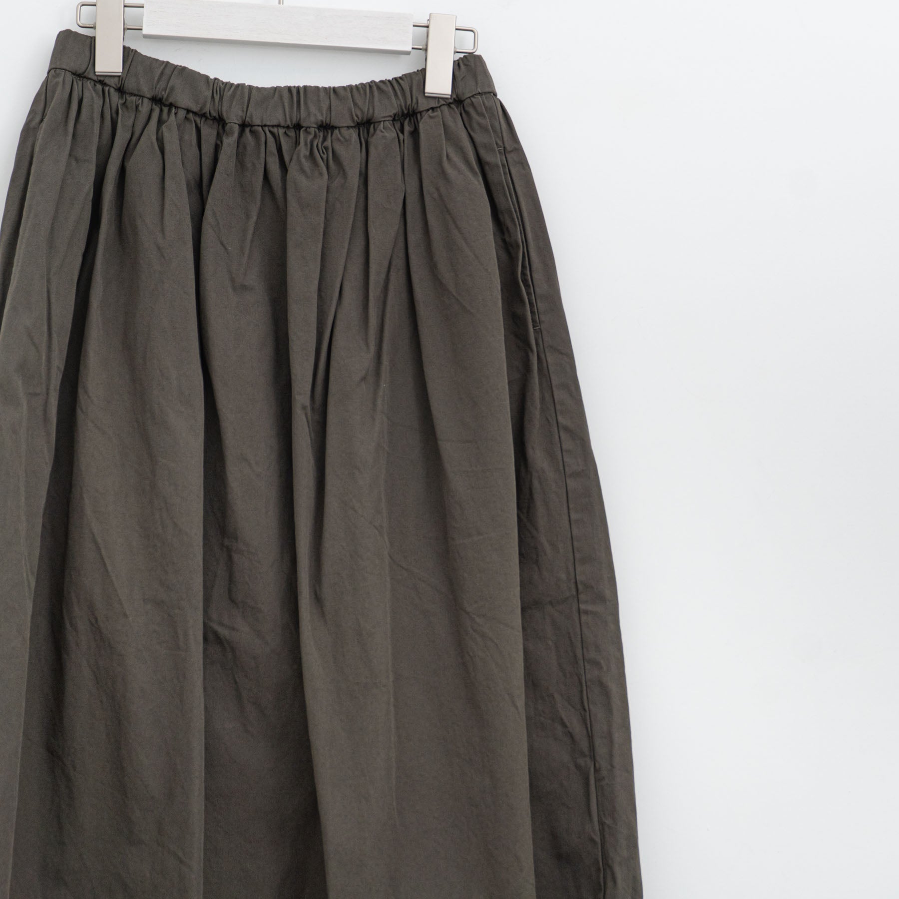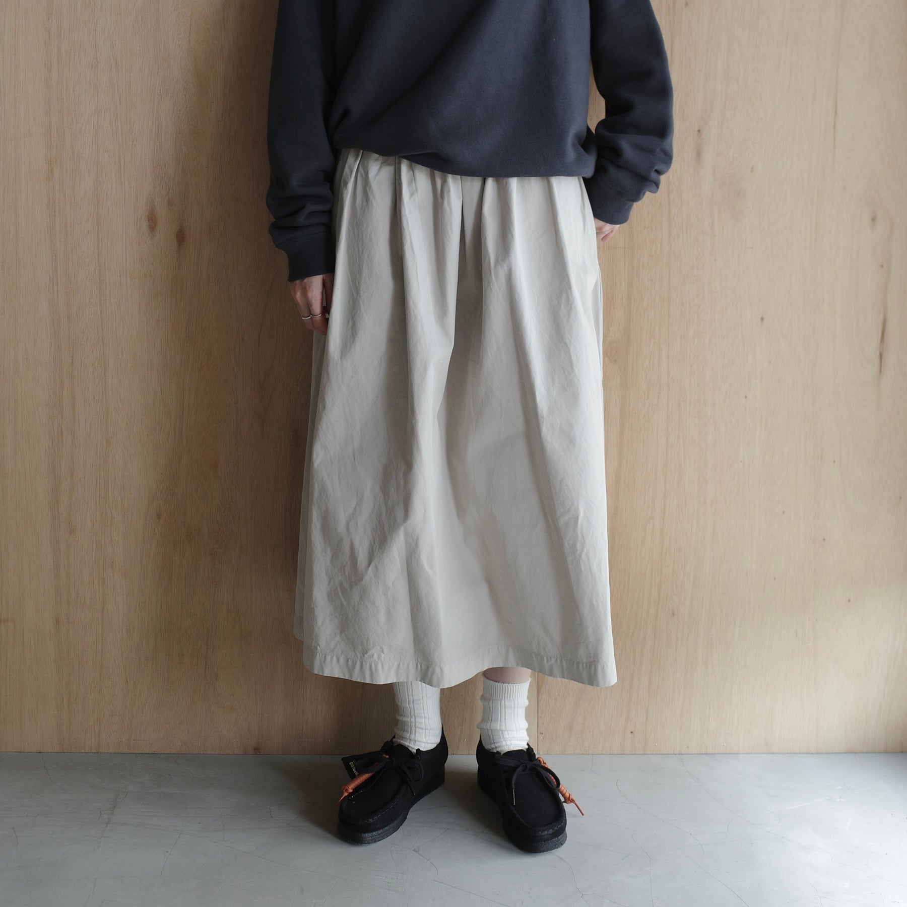 紡績時に毛羽を内側へ巻き込むことで表面の毛羽が少ないコンパクトヤーンを使用し、高密度に織り上げた生地です。製品加工でさらに生地が詰まり、超高密度で毛羽立ちがないペーパーライクな風合いに。また加工を施してから製品過去をを行うため、1枚ごとに異なるムラのある色味や風合いが特徴。