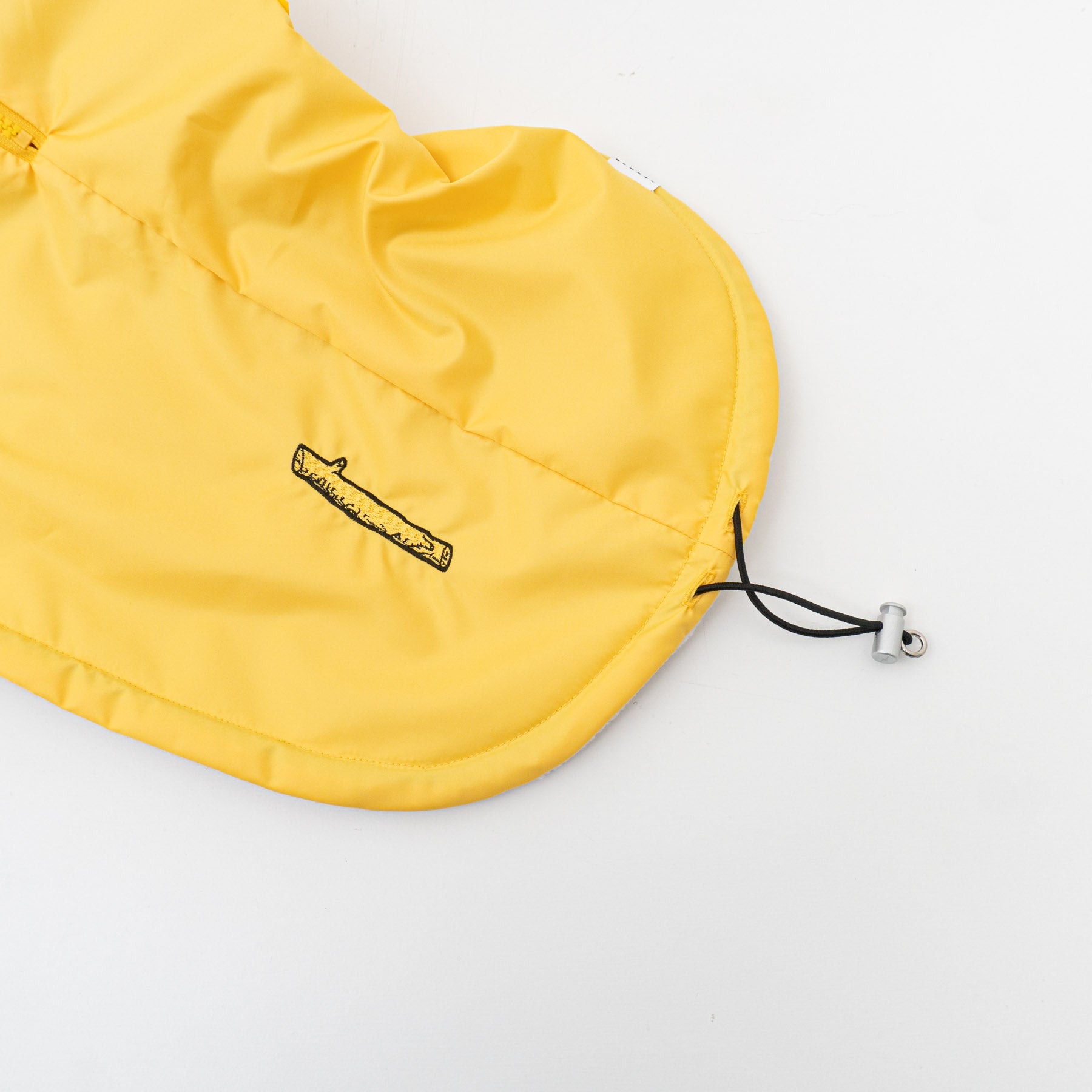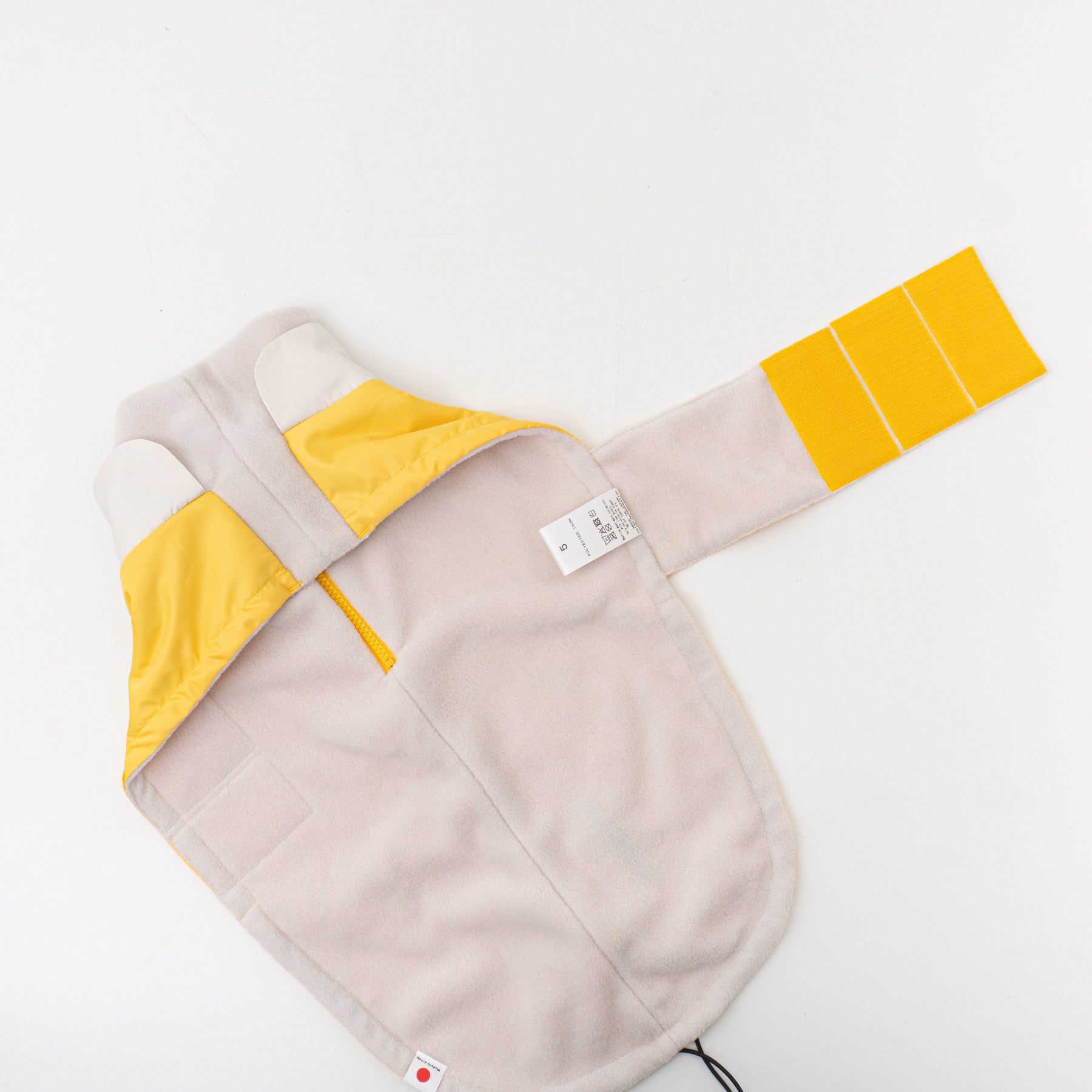 着せ方は、まず頭を通し、胴回りをマジックテープで留めるだけの簡単仕様。幅広い犬種に対応できるようテープは長めにデザインしており、必要に応じてご自宅でカットして調整いただけます。裾も絞れる仕様になっており、愛犬の体型に合わせてフィット感を変えられます。