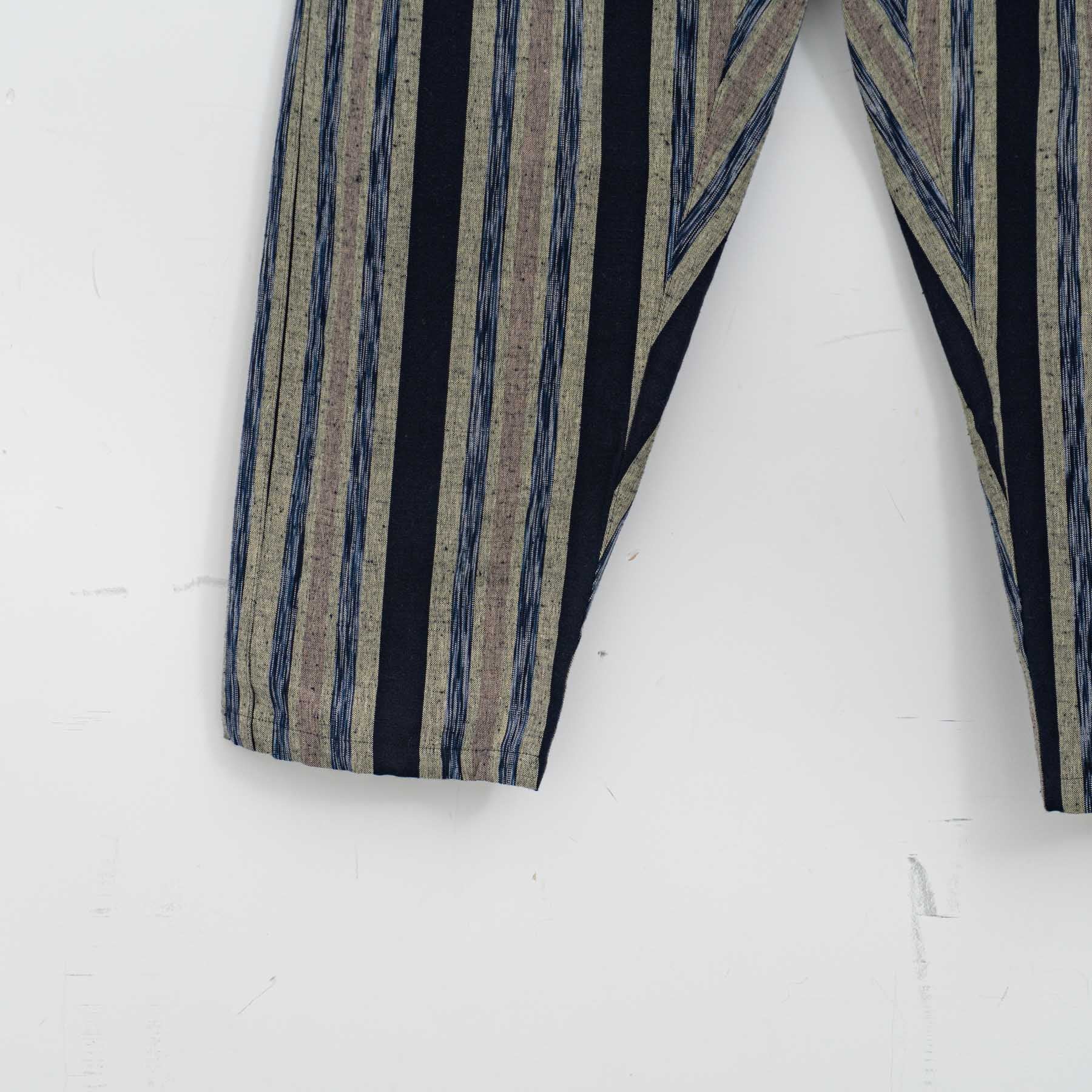 「Farmers’ MONPE クリエイティブチャレンジ No.3」は、伝統的な絣技法の魅力を現代に活かすことをコンセプトに作られたもんぺです。四国・伊予地方の絣柄を、久留米絣の技術で表現することで、異なる産地同士の技術交流を実現しています。くくり染めによって糸段階で模様を染め分けることで、独特のマダラ模様を持つ、味わい深いデザインに仕上がっています。伝統を尊重しながらも、現代の生活に寄り添う、実用性と美しさを兼ね備えた一着です。