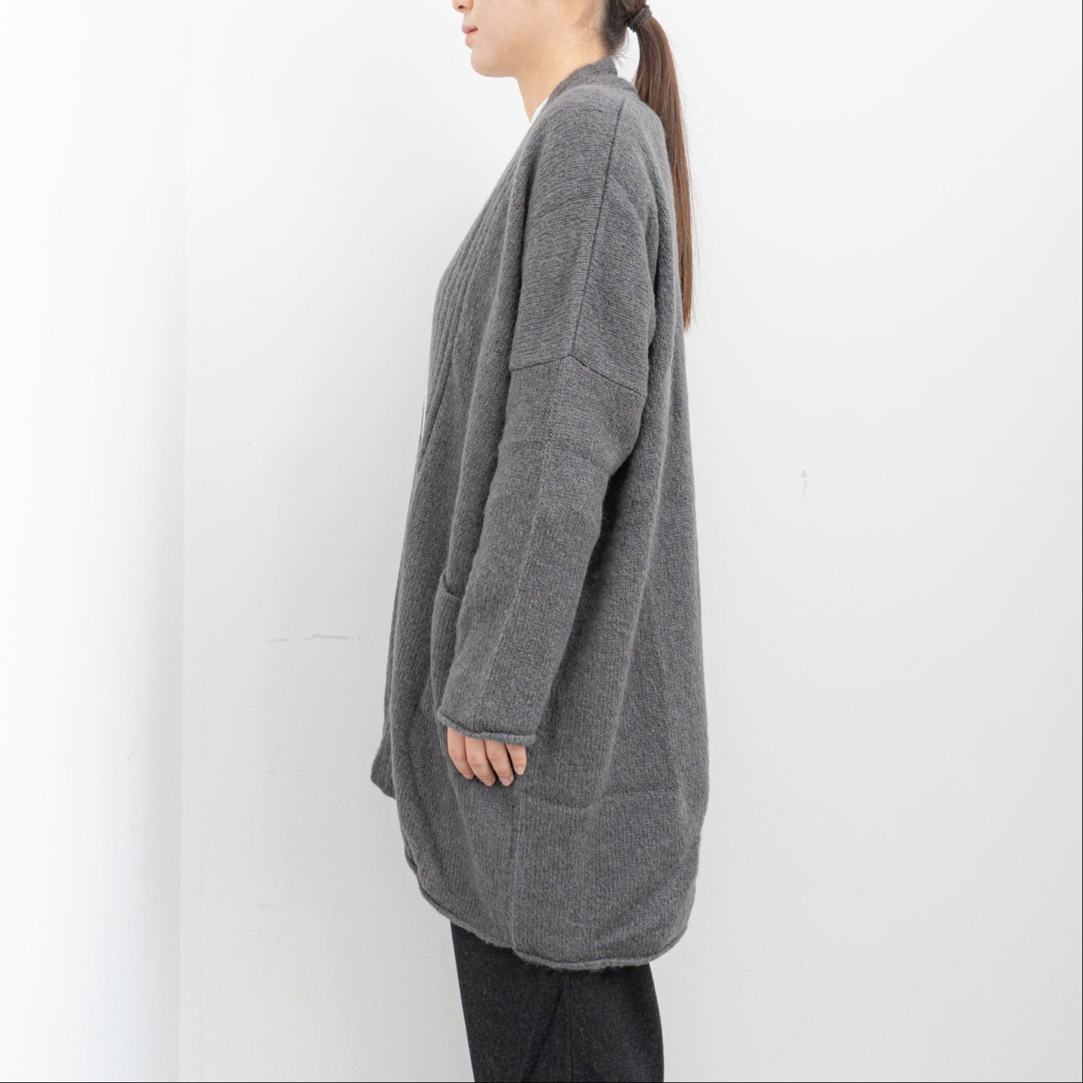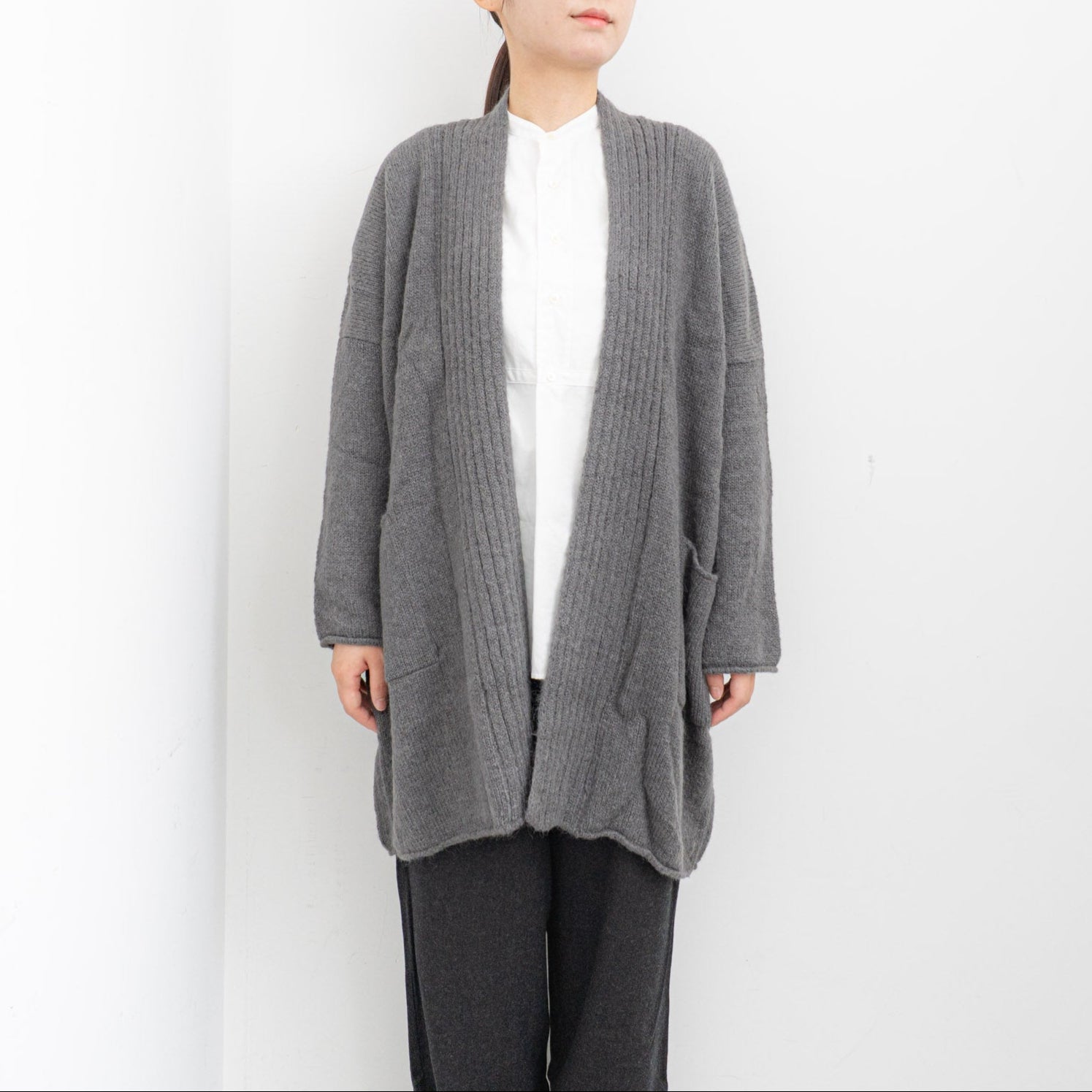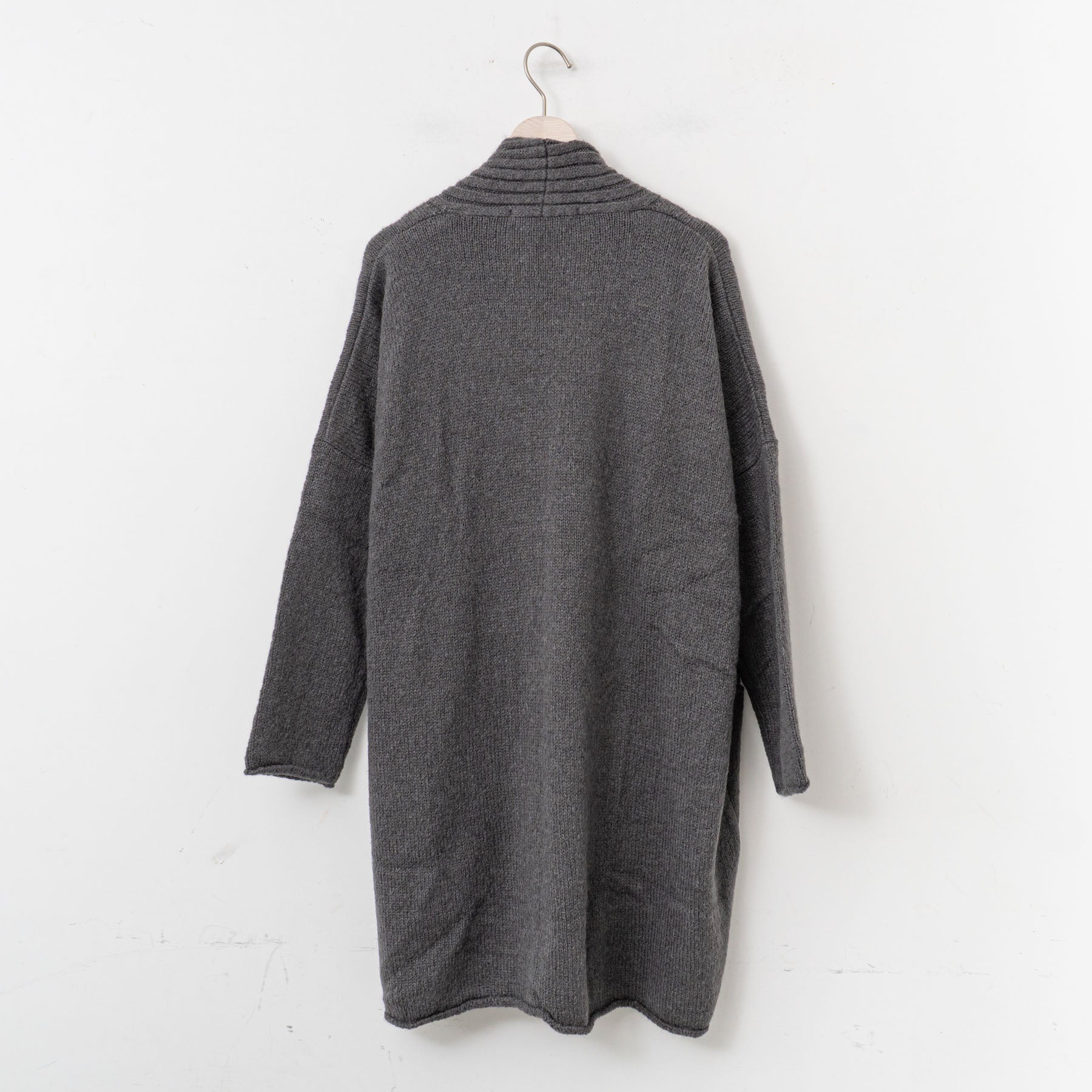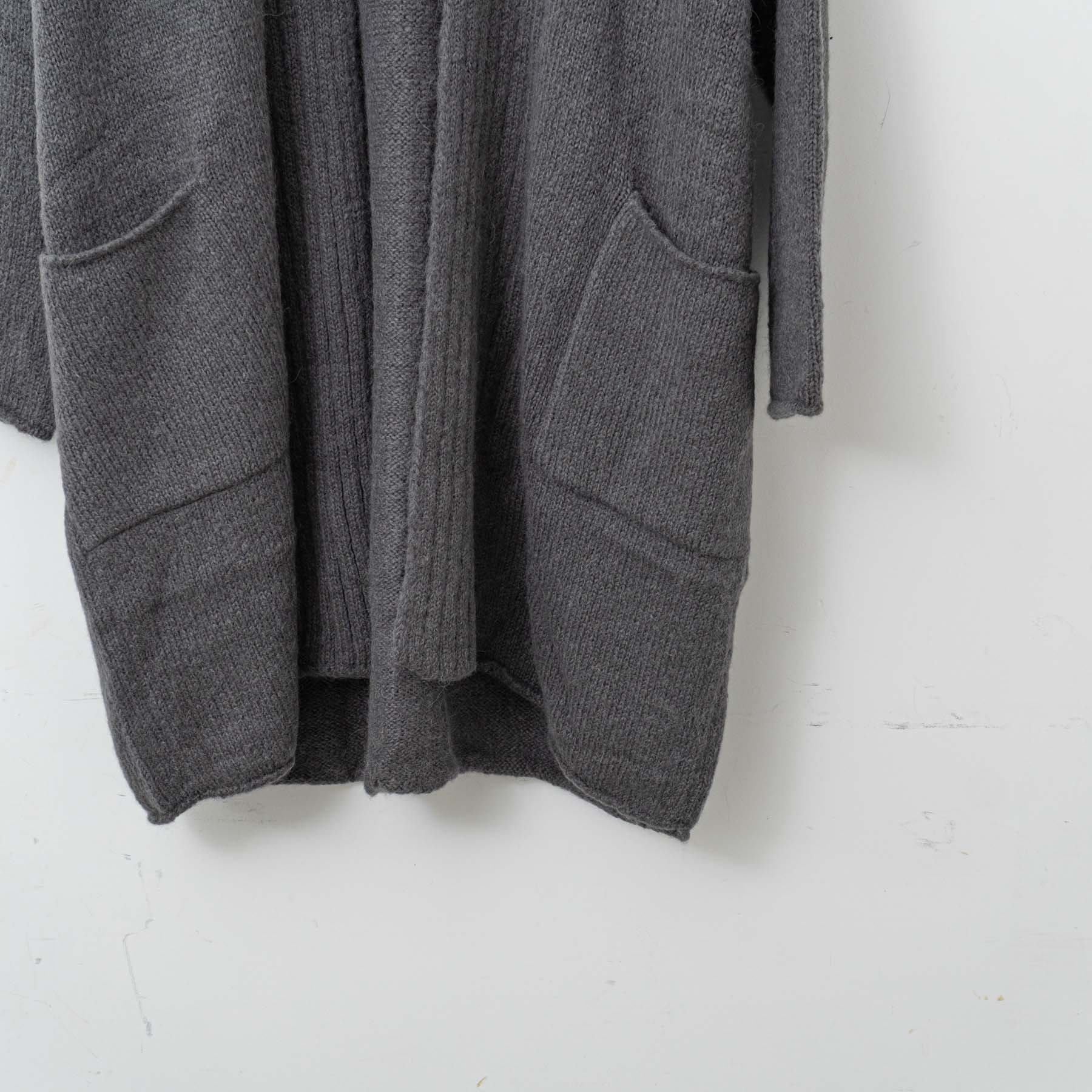 アルパカの中でも特に希少とされている「スーリー種」の原毛を使用しています。シルクのような自然な光沢を持ち併せていることから、艶やかさを感じられるやさしい色合いに染められています。 ウールの原毛と合わせて甘撚りにしたのち、繊維を少し引っ掻き出した特徴のある糸です。衿元に施したリブ編みがポイント。長すぎない丈で着まわしのきくローブになっています。