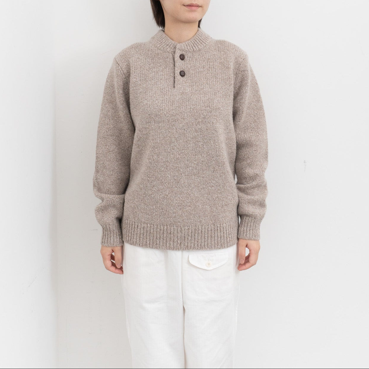 ヘンリーネック仕様で、クラシックながらも洗練された印象に仕上げました。