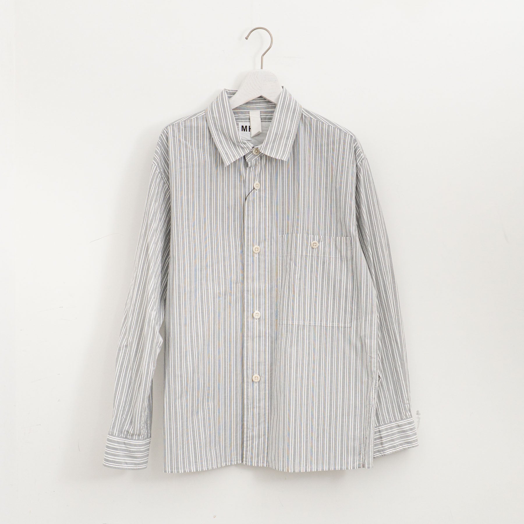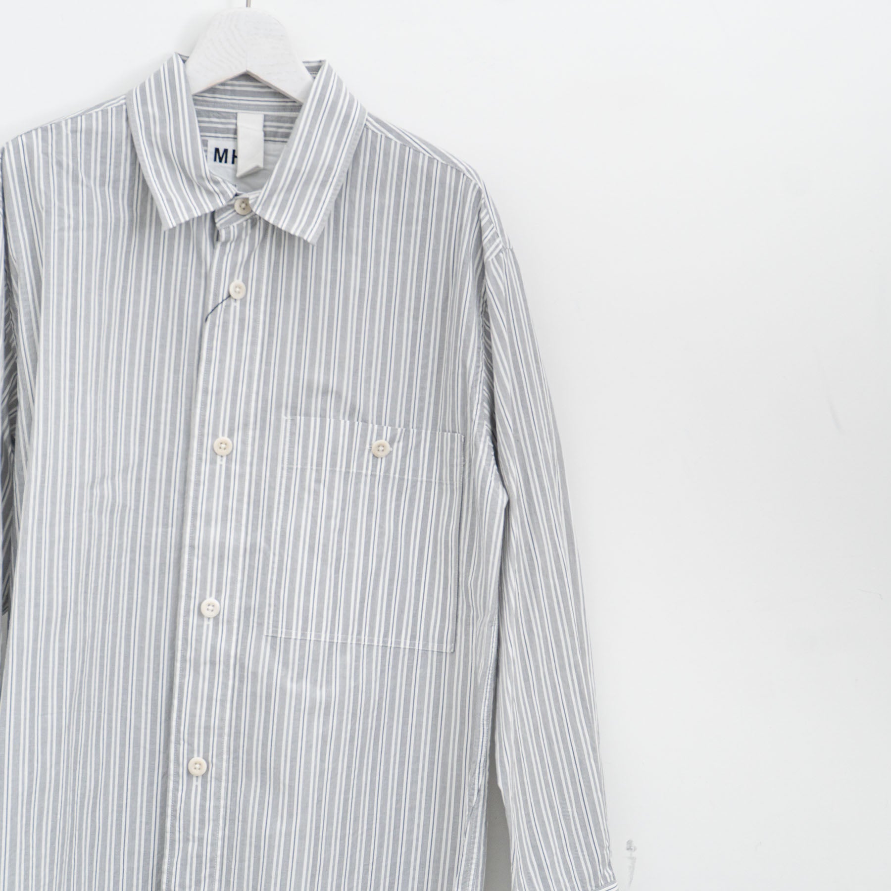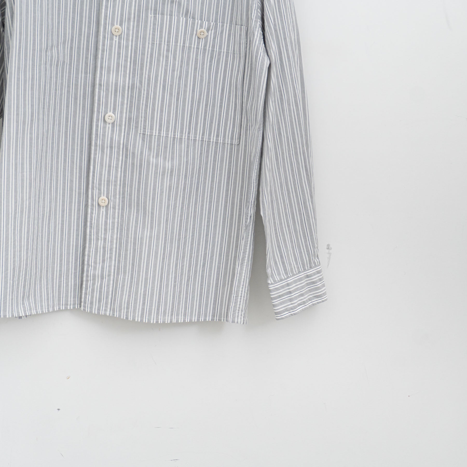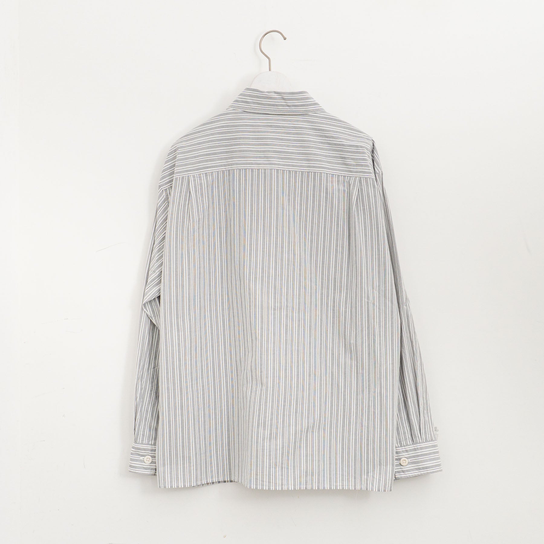 スヴィンコットンと米綿を組み合わせた薄手のポプリン素材のシャツ。グレーとオフホワイトのイレギュラーストライプがクリーンな印象。