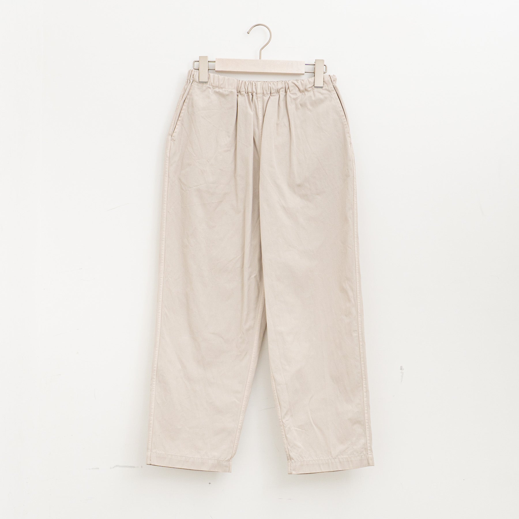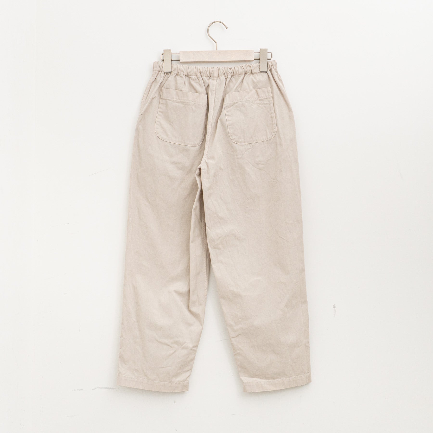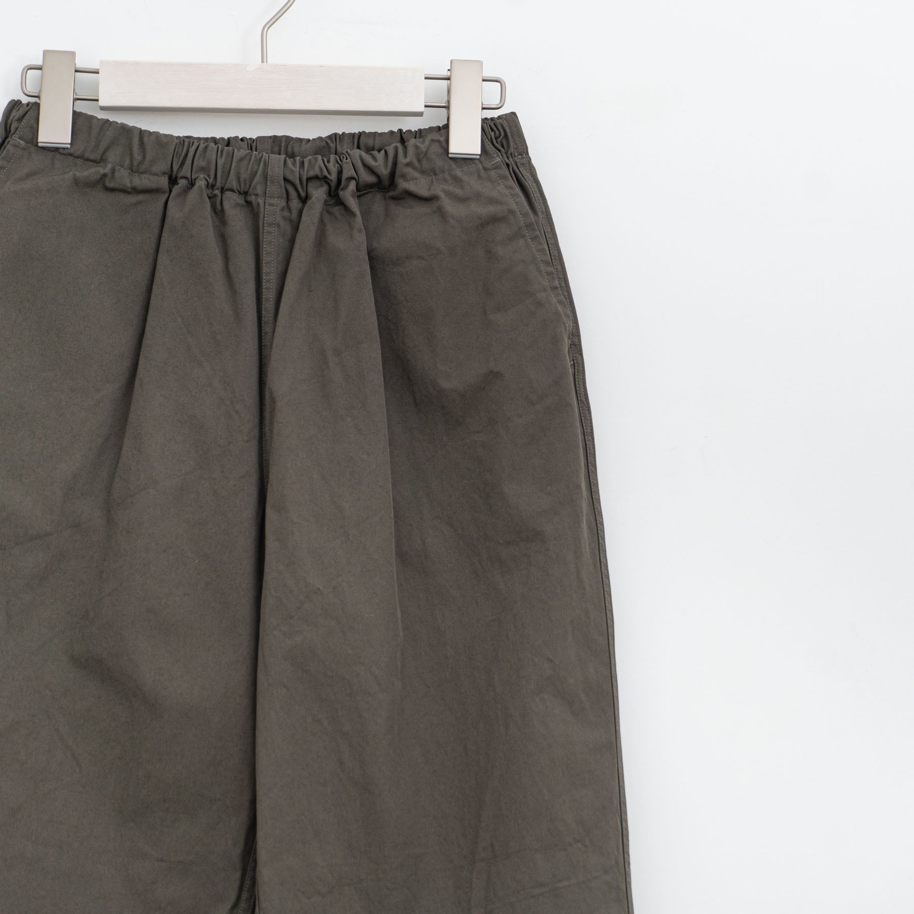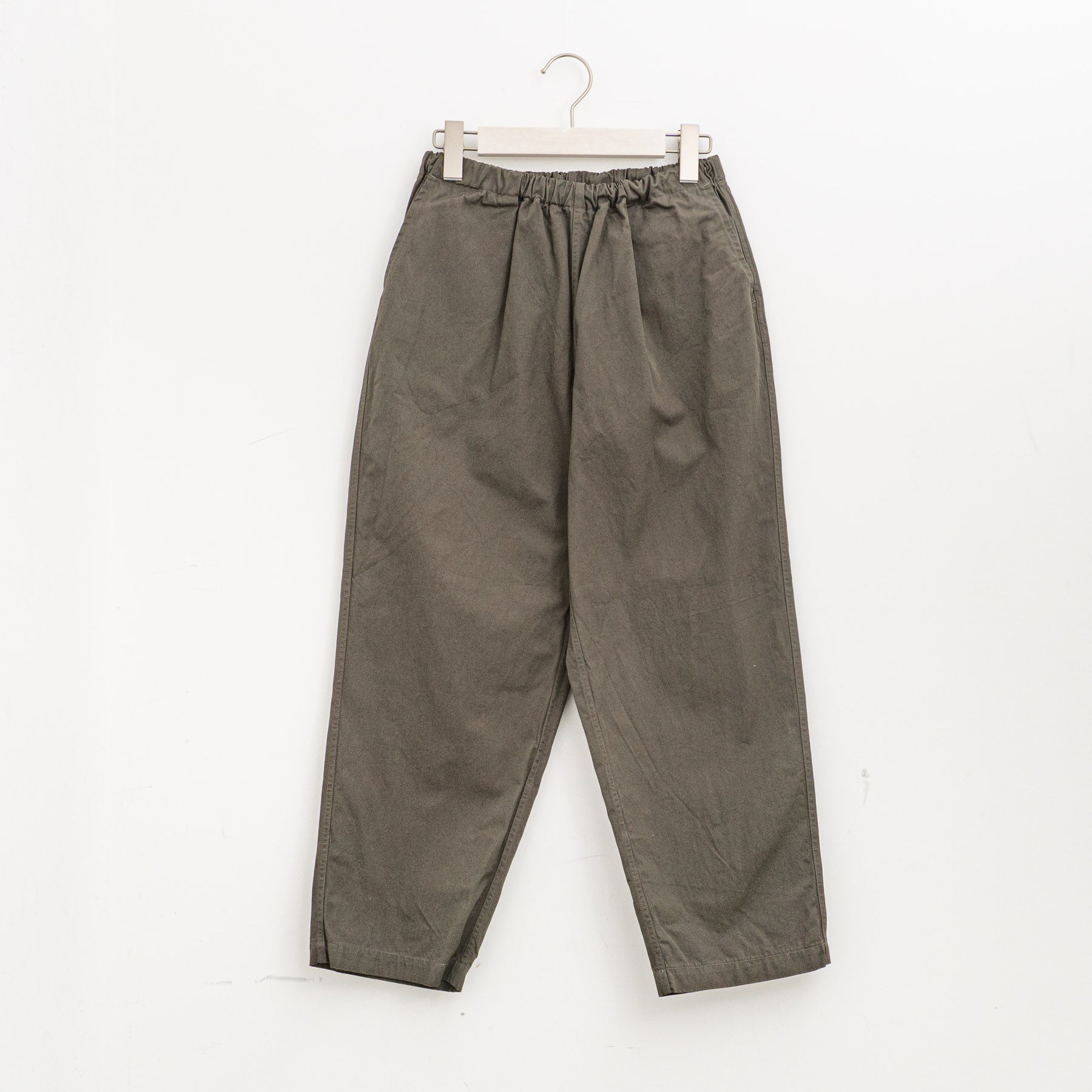 紡績時に毛羽を内側へ巻き込むことで表面の毛羽が少ないコンパクトヤーンを使用し、高密度に織り上げた生地です。製品加工でさらに生地が詰まり、超高密度で毛羽立ちがないペーパーライクな風合いに。また加工を施してから製品過去をを行うため、1枚ごとに異なるムラのある色味や風合いが特徴。