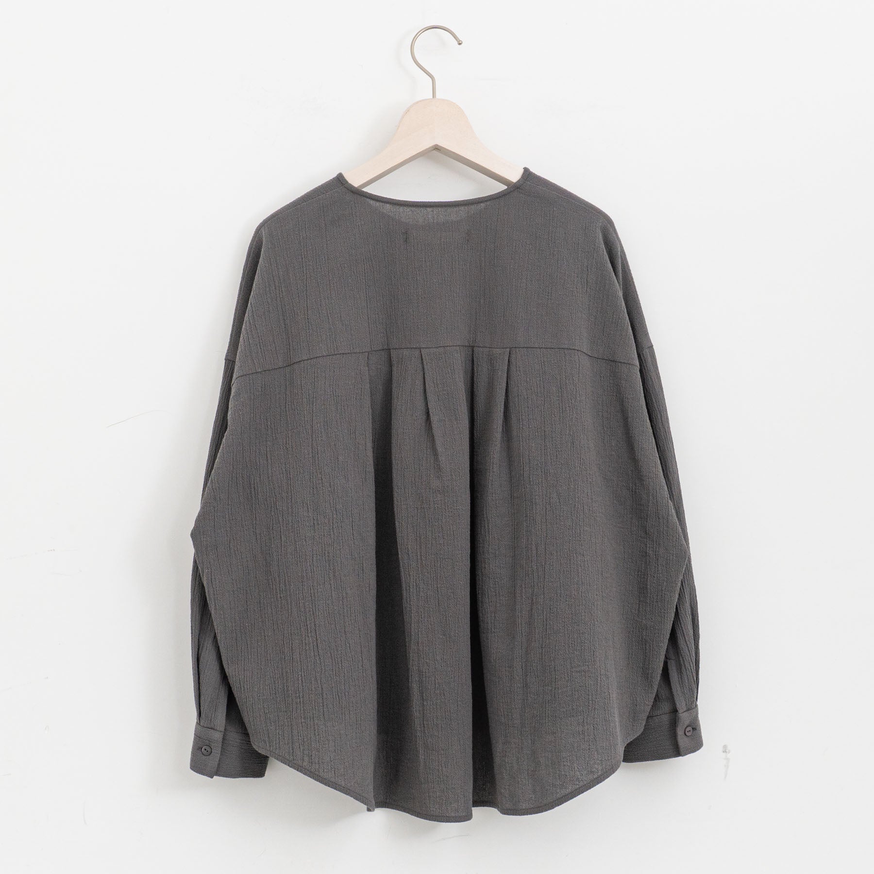 季節を問わず長く楽しめます。 首元をすっきり見せるノーカラーデザインのシャツ。