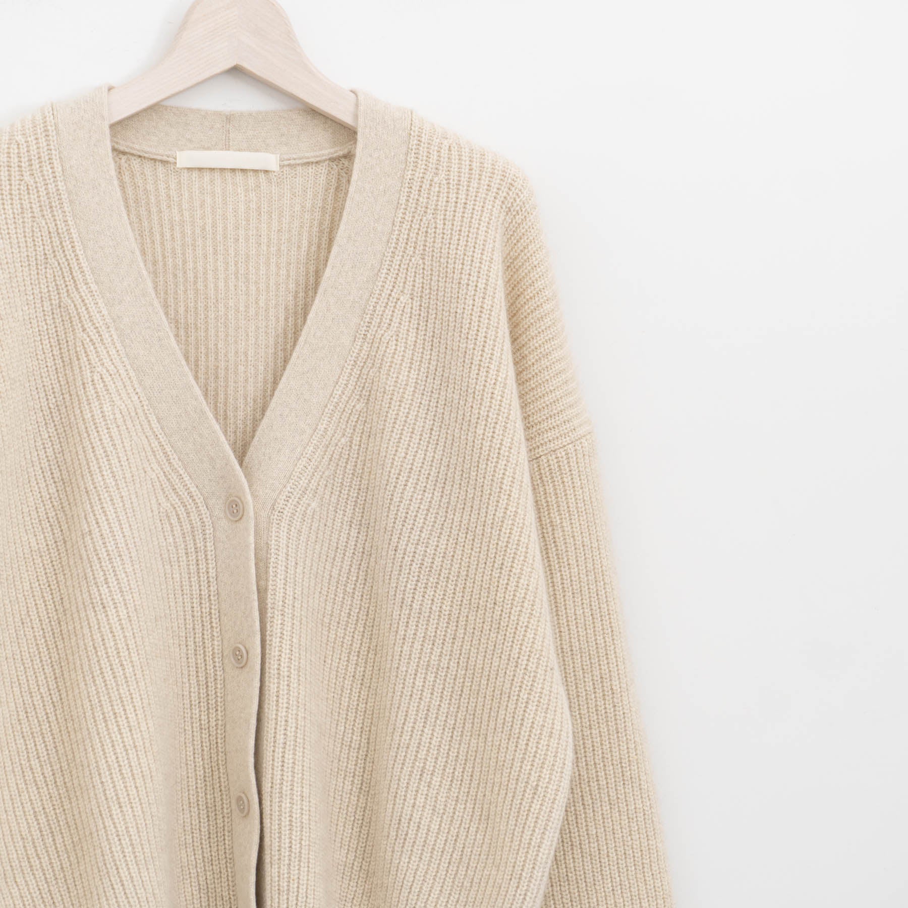 畦編みで仕立てたカーディガンは、ほどよい厚みがあり、身体をやさしく包み込む一着。