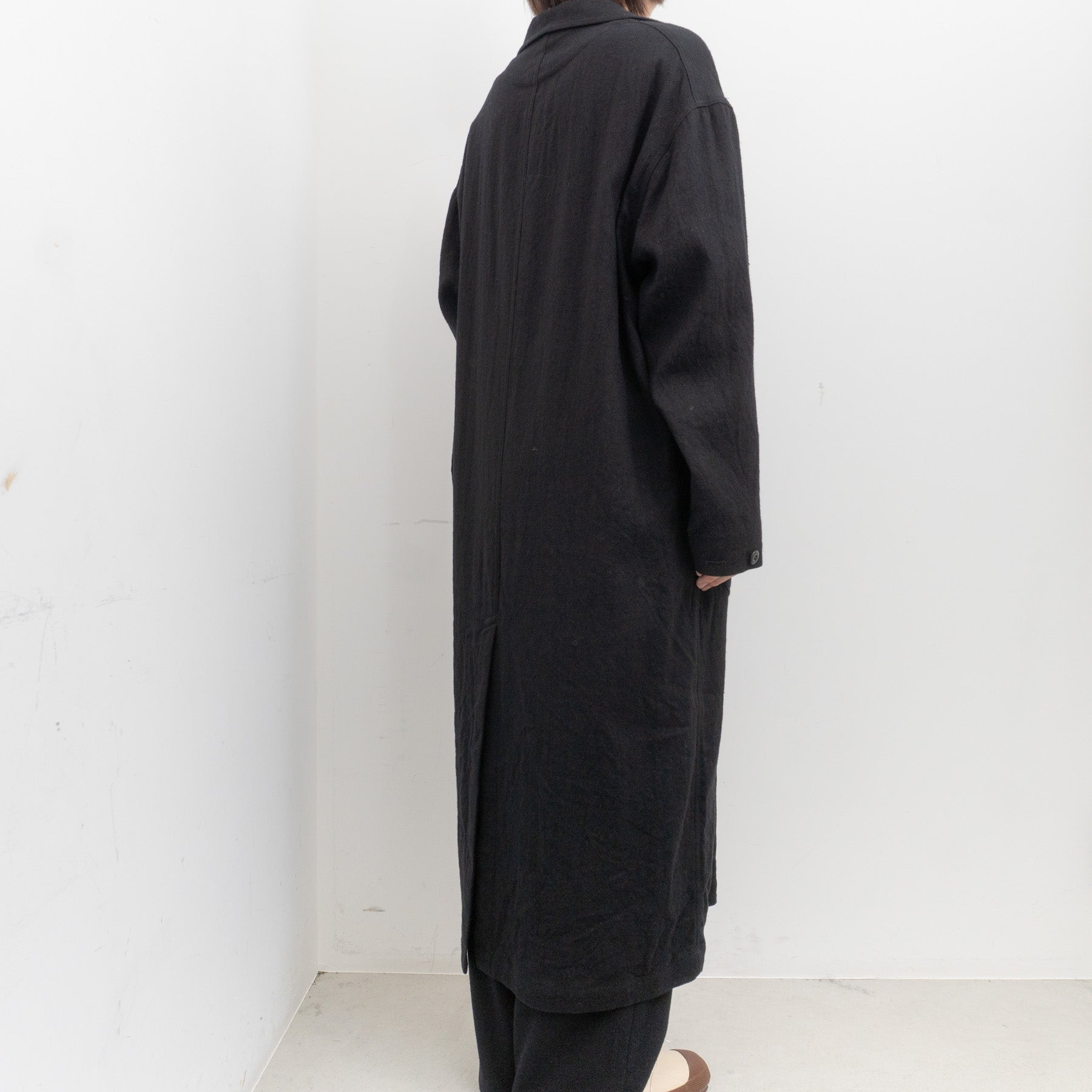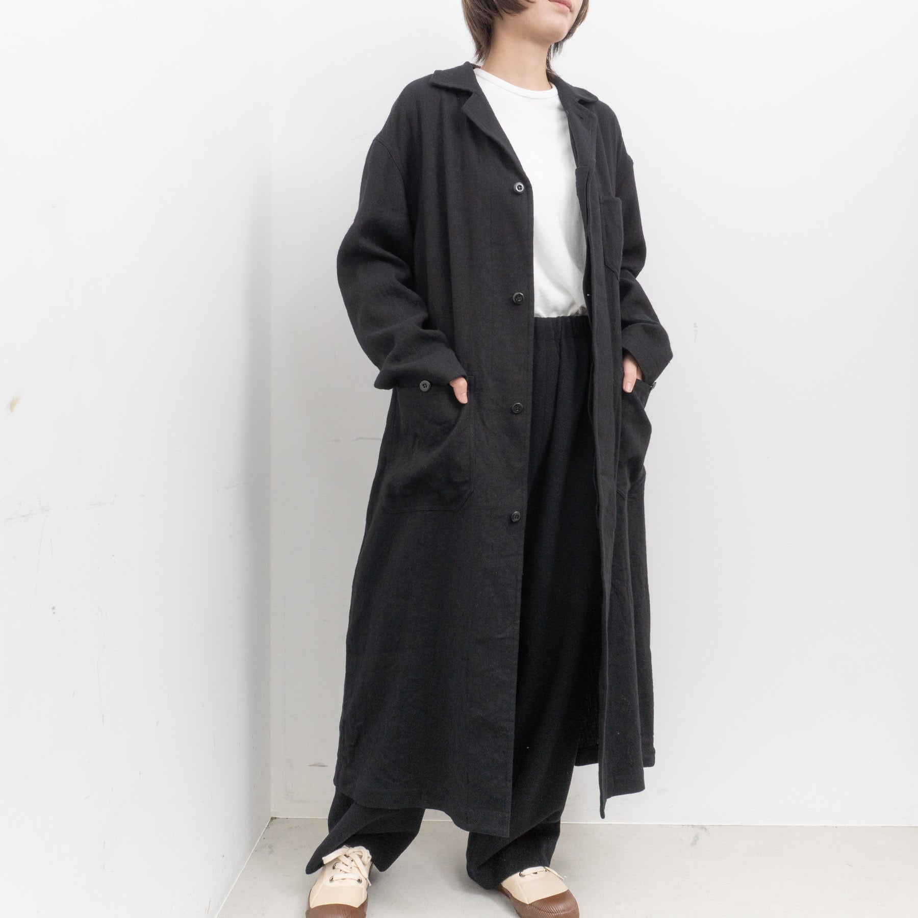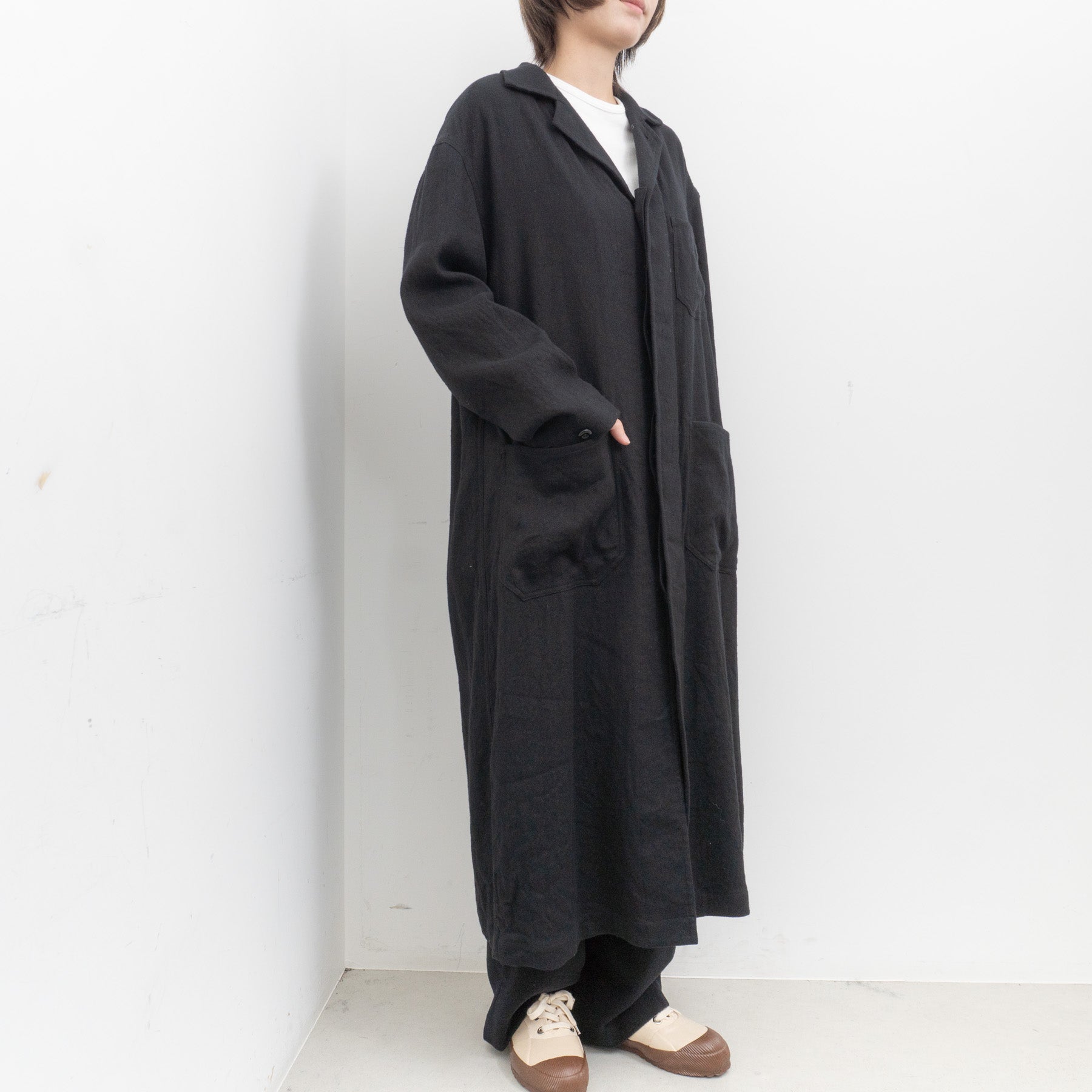 オーバーサイズデザインのロングワークコート。チクチクしないふわっと柔らかな上質なラムウールの風合いが楽しめるヘリンボン生地。上質な生地をまとうようにバサッと羽織るのが楽しいコートです。裏地付きで軽めのコートの防寒性です。袖口に調整できるボタン付き。軽く折り返して着ても素敵です。21AWリネコットンツイルと同デザイン。