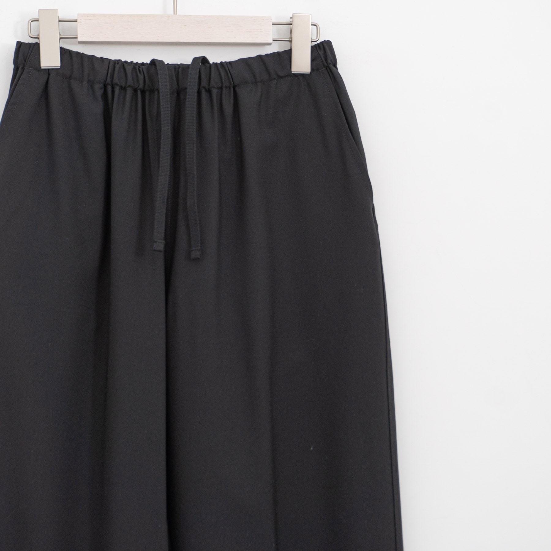 ウエストはゴム+紐で調節可能、ゆったりとしたワタリから裾にかけてテーパードを効かせたシルエットです。
