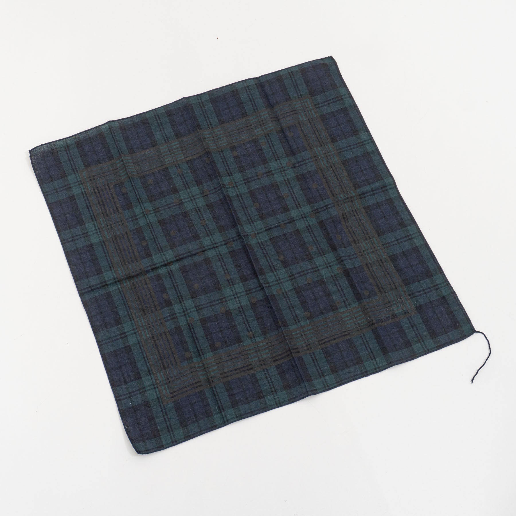 ブラックウォッチのバンダナ生地に、裏面からバンダナ柄をプリントした一枚。 さりげない柄の重なりが、奥行きのある表情を生み出します。 首元や頭に巻いたり、ハンカチとしても使える、日常に取り入れやすいアイテムです。