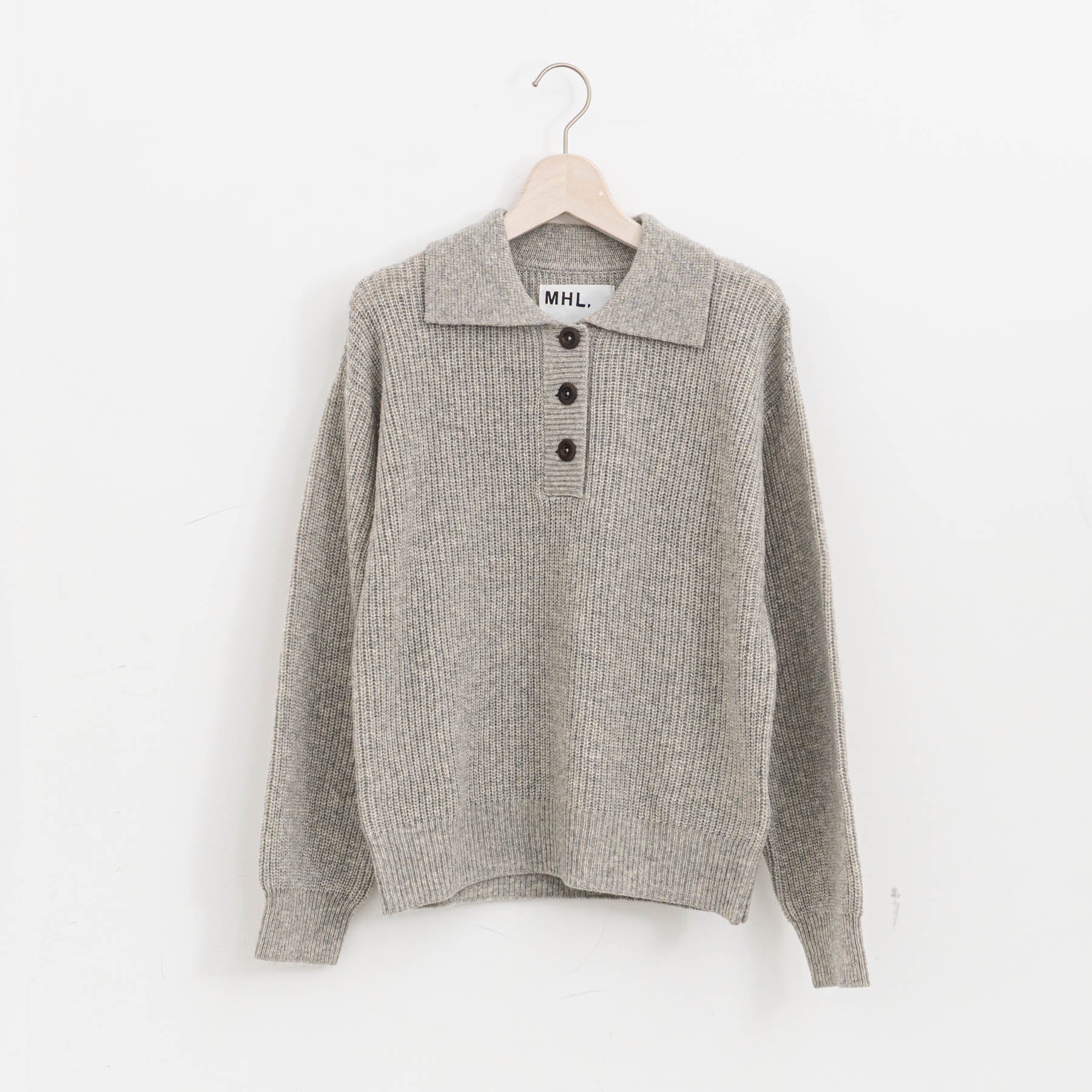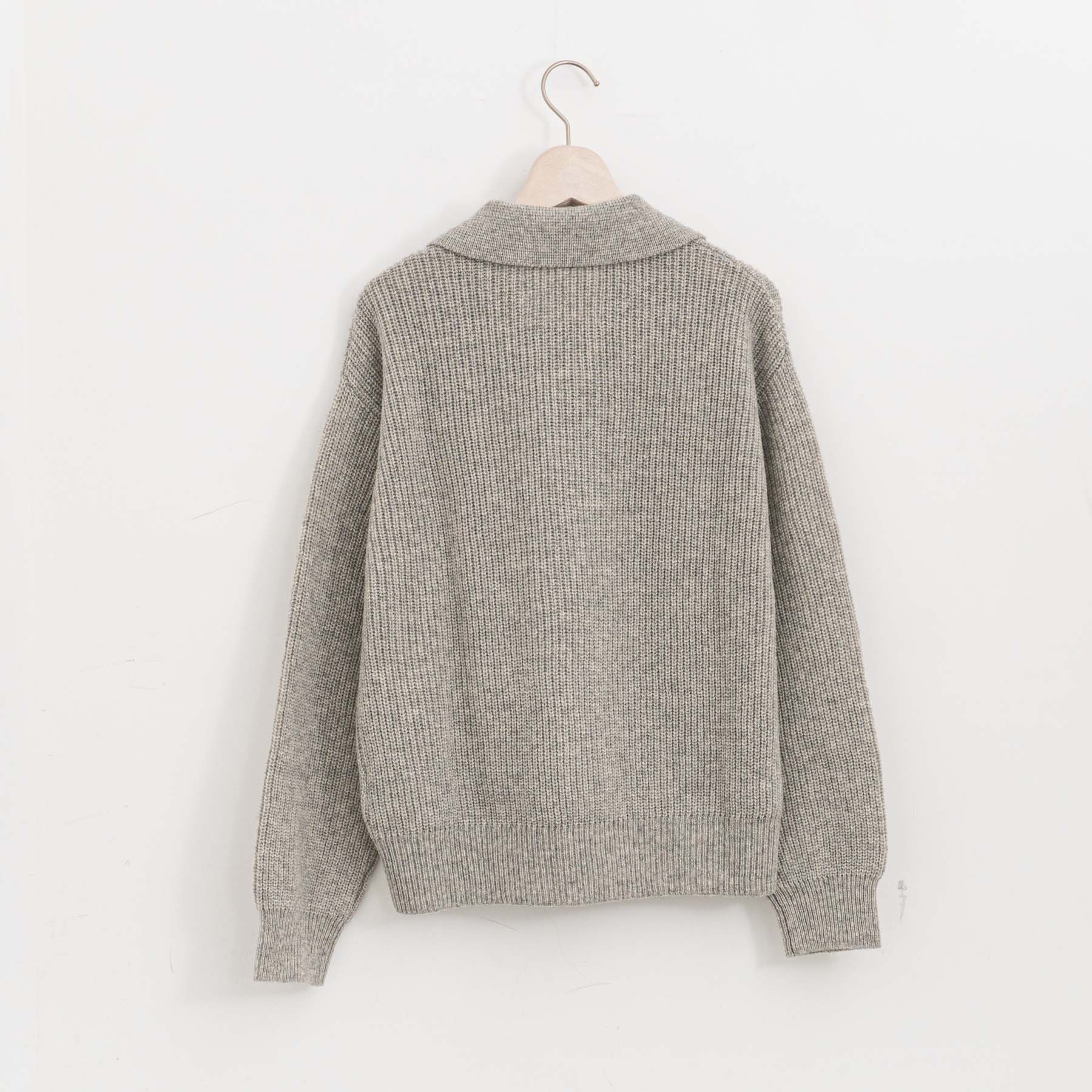 大きな3つのボタンを配したポロセーターは、畦編みの表情に反して驚くほど軽やか。
