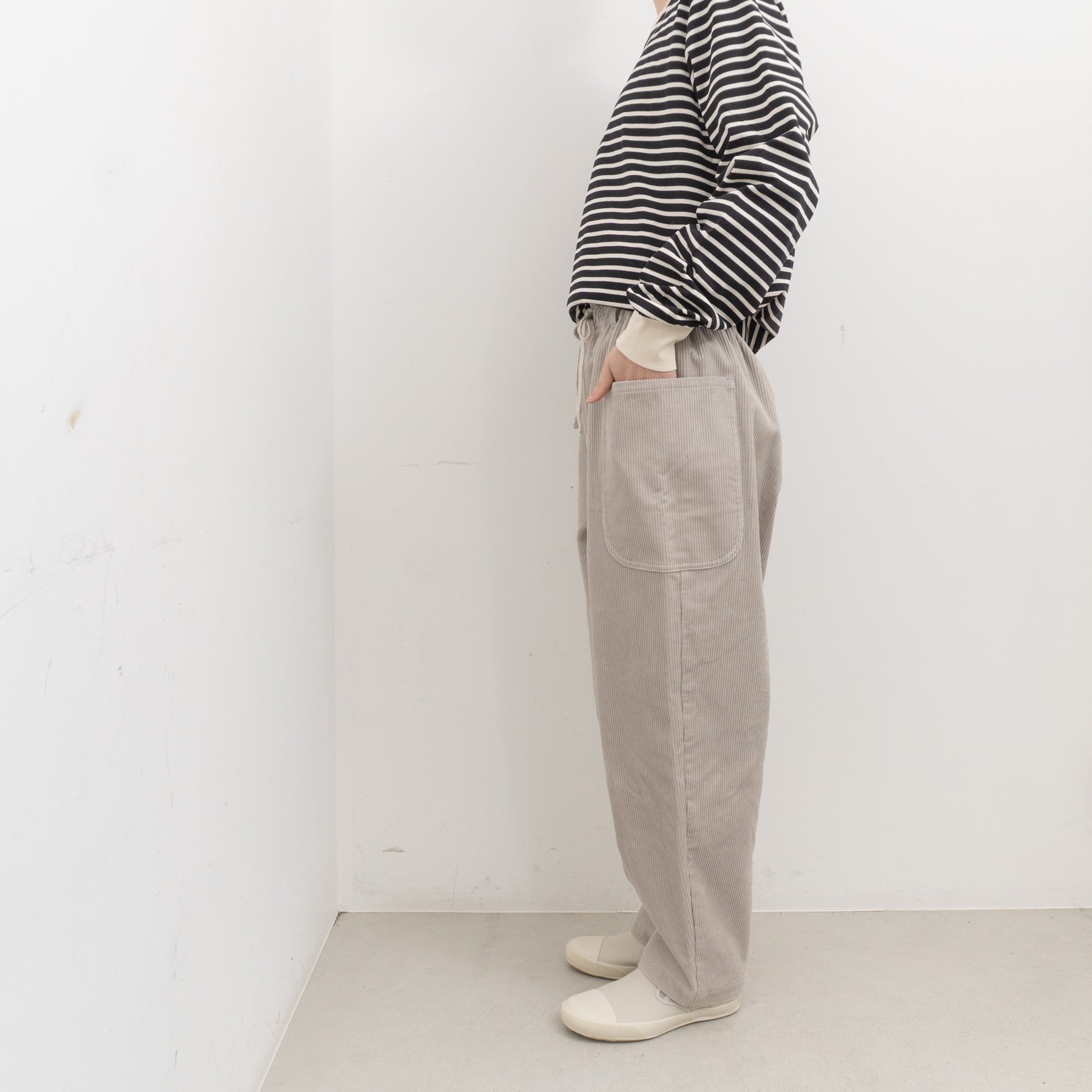・ウエスト紐は内側/外側どちらからも結べる仕様で、着こなしの幅を持たせています