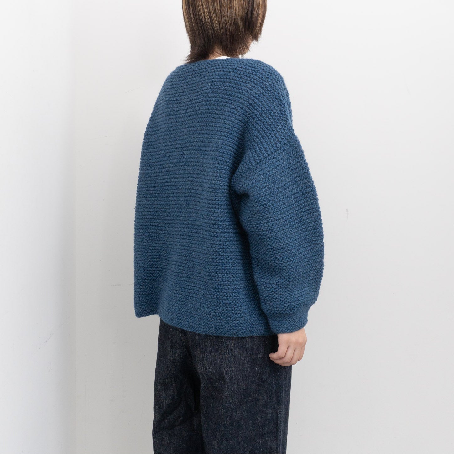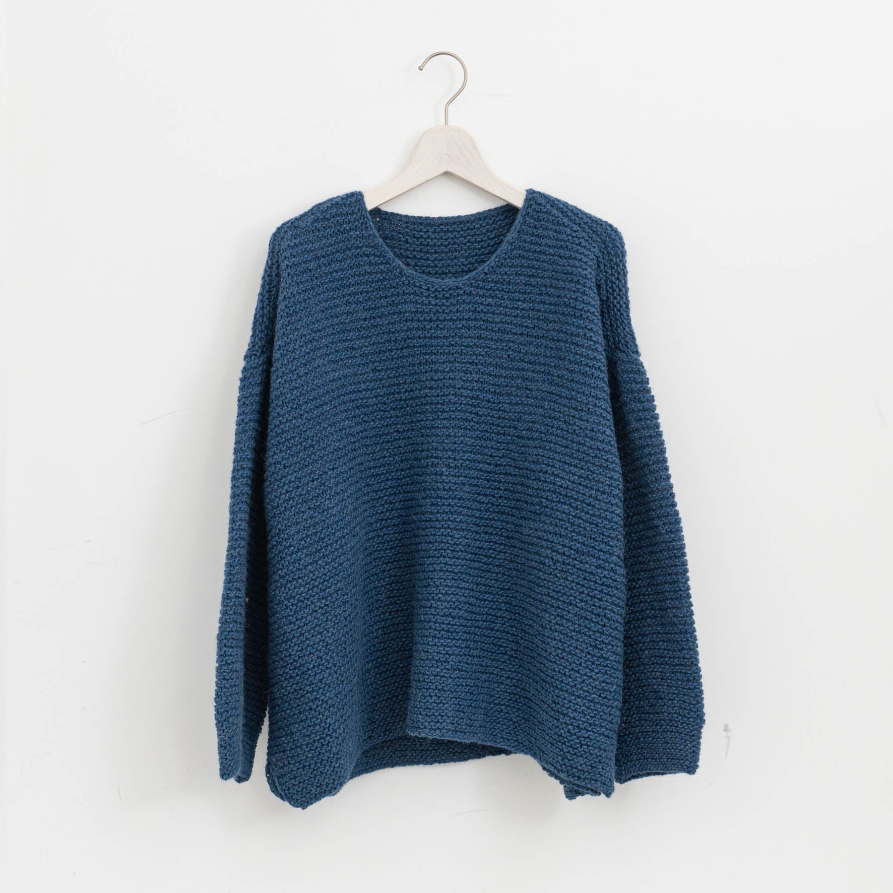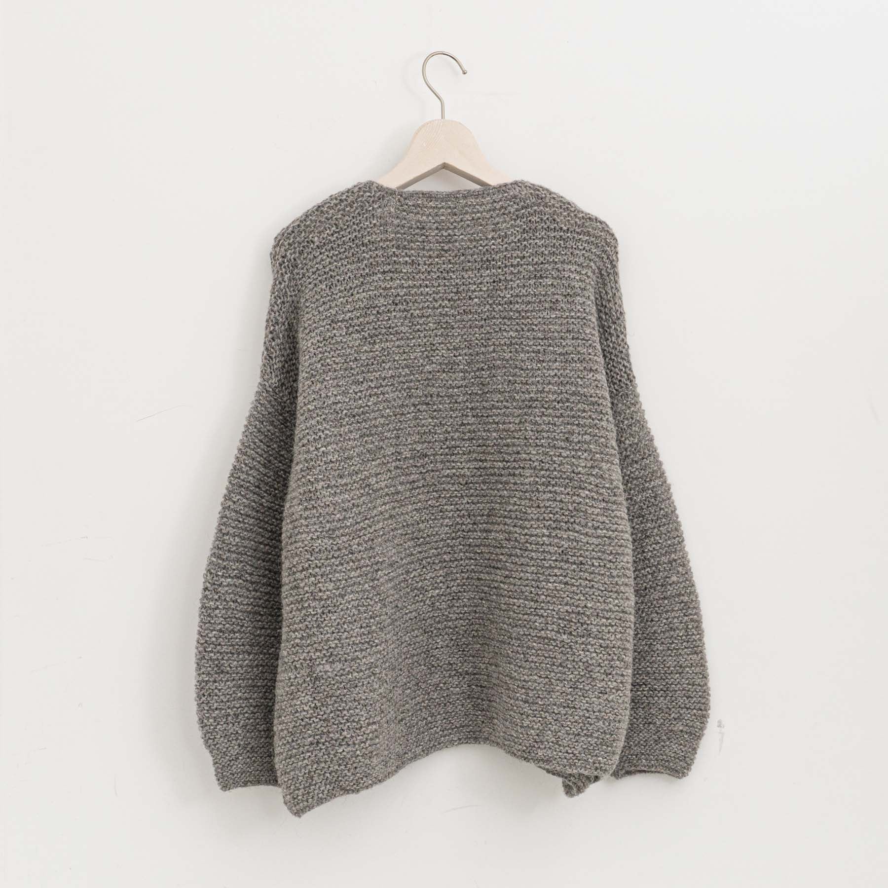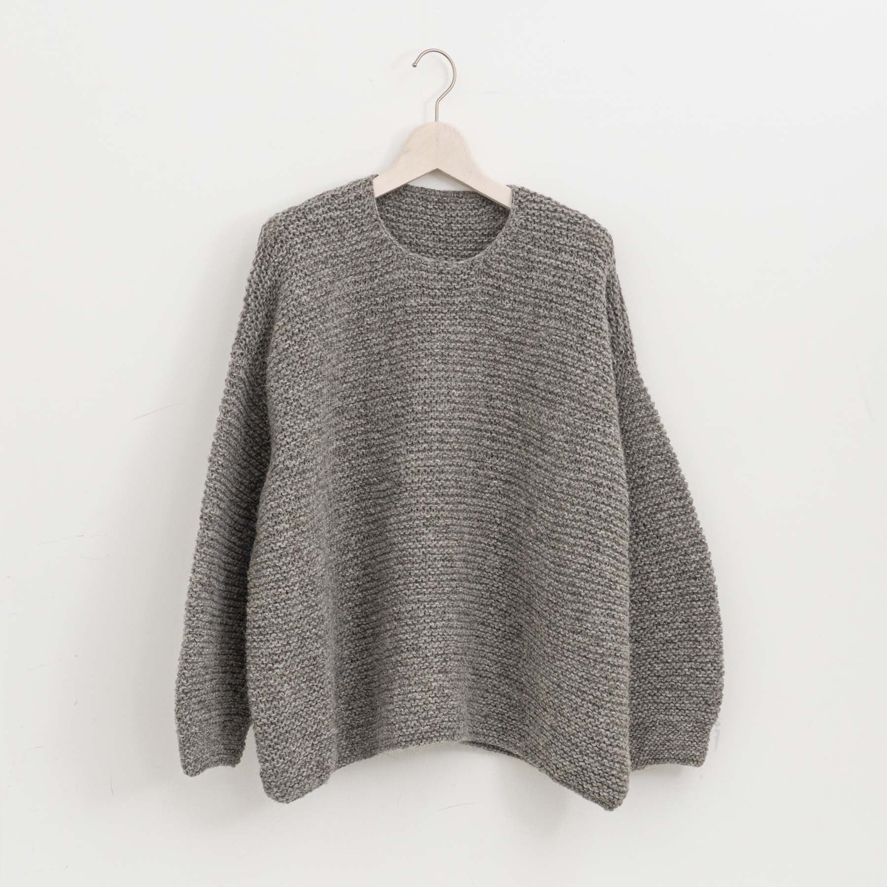 糸の存在感と、機械編みでは表現できない手編み特有の編地を活かすために、あえてシンプルで着やすく、飽きのこないデザインに仕上げています。