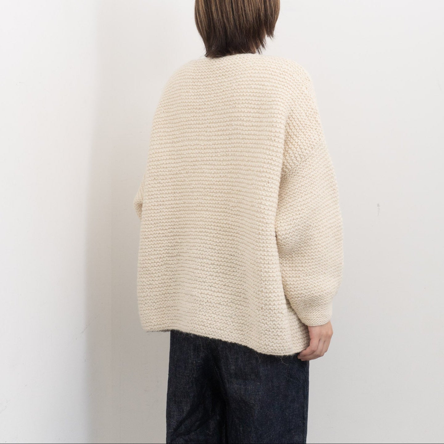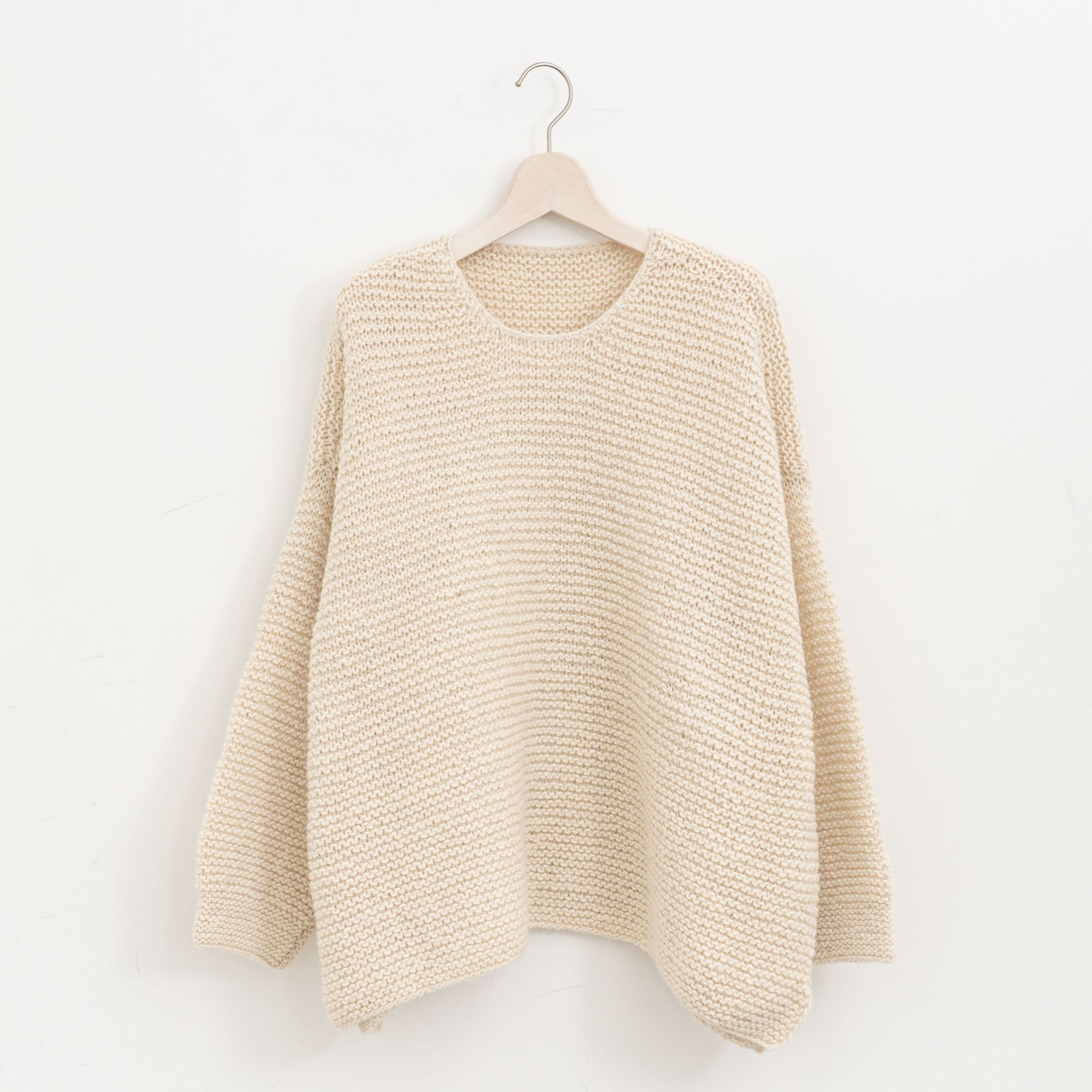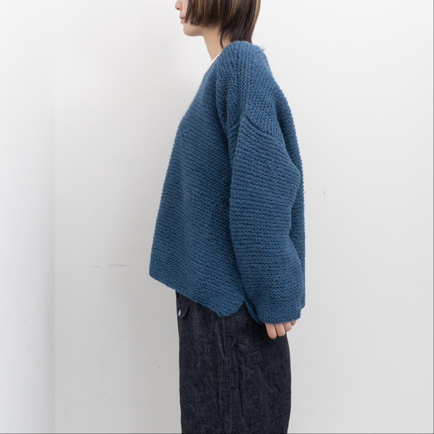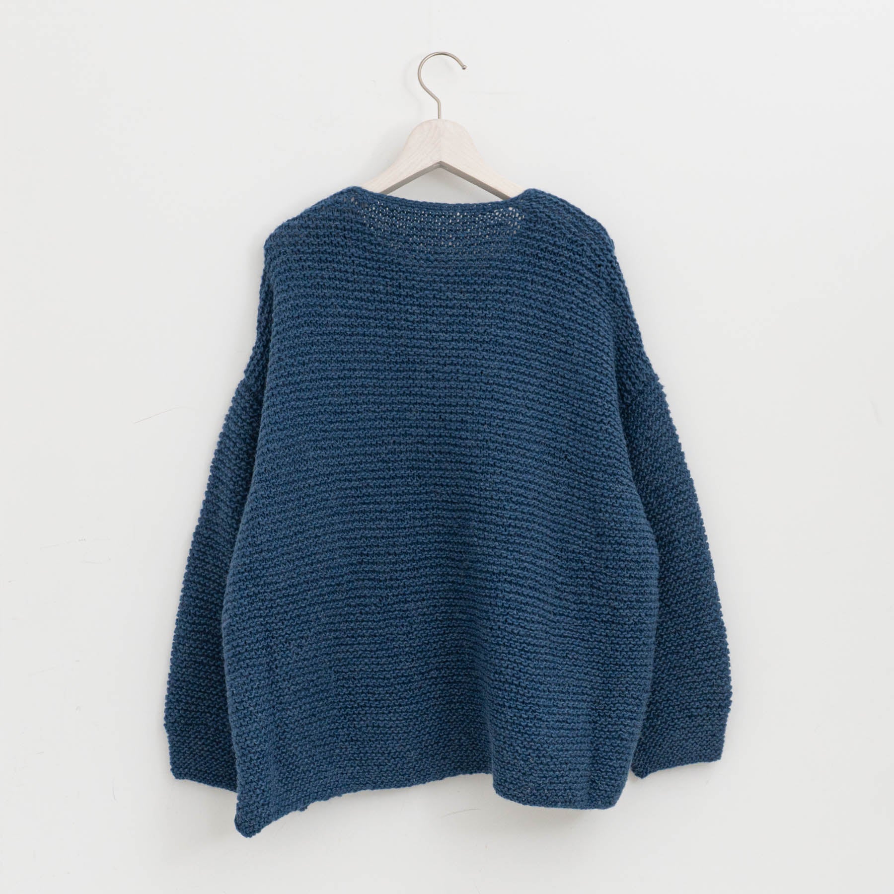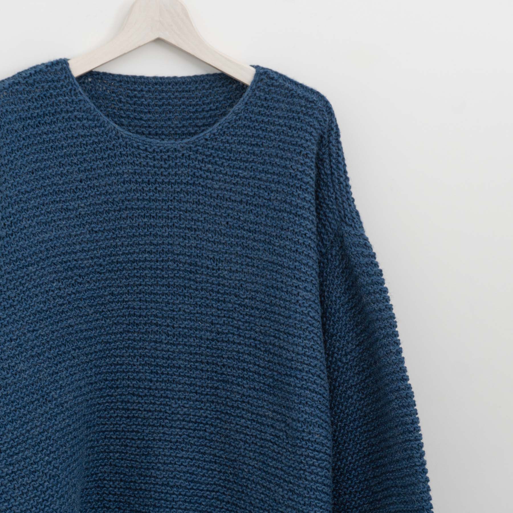 糸の存在感と、機械編みでは表現できない手編み特有の編地を活かすために、あえてシンプルで着やすく、飽きのこないデザインに仕上げています。