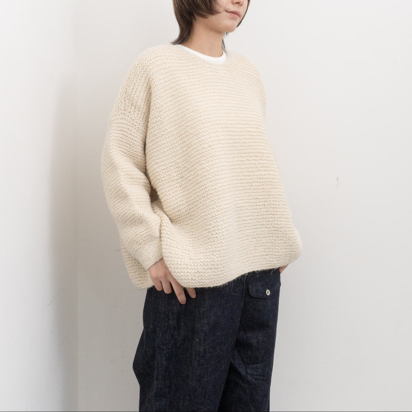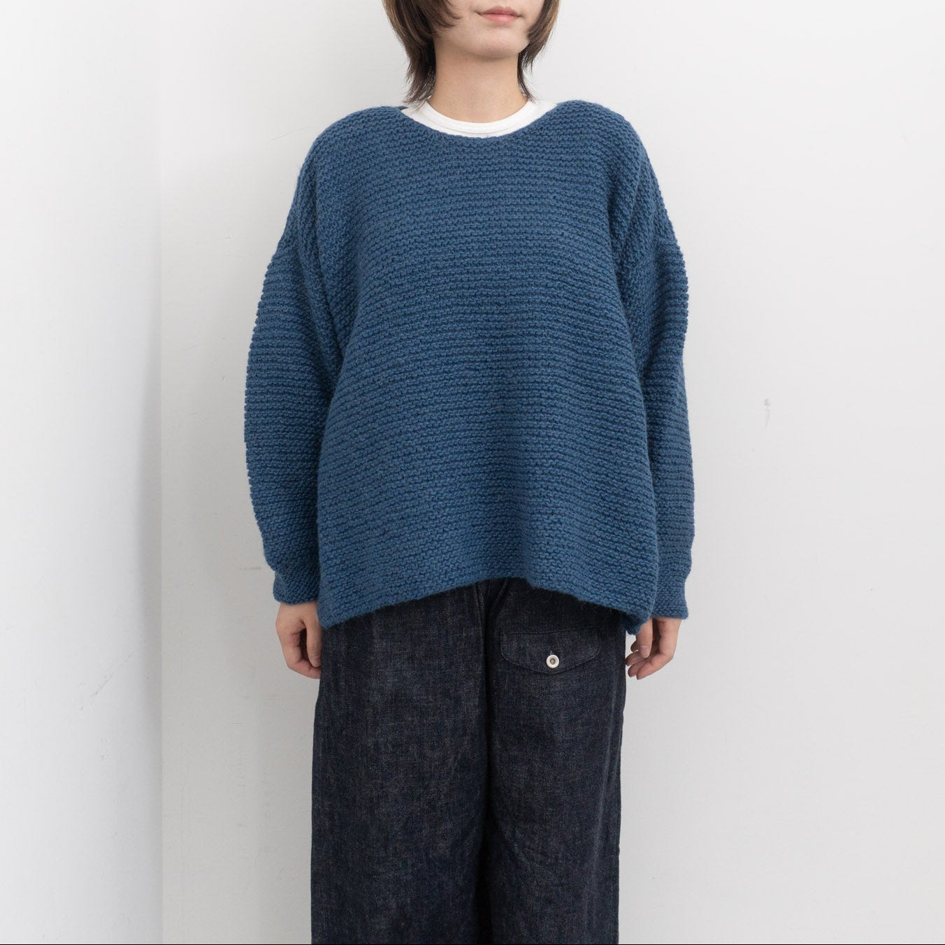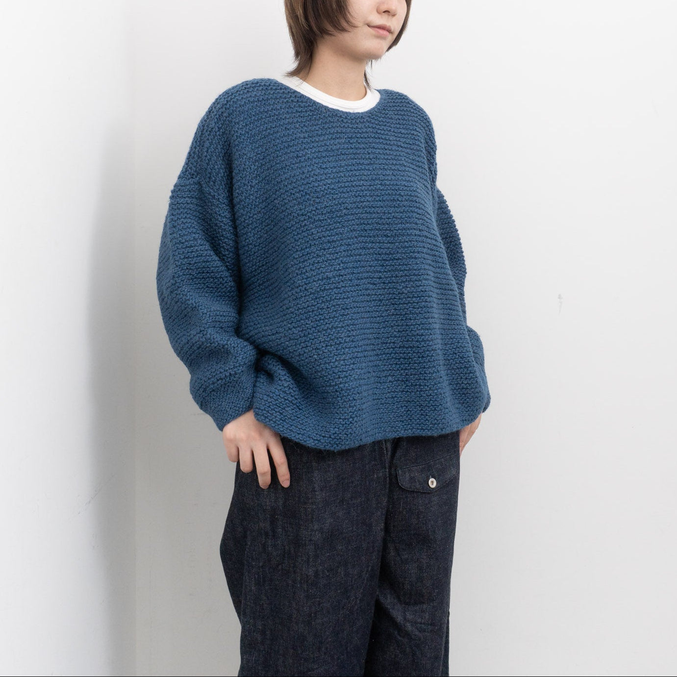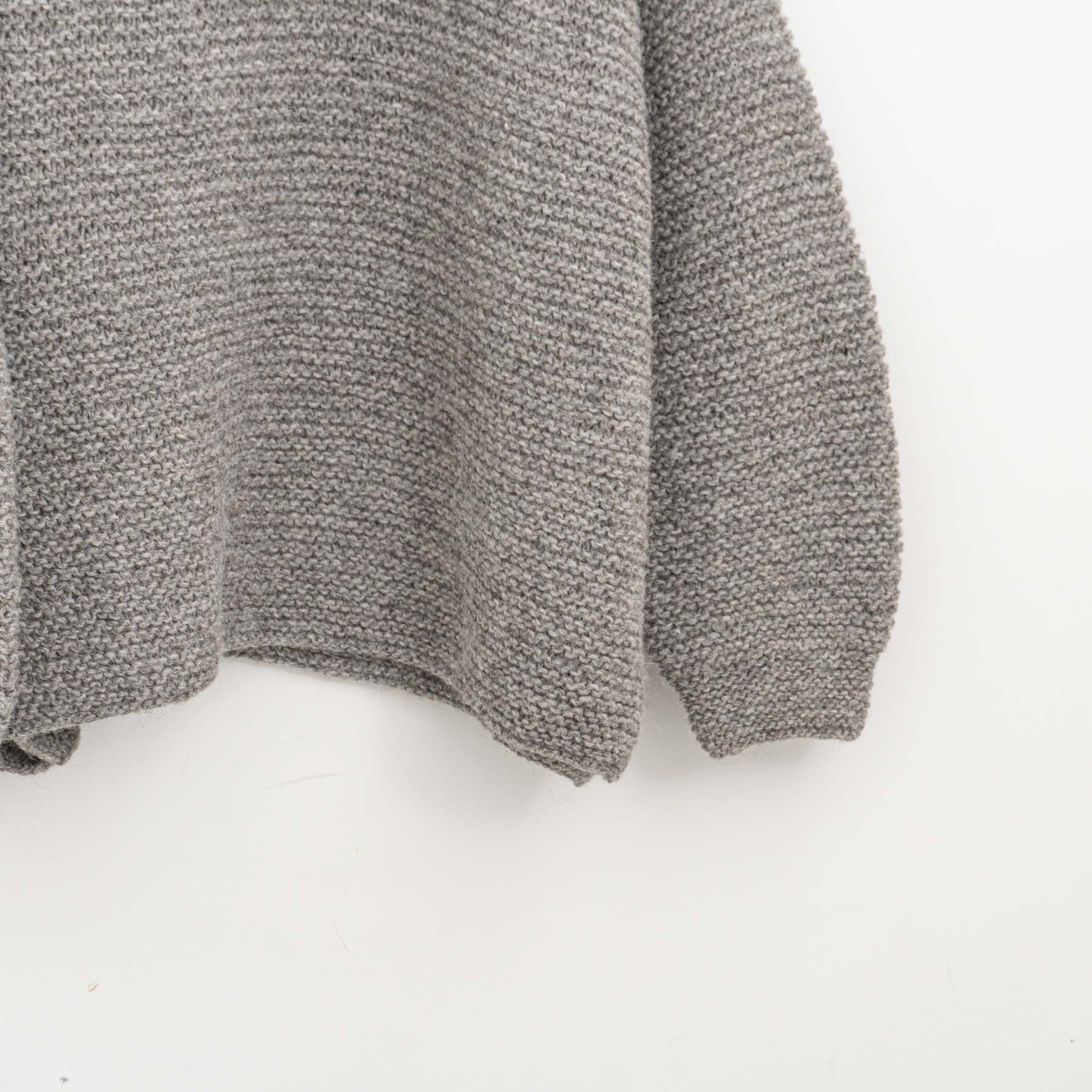 糸の存在感と、機械編みでは表現できない手編み特有の編地を活かすために、あえてシンプルで着やすく、飽きのこないデザインに仕上げています。