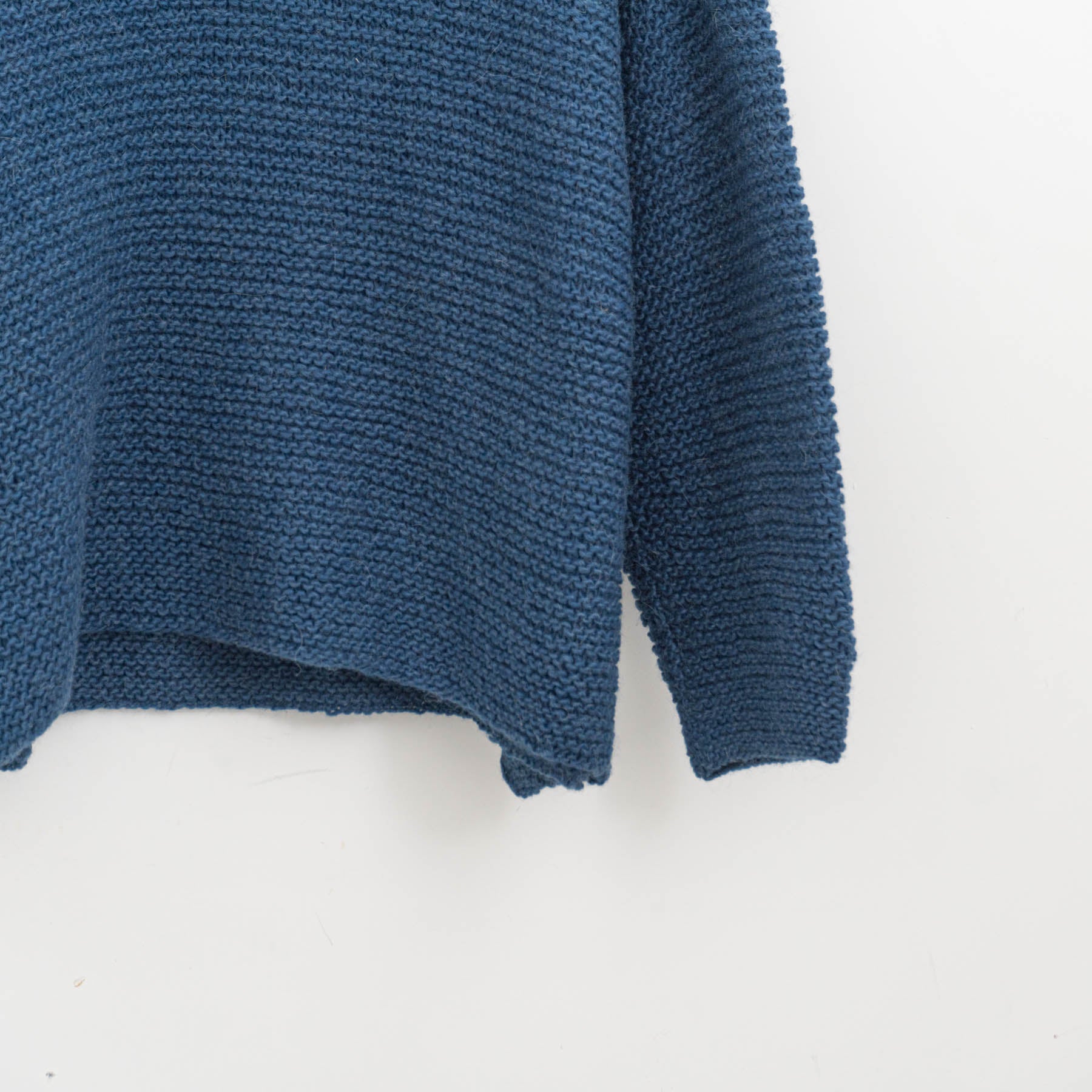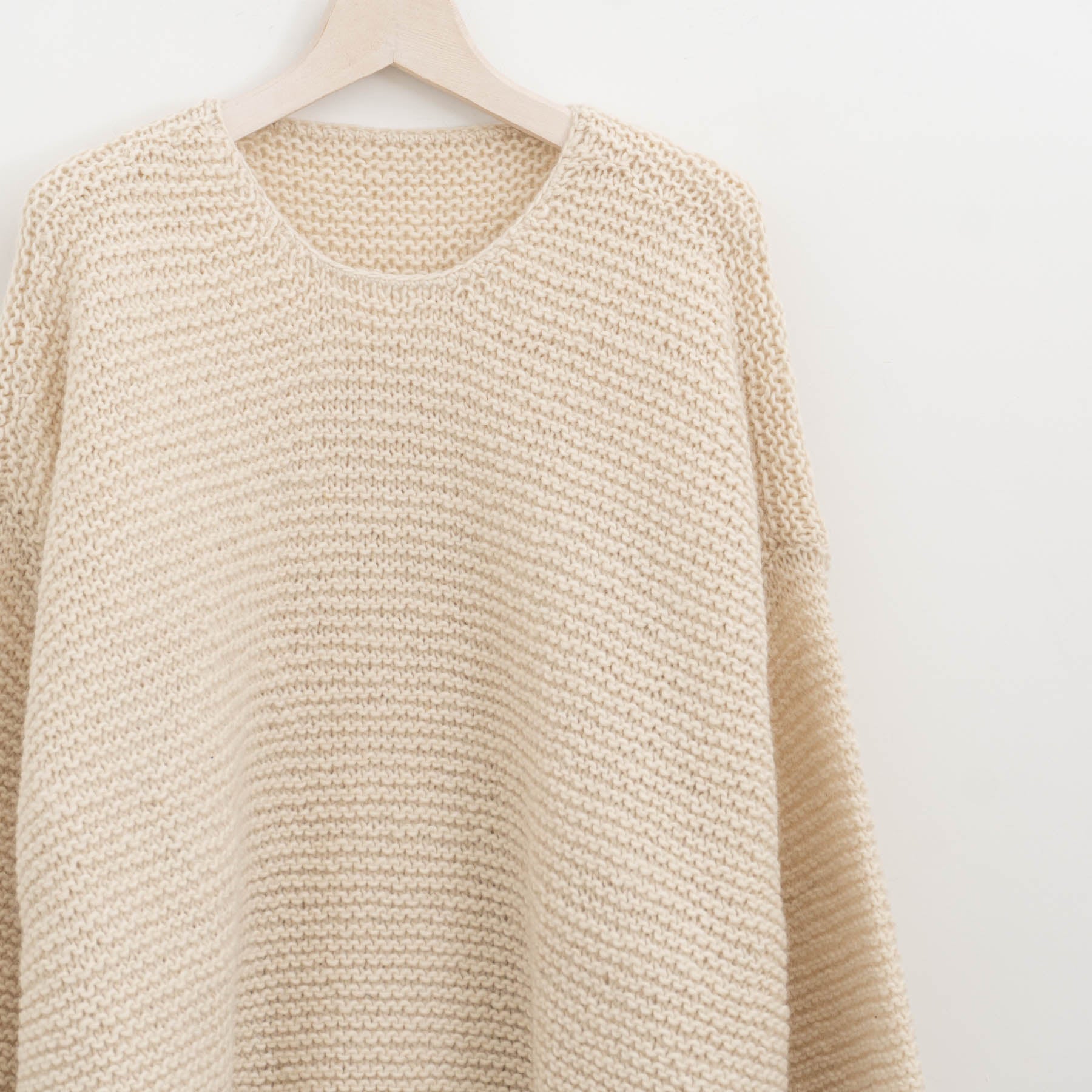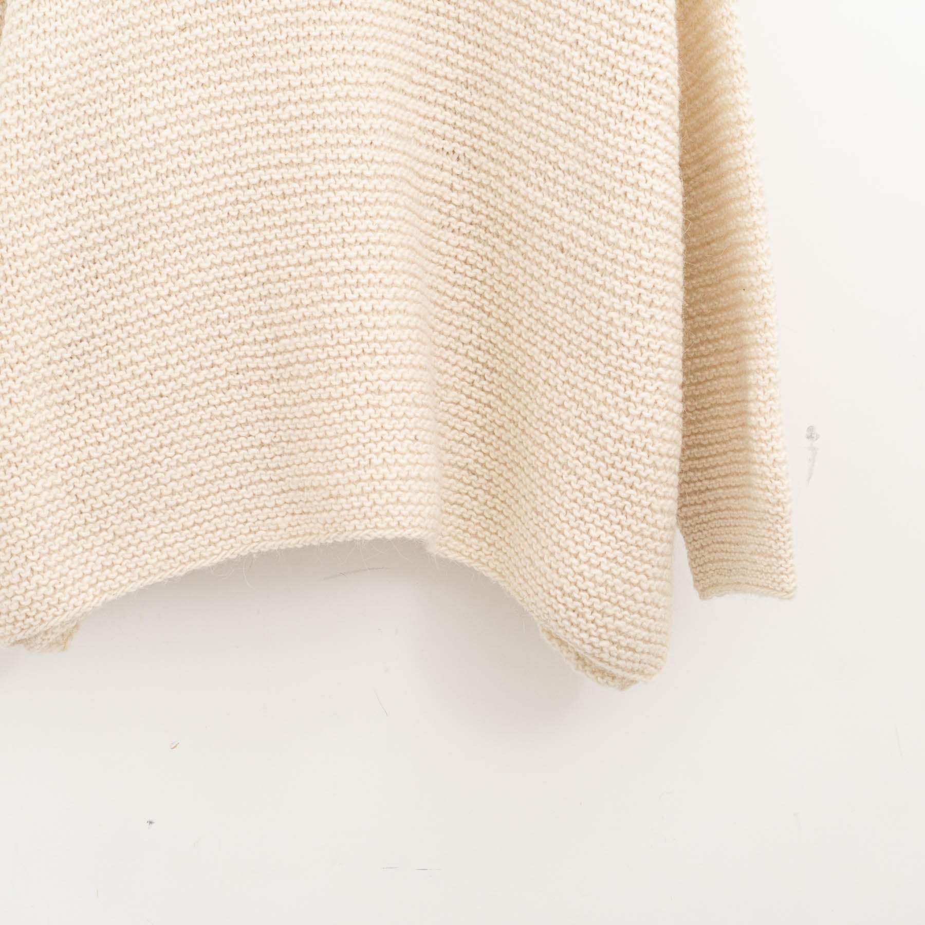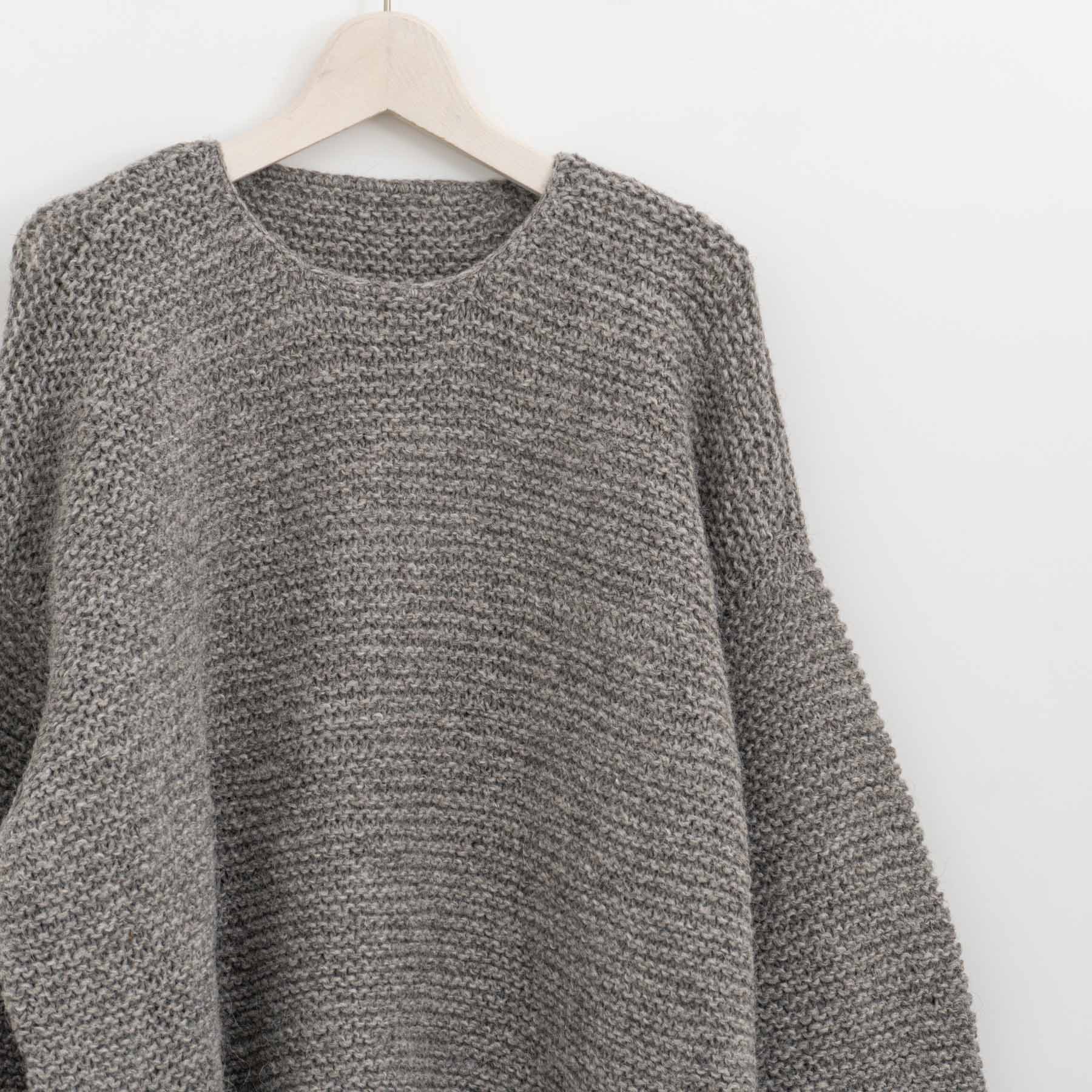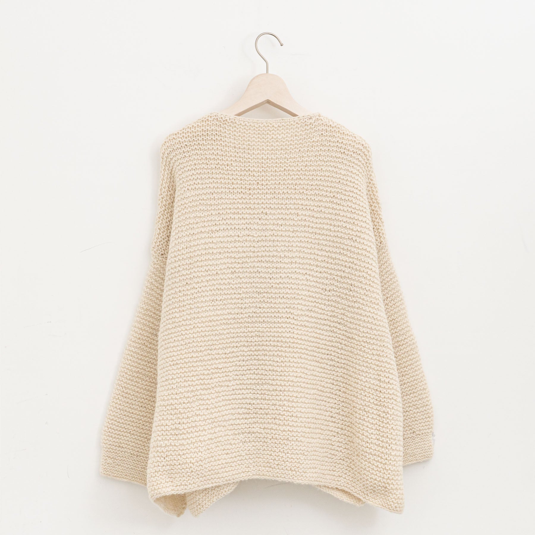 糸の存在感と、機械編みでは表現できない手編み特有の編地を活かすために、あえてシンプルで着やすく、飽きのこないデザインに仕上げています。