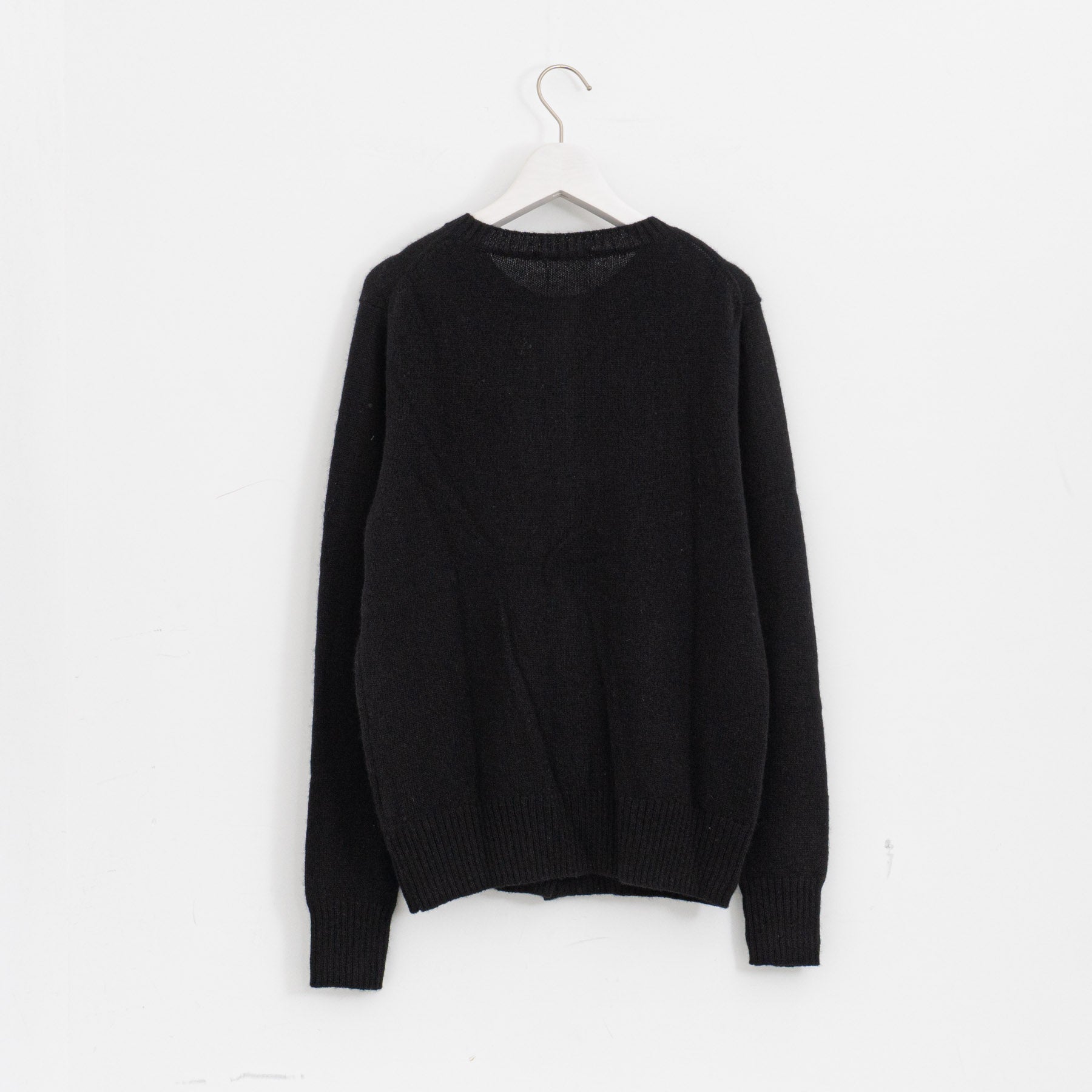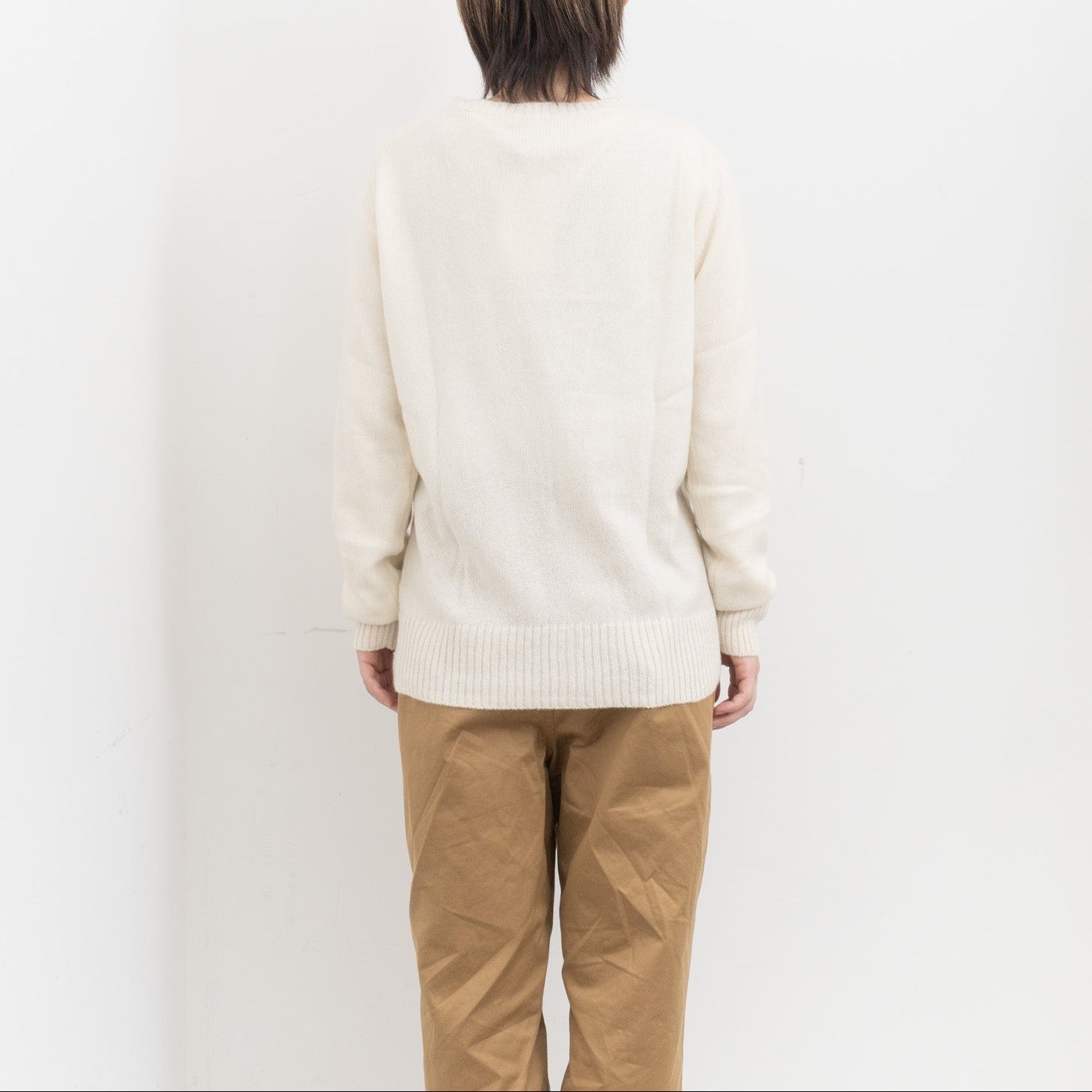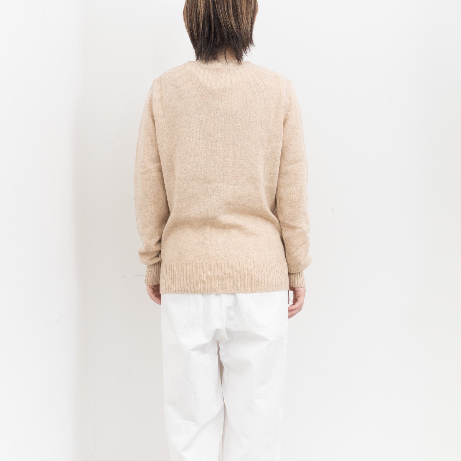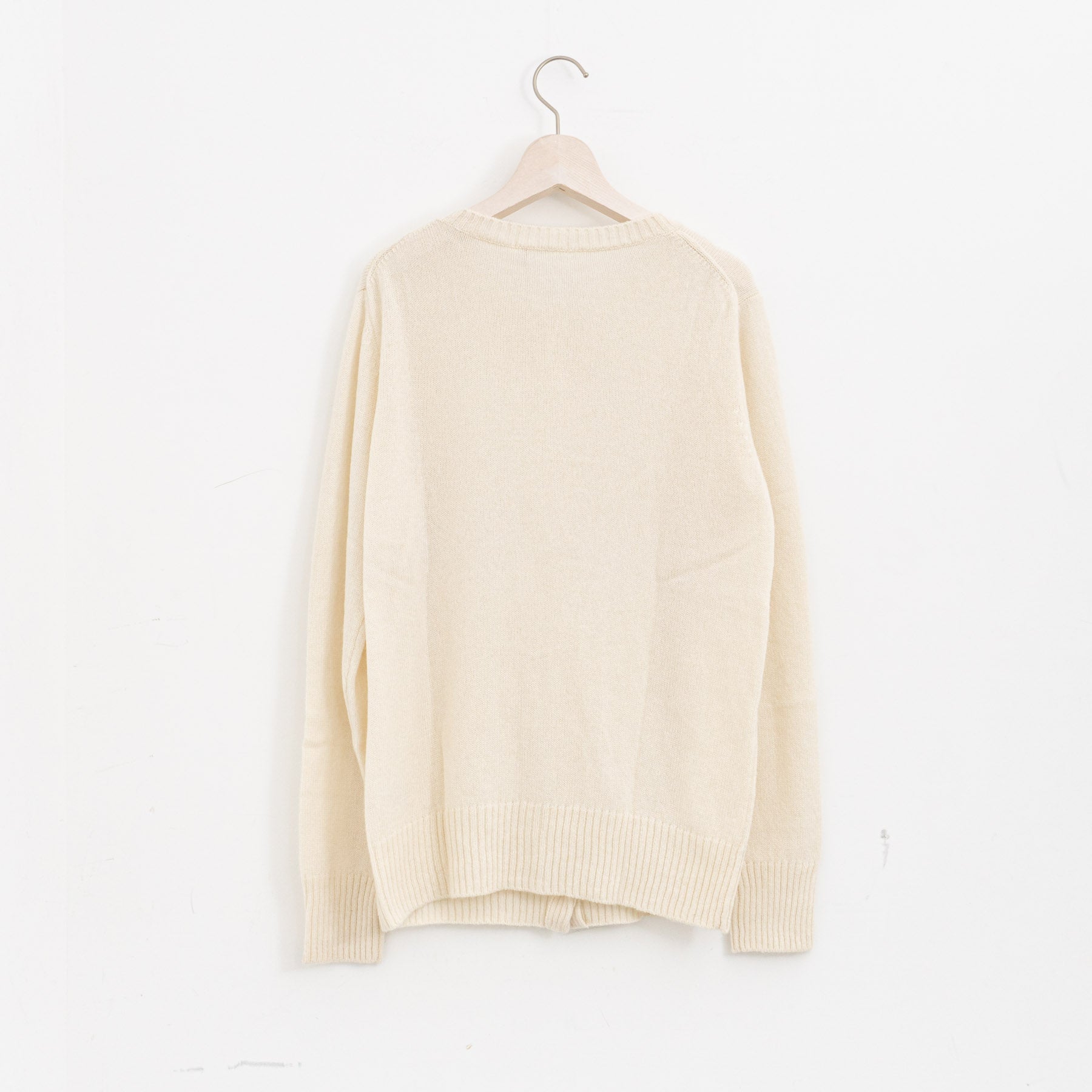 自社制作の20番手ファインソフトカシミヤ糸を使用したクルーネックニットです。26番手より太い糸をあまく編み上げることで空気を含み、ふんわりとした膨らみを感じられる一枚。
