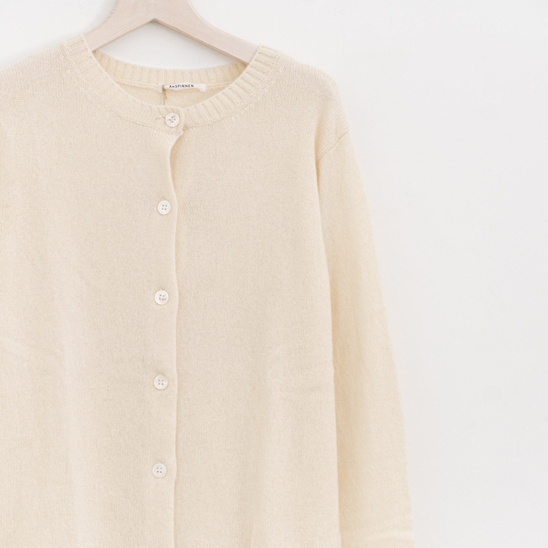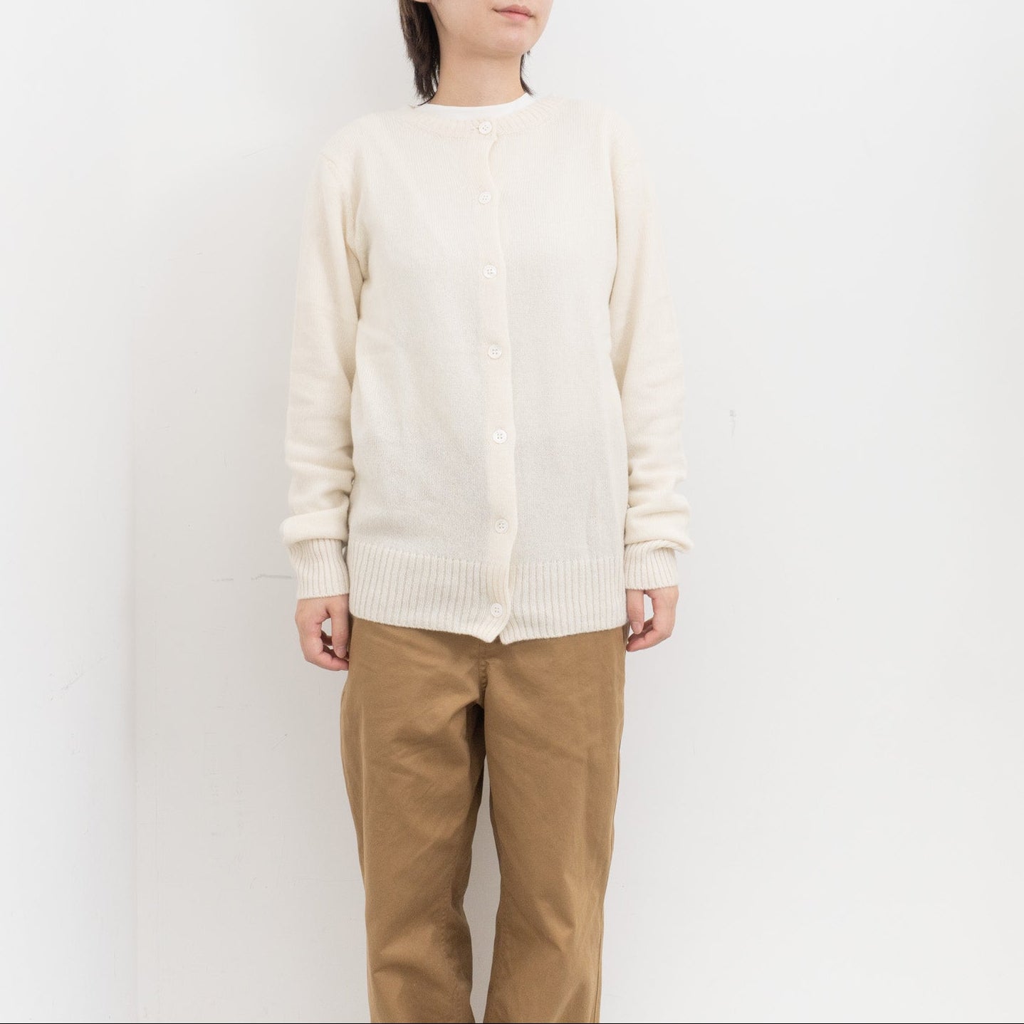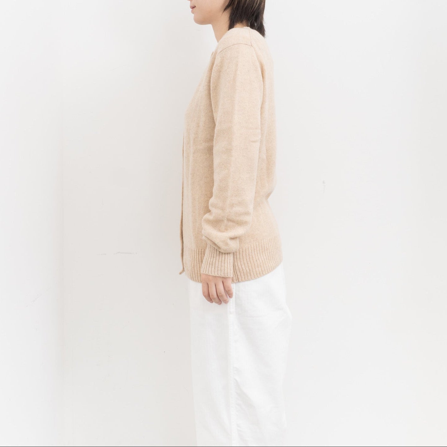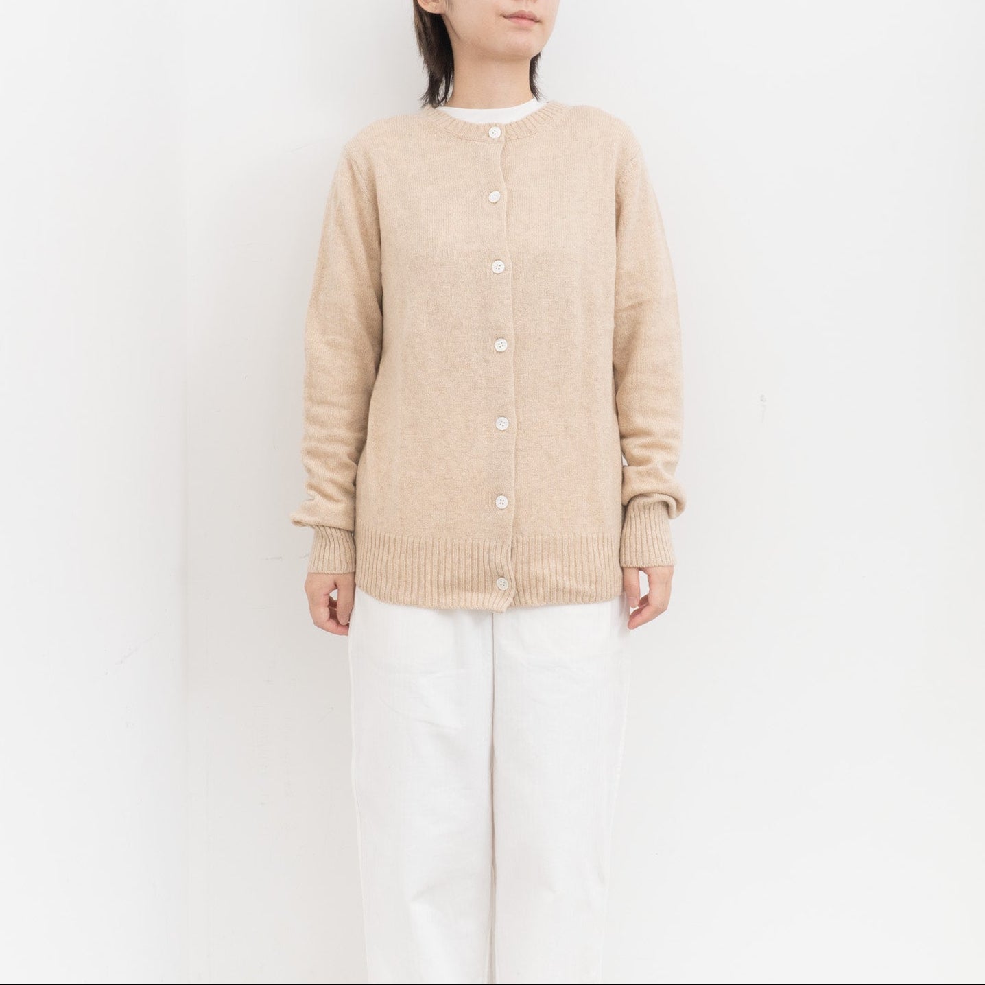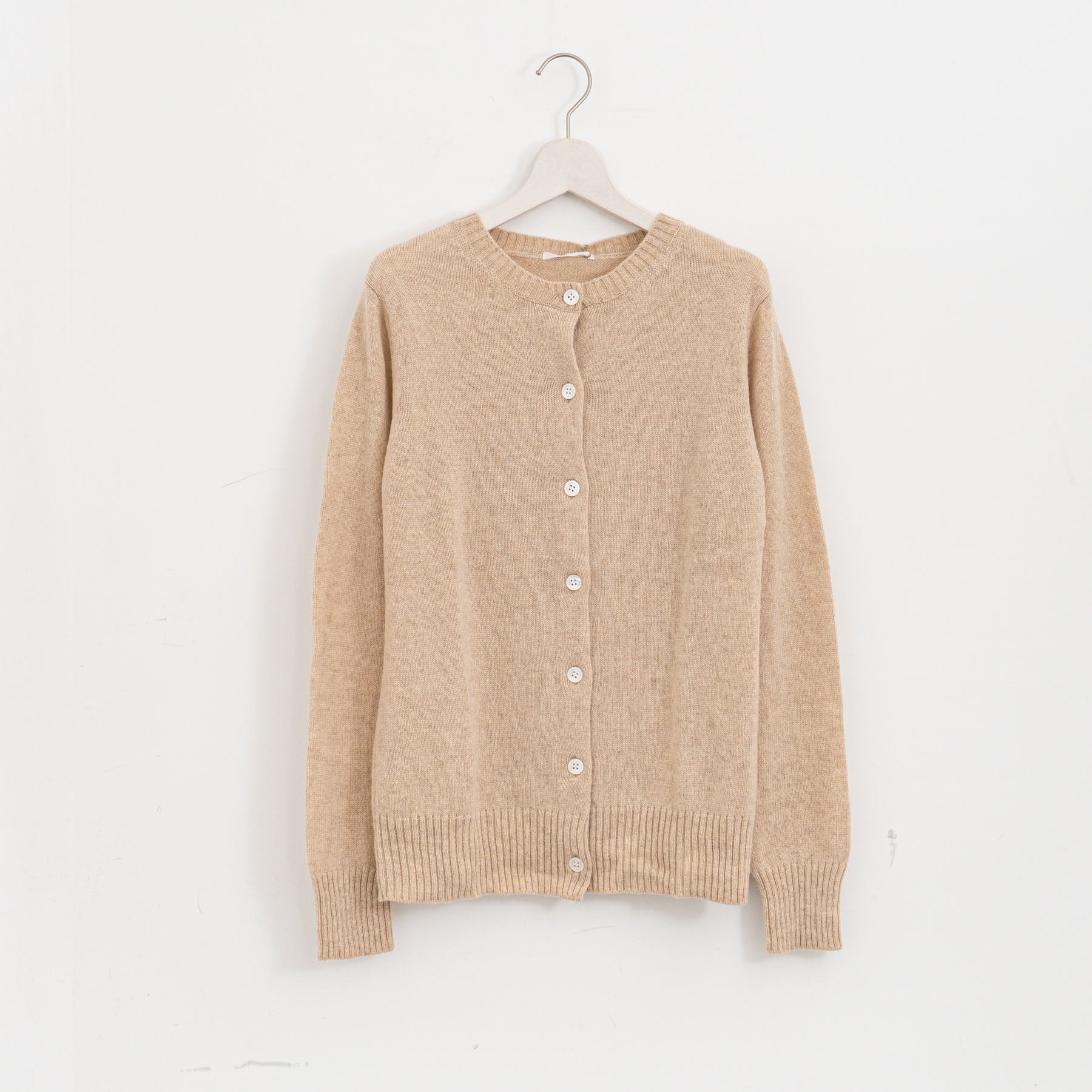 自社制作の20番手ファインソフトカシミヤ糸を使用したクルーネックニットです。26番手より太い糸をあまく編み上げることで空気を含み、ふんわりとした膨らみを感じられる一枚。