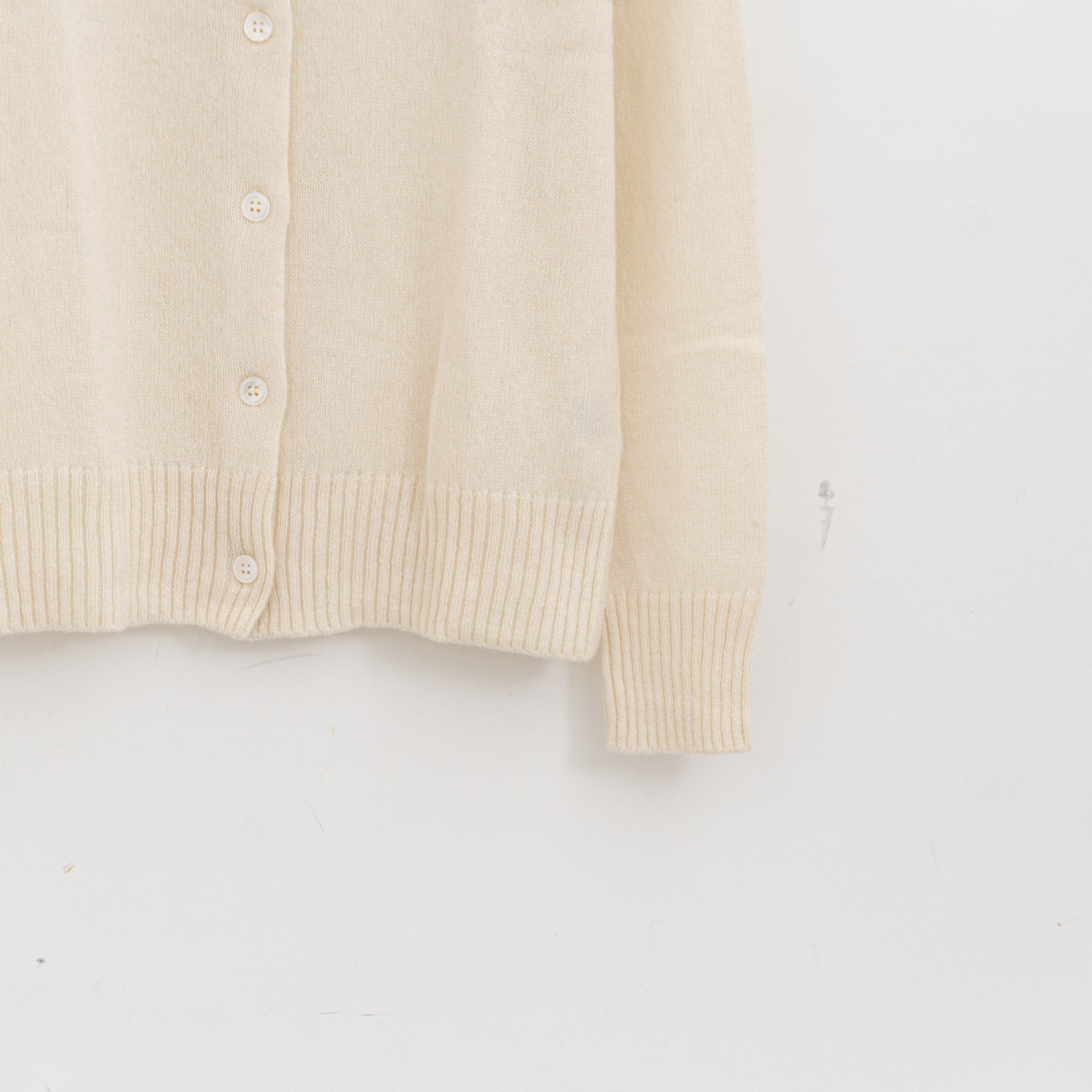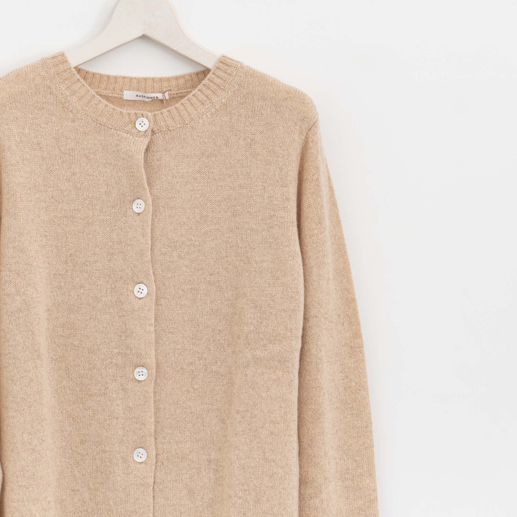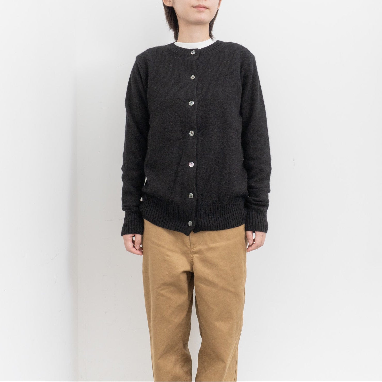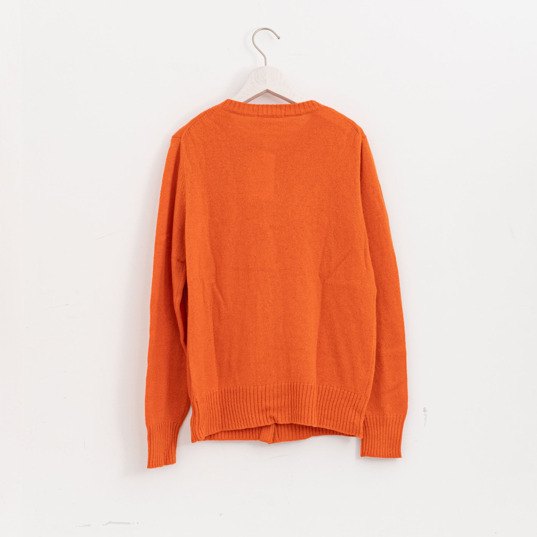 自社制作の20番手ファインソフトカシミヤ糸を使用したクルーネックニットです。26番手より太い糸をあまく編み上げることで空気を含み、ふんわりとした膨らみを感じられる一枚。