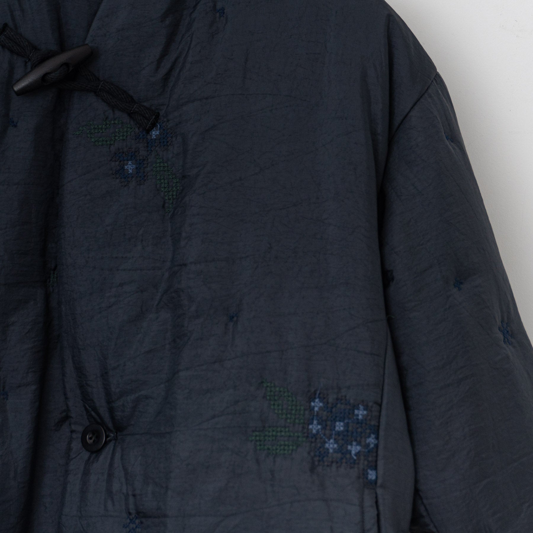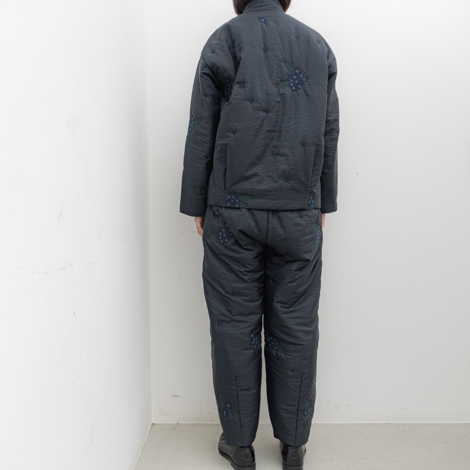 生地は中綿と表地をクロスステッチで留めるように刺繍され、特殊なキルトを使っています。ベースのナイロン地は小さい釜での染色、天日干しによるムラ感、シワ感、風合いが特徴となっています。ベテランの染色職人のこだわりが光る生地に栃木県の多色刺繍機を用いて、一つの柄に何色もの糸をハンドカットで仕上げています。
