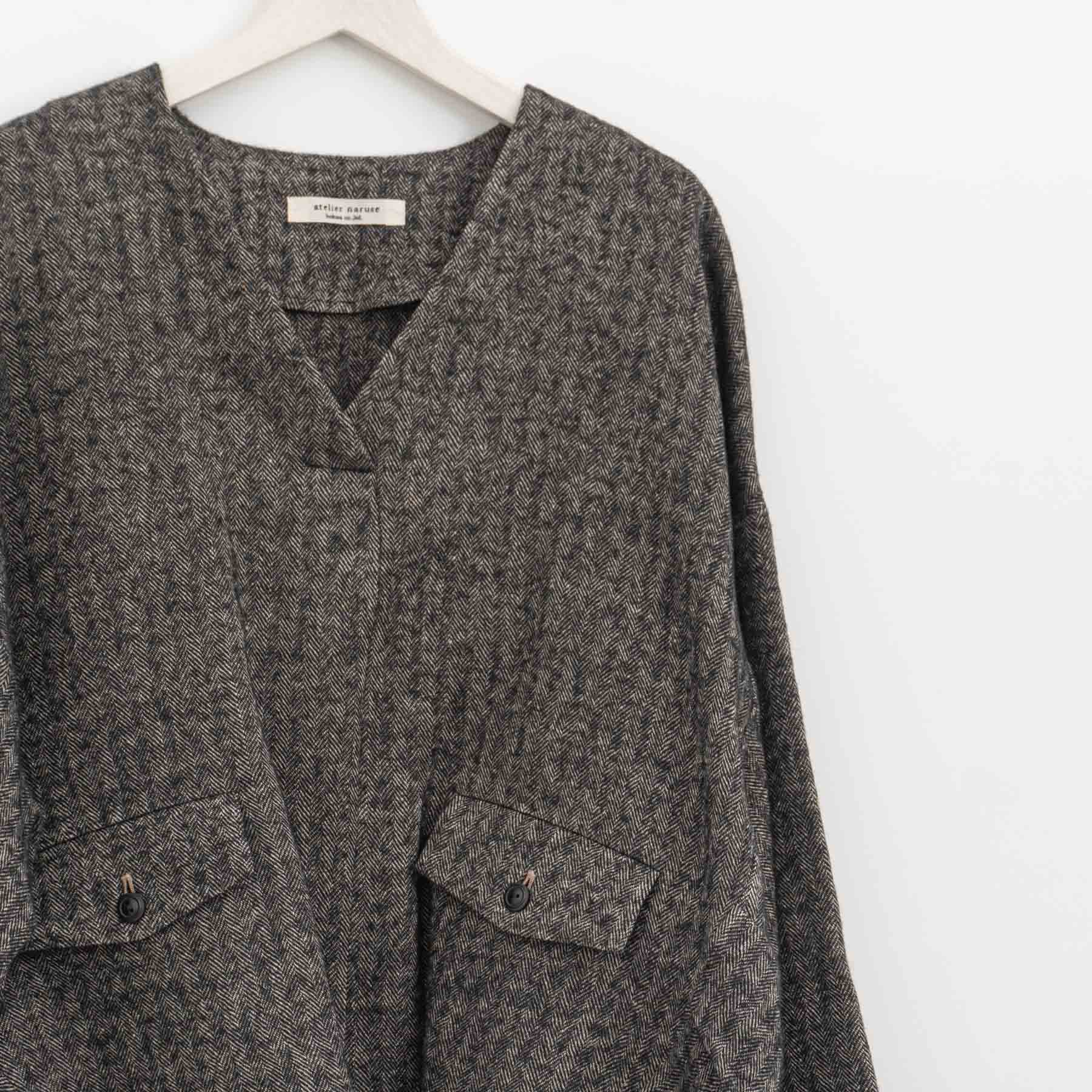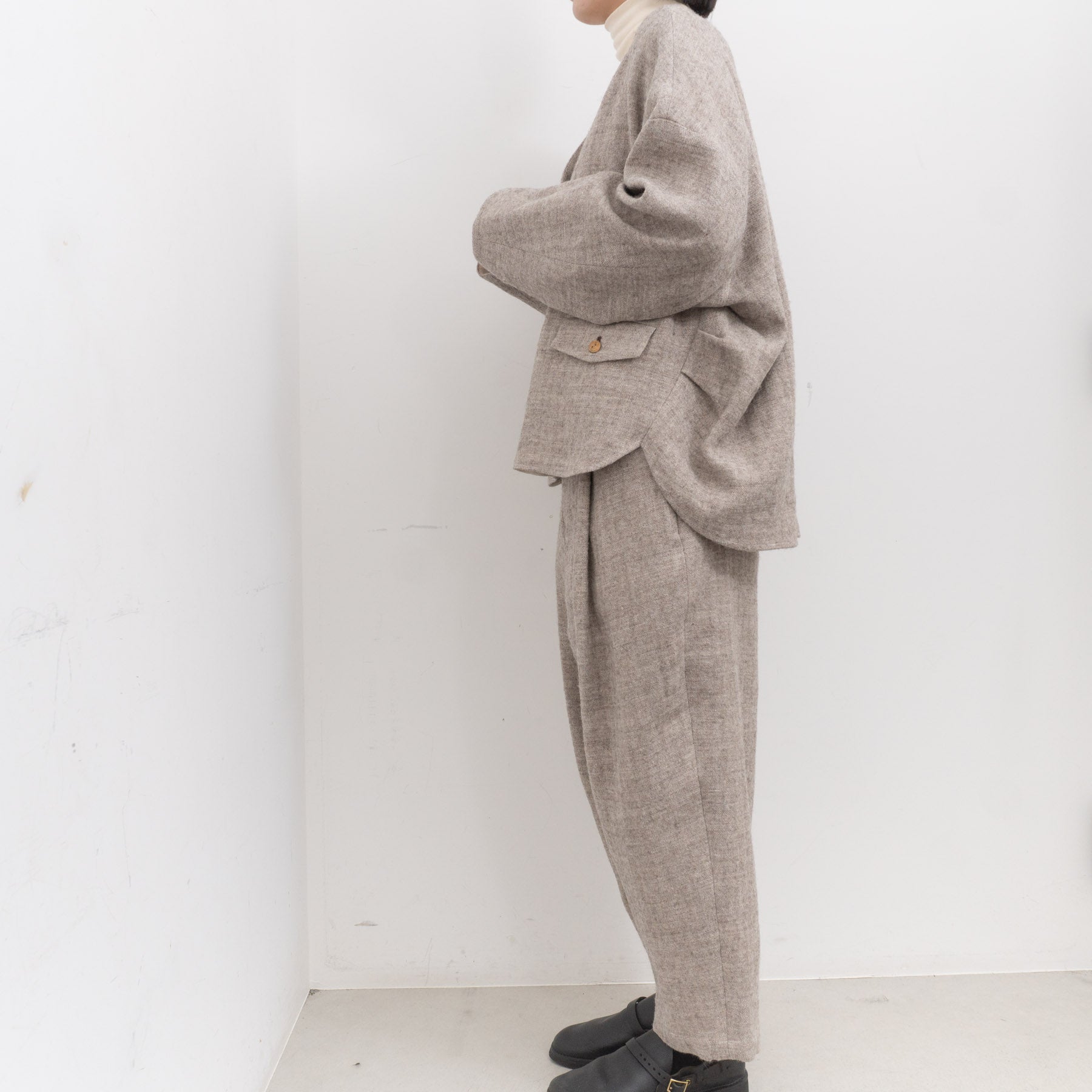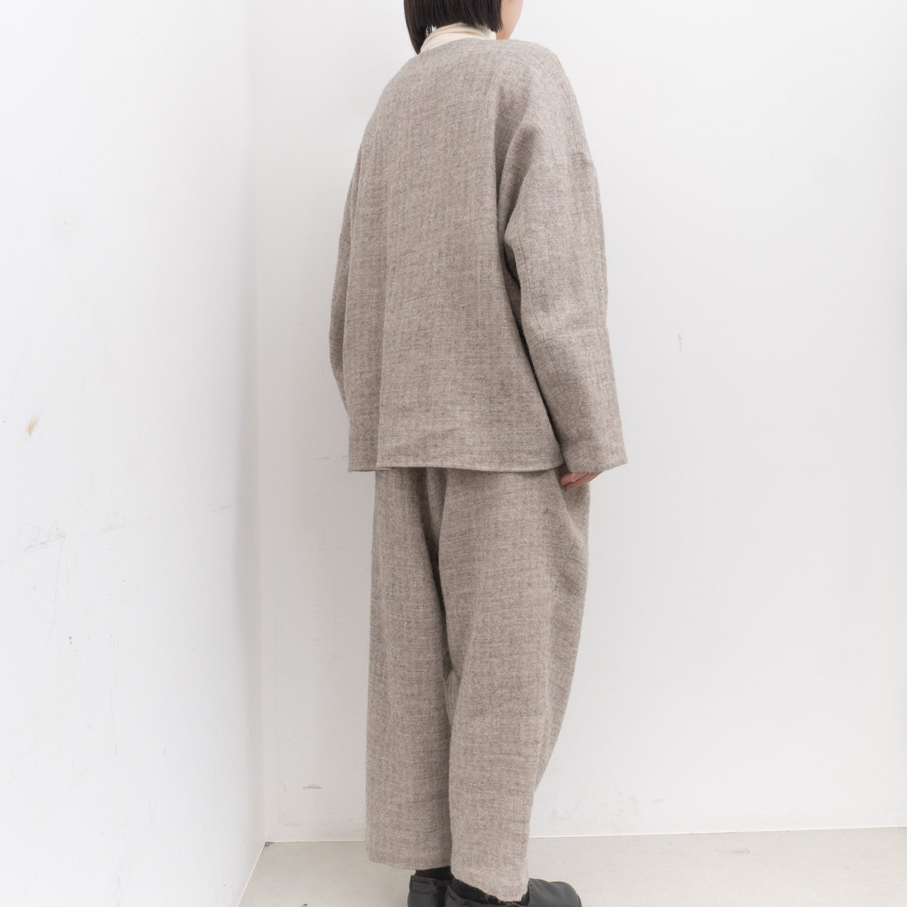・使用している布地は、経糸に1/25番手のノルマンディリネン、緯糸に1/14のシェットランドウールの混紡糸を使用した、良い意味での荒々しさがありつつも、その風合いはやわらかい、シェットランドウールリネンのヘリンボーン生地です